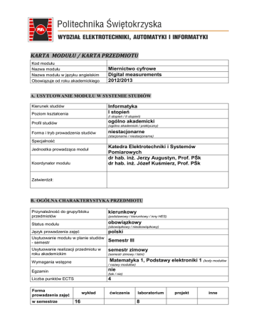 KARTA MODUŁU / KARTA PRZEDMIOTU Kod modułu Nazwa modułu Nazwa modułu w języku angielskim Obowiązuje od roku akademickiego Miernictwo cyfrowe Digital measurements 2012/2013 A. USYTUOWANIE MODUŁU W SYSTEMIE STUDIÓW Kierunek studiów Poziom kształcenia Informatyka I stopień Profil studiów ogólno akademicki Forma i tryb prowadzenia studiów niestacjonarne (I stopień / II stopień) (ogólno akademicki / praktyczny) (stacjonarne / niestacjonarne) Specjalność Jednostka prowadząca moduł Koordynator modułu Katedra Elektrotechniki i Systemów Pomiarowych dr hab. inż. Jerzy Augustyn, Prof. PŚk dr hab. inż. Józef Kuśmierz, Prof. PŚk Zatwierdził: B. OGÓLNA CHARAKTERYSTYKA PRZEDMIOTU Przynależność do grupy/bloku przedmiotów kierunkowy Status modułu obowiązkowy Język prowadzenia zajęć polski Usytuowanie modułu w planie studiów - semestr Semestr III Usytuowanie realizacji przedmiotu w roku akademickim semestr zimowy (podstawowy / kierunkowy / inny HES) (obowiązkowy / nieobowiązkowy) (semestr zimowy / letni) Matematyka 1, Podstawy elektroniki 1 Wymagania wstępne Egzamin nie Liczba punktów ECTS 4 (tak / nie) Forma prowadzenia zajęć w semestrze (kody modułów / nazwy modułów) wykład 16 ćwiczenia laboratorium 8 projekt inne C. EFEKTY KSZTAŁCENIA I METODY SPRAWDZANIA EFEKTÓW KSZTAŁCENIA Zapoznanie studentów z podstawowymi pojęciami metrologii, metodami oceny niepewności wyników pomiaru, cyfrowymi metodami pomiaru podstawowych Cel modułu wielkości elektrycznych, czasu i częstotliwości oraz wykorzystaniem techniki cyfrowego przetwarzania sygnałów w pomiarach. (3-4 linijki) Symbol efektu W_01 W_02 W_03 Efekty kształcenia Forma odniesienie do odniesienie do prowadzenia efektów efektów zajęć kierunkowych obszarowych (w/ć/l/p/inne) ma uporządkowaną wiedzę w zakresie teorii obwodów elektrycznych oraz w zakresie teorii sygnałów i metod ich przetwarzania ma podstawową wiedzę w zakresie metrologii, zna i rozumie metody pomiaru i ekstrakcji podstawowych wielkości charakteryzujących elementy i układy elektroniczne różnego typu, zna metody obliczeniowe i narzędzia informatyczne niezbędne do analizy wyników eksperymentu zna zasady stosowania aparatury pomiarowej oraz właściwości podstawowych przyrządów pomiarowych, zna zasady funkcjonowania systemów pomiarowych potrafi pracować indywidualnie i w zespole; umie oszacować czas potrzebny na realizację zleconego zadania; potrafi opracować i zrealizować harmonogram prac zapewniający dotrzymanie terminów w/l potrafi opracować dokumentację dotyczącą realizacji zadania inżynierskiego i przygotować tekst zawierający omówienie wyników realizacji tego zadania potrafi posłużyć się właściwie dobranymi metodami i przyrządami pomiarowymi umożliwiającymi pomiar podstawowych wielkości charakteryzujących elementy i układy elektryczne i elektroniczne, potrafi zaprojektować i zrealizować prosty system pomiarowy ma świadomość odpowiedzialności za pracę własną oraz gotowość podporządkowania się zasadom pracy w zespole i ponoszenia odpowiedzialności za wspólnie realizowane zadania Ma świadomość przestrzegania zasad etyki K_W05 T1A_W02 w/l K_W05, K_W07, K_W16 w/l K_W02 K_W08 l K_U02 l K_U03 w/l K_U11 T1A_U02 U_01 U_02 U_03 K_01 K_02 T1A_W02 T1A_W03 T1A_W04 T1AW07 T1A_W02 T1A_W03 T1A_W04 T1A_W07 T1A_U03 T1A_U07 T1A_U10 l w/l K_K03 K_K05 T1A_K03 T1A_K04 T1A_K05 Treści kształcenia: 1. Treści kształcenia w zakresie wykładu Nr wykładu 1 Treści kształcenia Podstawowe pojęcia metrologii. Jednostki i układy miar, wzorce wielkości Odniesienie do efektów kształcenia dla modułu W_01,W_02, elektrycznych i czasu, Błąd pomiaru, granice błędu, obliczanie niepewności wyniku pomiaru Obiekt pomiaru, klasyfikacja sygnałów pomiarowych, próbkowanie i kwantyzacja sygnałów. Przetwarzanie sygnałów w dziedzinie czasu, częstotliwości i wartości, Transformata Fouriera, właściwości dyskretnego przekształcenia Fouriera (DFT), algorytm szybkiej transformaty Fouriera (FFT) Przetwarzanie analogowo-cyfrowe: metody przetwarzania, błędy w pomiarach sygnałów dyskretnych. Interfejs analogowo-cyfrowy Kody i sygnały cyfrowe 2 3 4 6 Pomiary czasu, częstotliwości i przesunięcia fazowego, Cyfrowe metody pomiaru napięcia, prądu, mocy i energii Cyfrowe metody pomiaru rezystancji i impedancji 7 Multimetry i oscyloskopy cyfrowe, generatory przebiegów arbitralnych 8 Wirtualne przyrządy pomiarowe, Kolokwium końcowe 5 W_03, U_03 W_02, W_03, U_03 W_02, W_03, U_03 W_02, W_03, U_03 W_02, W_03, U_03 W_02, W_03, U_03 W_02, W_03, U_03 W_02, W_03, U_03, K_02 2. Treści kształcenia w zakresie ćwiczeń Nr zajęć ćwicz. Odniesienie do efektów kształcenia dla modułu Treści kształcenia 3. Treści kształcenia w zakresie zadań laboratoryjnych Nr zajęć lab. Treści kształcenia 1 2 Wprowadzenie Zastosowanie multimetru cyfrowego w pomiarach 3 Cyfrowy pomiar częstotliwości i przesunięcia fazowego 4 Badanie przetwornika analogowo-cyfrowego 5 Zastosowanie oscyloskopu cyfrowego w pomiarach 6 7 Cyfrowe przetwarzanie sygnałów Projekt i wykonanie panelu wirtualnego w środowisku LabWindows do przyrządu HP34401 Podsumowanie wiedzy i umiejętności zdobytych w ramach wykonanych ćwiczeń laboratoryjnych 8 Odniesienie do efektów kształcenia dla modułu W_02 W_02, W_03, U_02, U_03, K_01 W_02, W_03, U_02, U_03, K_01, W_02, W_03, U_02, U_03, K_01, W_02, W_03, U_02, U_03, K_01 W_02, W_03, U_03, K_01 W_02, W_03, U_03, K_01 W_01,W_02,W, U_01, U_02, U_03, ,K_02 4. Charakterystyka zadań projektowych 5. Charakterystyka zadań w ramach innych typów zajęć dydaktycznych Metody sprawdzania efektów kształcenia Symbol efektu W_01 W_02 W_03 U_01 U_02 U_03 K_01 K_02 Metody sprawdzania efektów kształcenia (sposób sprawdzenia, w tym dla umiejętności – odwołanie do konkretnych zadań projektowych, laboratoryjnych, itp.) Sprawozdanie z ćwiczeń laboratoryjnych, kolokwium końco