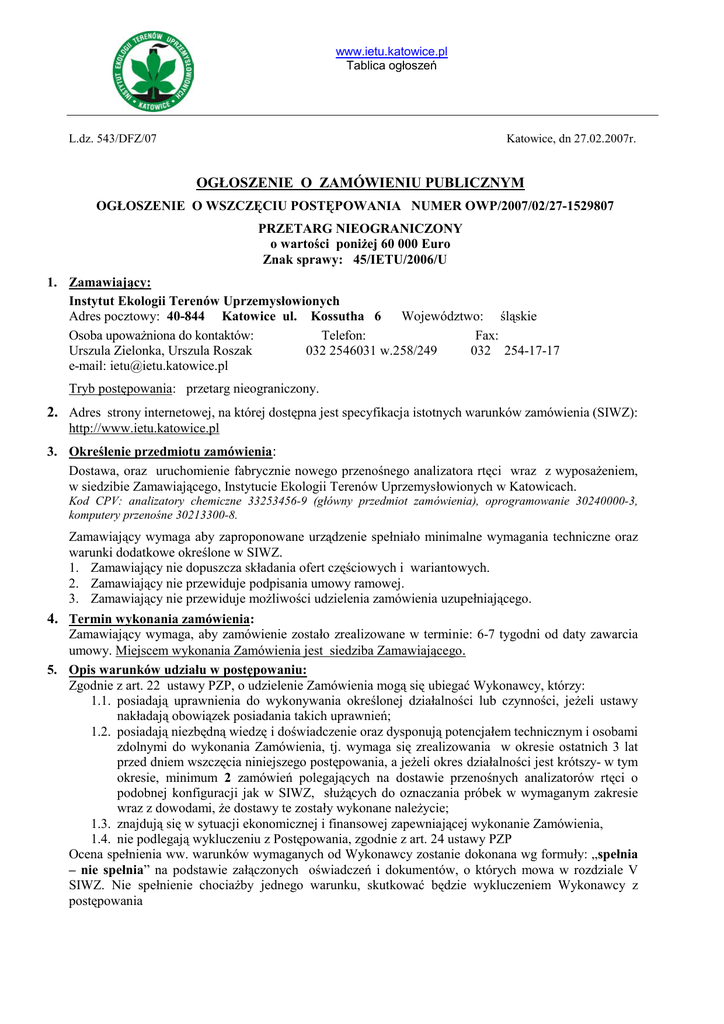 www.ietu.katowice.pl Tablica ogłoszeń L.dz. 543/DFZ/07 Katowice, dn 27.02.2007r. OGŁOSZENIE O ZAMÓWIENIU PUBLICZNYM OGŁOSZENIE O WSZCZĘCIU POSTĘPOWANIA NUMER OWP/2007/02/27-1529807 PRZETARG NIEOGRANICZONY o wartości poniżej 60 000 Euro Znak sprawy: 45/IETU/2006/U 1. Zamawiający: Instytut Ekologii Terenów Uprzemysłowionych Adres pocztowy: 40-844 Katowice ul. Kossutha 6 Województwo: śląskie Osoba upoważniona do kontaktów: Telefon: Fax: Urszula Zielonka, Urszula Roszak 032 2546031 w.258/249 032 254-17-17 e-mail: [email protected] Tryb postępowania: przetarg nieograniczony. 2. Adres strony internetowej, na której dostępna jest specyfikacja istotnych warunków zamówienia (SIWZ): http://www.ietu.katowice.pl 3. Określenie przedmiotu zamówienia: Dostawa, oraz uruchomienie fabrycznie nowego przenośnego analizatora rtęci wraz z wyposażeniem, w siedzibie Zamawiającego, Instytucie Ekologii Terenów Uprzemysłowionych w Katowicach. Kod CPV: analizatory chemiczne 33253456-9 (główny przedmiot zamówienia), oprogramowanie 30240000-3, komputery przenośne 30213300-8. Zamawiający wymaga aby zaproponowane urządzenie spełniało minimalne wymagania techniczne oraz warunki dodatkowe określone w SIWZ. 1. Zamawiający nie dopuszcza składania ofert częściowych i wariantowych. 2. Zamawiający nie przewiduje podpisania umowy ramowej. 3. Zamawiający nie przewiduje możliwości udzielenia zamówienia uzupełniającego. 4. Termin wykonania zamówienia: Zamawiający wymaga, aby zamówienie zostało zrealizowane w terminie: 6-7 tygodni od daty zawarcia umowy. Miejscem wykonania Zamówienia jest siedziba Zamawiającego. 5. Opis warunków udziału w postępowaniu: Zgodnie z art. 22 ustawy PZP, o udzielenie Zamówienia mogą się ubiegać Wykonawcy, którzy: 1.1. posiadają uprawnienia do wykonywania określonej działalności lub czynności, jeżeli ustawy nakładają obowiązek posiadania takich uprawnień; 1.2. posiadają niezbędną wiedzę i doświadczenie oraz dysponują potencjałem technicznym i osobami zdolnymi do wykonania Zamówienia, tj. wymaga się zrealizowania w okresie ostatnich 3 lat przed dniem wszczęcia niniejszego postępowania, a jeżeli okres działalności jest krótszy- w tym okresie, minimum 2 zamówień polegających na dostawie przenośnych analizatorów rtęci o podobnej konfiguracji jak w SIWZ, służących do oznaczania próbek w wymaganym zakresie wraz z dowodami, że dostawy te zostały wykonane należycie; 1.3. znajdują się w sytuacji ekonomicznej i finansowej zapewniającej wykonanie Zamówienia, 1.4. nie podlegają wykluczeniu z Postępowania, zgodnie z art. 24 ustawy PZP Ocena spełnienia ww. warunków wymaganych od Wykonawcy zostanie dokonana wg formuły: „spełnia – nie spełnia” na podstawie załączonych oświadczeń i dokumentów, o których mowa w rozdziale V SIWZ. Nie spełnienie chociażby jednego warunku, skutkować będzie wykluczeniem Wykonawcy z postępowania 6. 7. 8. 9. 10. 11. 12. Wymagane oświadczenia i dokumenty od Wykonawców W celu wykazania spełnienia warunków udziału w Postępowaniu, Wykonawca składa ofertę, obejmującą wypełniony formularz OFERTY (o treści określonej w załączniku nr 1 do SIWZ), wypełniony formularz SPECYFIKACJI TECHNICZNEJ (o treści określonej w załączniku nr 1.1.) oraz uzupełniony WZÓR UMOWY wraz z załącznikiem, parafowany na każdej stronie przez osoby uprawnione (o treści określonej w załączniku nr 3 do SIWZ) , oraz następujące dokumenty: 1. Wykaz dostaw przenośnych analizatorów rtęci, wykonanych przez Wykonawcę w okresie ostatnich trzech lat, a jeżeli okres prowadzenia działalności jest krótszy – w tym okresie, wraz z dowodami, że dostawy te zostały wykonane należycie - Załącznik nr 2. DOŚWIADCZENIE WYKONAWCY. WYKAZ DOSTAW. 2. Oryginał lub kserokopia, poświadczona przez Wykonawcę za zgodność z oryginałem, aktualnego odpisu z właściwego rejestru albo aktualnego zaświadczenie o wpisie do ewidencji działalności gospodarczej wystawionego nie wcześniej niż 6 miesięcy przed upływem terminu składania ofert 3. Oryginał lub kserokopia, poświadczona przez Wykonawcę za zgodność z oryginałem, aktualnego zaświadczenia z Urzędu Skarbowego o nie zaleganiu z opłacaniem podatków, lub zaświadczenia o uzyskaniu przewidzianego prawem zwolnienia, odroczenia lub rozłożenia na raty zaległych płatności lub wstrzymania w całości wykonania decyzji właściwego organu – datowane nie wcześniej niż 3 miesiące przed upływem terminu składania ofert. 4. Oryginał lub kserokopia, poświadczona przez Wykonawcę za zgodność z oryginałem, aktualnego zaświadczenia z ZUS o nie zaleganiu ze składkami na ubezpieczenie społeczne, lub zaświadczenia o uzyskaniu przewidzianego prawem zwolnienia, odroczenia lub rozłożenia na raty zaległych płatności lub wstrzymania w całości wykonania decyzji właściwego organu – datowane nie wcześniej niż 3 miesiące przed upływem terminu składania ofert. Aktualny dokument - odpis z właściwego rejestru albo aktualne zaświadczenie o wpisie do ewidencji działalności gospodarczej, wystawiony nie wcześniej niż 6 miesięcy przed upływem terminu składania ofert. Zamawiający nie wymaga od Wykonawców wniesienia wadium Kryteria oceny ofert i ich znaczenie: 1. Zamawiający wybiera najkorzystniejszą ofertę spośród ofert ważnych złożonych w postępowaniu (tj. Wykonawców niewykluczonych i ofert nieodrzuconych) na podstawie kryteriów oceny ofert określonych w SIWZ. 2. Kryteria oceny ofert i ich znaczenie: Cena brutto – waga 100%. Miejsce i termin składania ofert: 1. Oferty należy dostarczyć do Sekretariatu siedziby Zamawiającego. Adres jak powyżej. 2. Termin składania ofert upływa dnia 09.03.2007 r.. o godz. 1100. Oferty złożone po tym terminie zostaną zwrócone bez otwierania. Decydujące znaczenie dla oceny zachowania powyższego terminu ma data i godzina wpływu oferty do Zamawiająceg