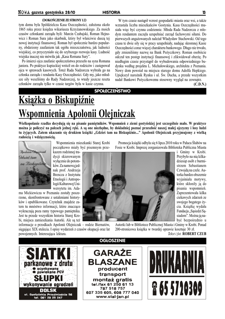NOWA gazeta gostyñska 28/10 (DOKOÑCZENIE ZE STRONY 12) HISTORIA tym domu by³a Spó³dzielcza Kasa Oszczêdnoci, za³o¿ona oko³o 1865 roku przez ksiêdza wikariusza Krzy¿anowskiego. Za moich czasów cz³onkami zarz¹du byli: Marcin Czabajski, Roman Hejnowicz i Roman Sura jako skarbnik, który by³ w³aciwie dusz¹ tej nowej instytucji finansowej. Roman by³ spo³ecznie bardzo popularny, obdarzony zaufaniem tak ogó³u mieszczañstwa, jak ludnoci wiejskiej, co przyczynia³o siê do szybszego rozwoju kasy. Ludnoæ wiejska inaczej nie mówi³a jak Kasa Romana Sury. Po mierci ojca zaufanie spo³eczeñstwa przesz³o na syna Romana juniora. Po praktyce kupieckiej wróci³ on do rodziców i zastêpowa³ ojca w sprawach kasowych. Tote¿ Rada Nadzorcza wybra³a go na cz³onka zarz¹du i rendanta Kasy Oszczêdnoci. Gdy my, jako m³odsze si³y weszlimy do Rady Nadzorczej, to wtedy jeszcze reszta cz³onków zarz¹du tylko w czasie targów by³a w kasie czynna. 13 W tym czasie nast¹pi³ wzrost gospodarki miasta oraz wsi, a tak¿e wzrasta³a liczba mieszkañców Gostynia. Kasa Oszczêdnoci musia³a wiêc byæ czynna codziennie. M³oda Rada Nadzorcza z m³odym rendantem zaczê³a uzupe³niaæ zarz¹d fachowymi si³ami. Do pierwszych anga¿owanych nale¿a³ W³adys³aw Stachowski. Od tego czasu te dwie si³y siê w pracy uzupe³nia³y, nadaj¹c skromnej Kasie Oszczêdnoci coraz wiêcej charakteru bankowego. D³ugo nie trwa³o, gdy zmienilimy nazwê na Bank Po¿yczkowy. Roman osobicie odczu³ ten postêp instytucji finansowej i zlikwidowa³ ober¿ê. Po nied³ugim czasie przyst¹pi³ do wybudowania odpowiedniego budynku wed³ug projektu L. Micha³owskiego, architekta z Poznania. Nowy dom powsta³ na miejscu starego domu Adolfa Hepkiego. Upiêkszy³ naro¿nik Rynku i ul. w. Ducha, a przede wszystkim nada³ Bankowi Po¿yczkowemu stosowny wygl¹d na zewn¹trz. (C.D.N.) SPO£ECZEÑSTWO Ksi¹¿ka o Biskupinie Wspomnienia Apolonii Olejniczak Wielkopolanie rzadko decyduj¹ siê na pisanie pamiêtników. Wspomnieñ z ziemi gostyñskiej jest szczególnie ma³o. W praktyce mo¿na je policzyæ na palcach jednej rêki. A s¹ one niezbêdne, by dok³adniej poznaæ przesz³oæ naszej ma³ej ojczyzny i losy ludzi tu ¿yj¹cych. Zatem ukazanie siê drukiem ksi¹¿ki Gdzie tam na Biskupinie... Apolonii Olejniczak przyjmujemy z wielk¹ radoci¹ i wdziêcznoci¹. Wspomnienia mieszkanki Starej Krobi Promocja ksi¹¿ki odby³a siê 6 lipca 2010 roku w Pa³acu lubów na pocz¹tkowo mia³y byæ pisemnym prze- Fosie w Krobi. Imprezê zorganizowa³a Biblioteka Publiczna Miasta kazem rodzinnej trai Gminy w Krobi. dycji skierowanym Przyby³o na ni¹ kilkawy³¹cznie do potomdziesi¹t osób z burmików. Za namow¹ jedstrzem Sebastianem nak prof. Andrzeja Czwojd¹ na czele. AuBrencza z Instytutu torka bardzo obszernie Etnologii i Antropowyjania³a motywy, logii Kulturowej Uniktóre sk³oni³y j¹ do wersytetu im. Adapisania wspomnieñ. ma Mickiewicza w Poznaniu zosta³y poszeZaprezentowa³a kilka rzone, skonfrontowane z ustaleniami historyciekawych zdarzeñ ze ków i opublikowane. Czytelnik znajdzie zaswojego bogatego ¿ytem tu mnóstwo informacji, które znacz¹co cia. Ksi¹¿kê wyda³a wykraczaj¹ poza ramy typowego pamiêtnika. Fundacja S¹siedzi S¹Jest tu przede wszystkim historia Starej Krosiadom. Mo¿na j¹ nabi, miejsca zamieszkania Autorki. Ale s¹ te¿ byæ bezporednio u informacje o przodkach Apolonii Olejniczak rodzie Biernatów, Autorki lub w Bibliotece Publicznej Miasta i Gminy w Krobi. Ponad siêgaj¹ce XIX stulecia. I opisy wydarzeñ z czasów okupacji oraz lat 200-stronicowa ksi¹¿ka w twardej oprawie kosztuje 30 z³. powojennych. Interesuj¹ca lektura. Tekst i fot. ROBERT CZUB OG£OSZENIE