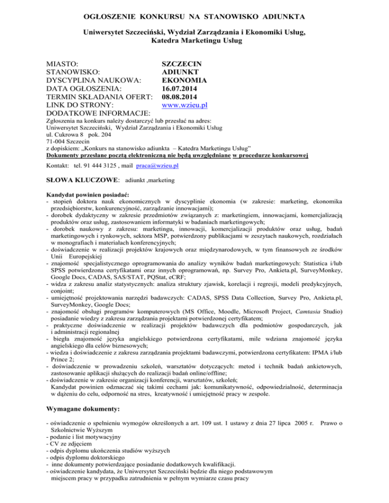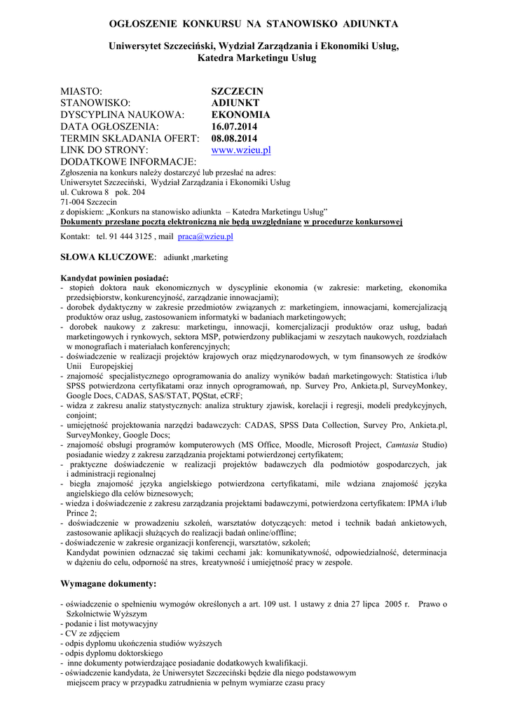 OGŁOSZENIE KONKURSU NA STANOWISKO ADIUNKTA Uniwersytet Szczeciński, Wydział Zarządzania i Ekonomiki Usług, Katedra Marketingu Usług MIASTO: STANOWISKO: DYSCYPLINA NAUKOWA: DATA OGŁOSZENIA: TERMIN SKŁADANIA OFERT: LINK DO STRONY: DODATKOWE INFORMACJE: SZCZECIN ADIUNKT EKONOMIA 16.07.2014 08.08.2014 www.wzieu.pl Zgłoszenia na konkurs należy dostarczyć lub przesłać na adres: Uniwersytet Szczeciński, Wydział Zarządzania i Ekonomiki Usług ul. Cukrowa 8 pok. 204 71-004 Szczecin z dopiskiem: „Konkurs na stanowisko adiunkta – Katedra Marketingu Usług” Dokumenty przesłane pocztą elektroniczną nie będą uwzględniane w procedurze konkursowej Kontakt: tel. 91 444 3125 , mail [email protected] SŁOWA KLUCZOWE: adiunkt ,marketing Kandydat powinien posiadać: - stopień doktora nauk ekonomicznych w dyscyplinie ekonomia (w zakresie: marketing, ekonomika przedsiębiorstw, konkurencyjność, zarządzanie innowacjami); - dorobek dydaktyczny w zakresie przedmiotów związanych z: marketingiem, innowacjami, komercjalizacją produktów oraz usług, zastosowaniem informatyki w badaniach marketingowych; - dorobek naukowy z zakresu: marketingu, innowacji, komercjalizacji produktów oraz usług, badań marketingowych i rynkowych, sektora MSP, potwierdzony publikacjami w zeszytach naukowych, rozdziałach w monografiach i materiałach konferencyjnych; - doświadczenie w realizacji projektów krajowych oraz międzynarodowych, w tym finansowych ze środków Unii Europejskiej - znajomość specjalistycznego oprogramowania do analizy wyników badań marketingowych: Statistica i/lub SPSS potwierdzona certyfikatami oraz innych oprogramowań, np. Survey Pro, Ankieta.pl, SurveyMonkey, Google Docs, CADAS, SAS/STAT, PQStat, eCRF; - widza z zakresu analiz statystycznych: analiza struktury zjawisk, korelacji i regresji, modeli predykcyjnych, conjoint; - umiejętność projektowania narzędzi badawczych: CADAS, SPSS Data Collection, Survey Pro, Ankieta.pl, SurveyMonkey, Google Docs; - znajomość obsługi programów komputerowych (MS Office, Moodle, Microsoft Project, Camtasia Studio) posiadanie wiedzy z zakresu zarządzania projektami potwierdzonej certyfikatem; - praktyczne doświadczenie w realizacji projektów badawczych dla podmiotów gospodarczych, jak i administracji regionalnej - biegła znajomość języka angielskiego potwierdzona certyfikatami, mile wdziana znajomość języka angielskiego dla celów biznesowych; - wiedza i doświadczenie z zakresu zarządzania projektami badawczymi, potwierdzona certyfikatem: IPMA i/lub Prince 2; - doświadczenie w prowadzeniu szkoleń, warsztatów dotyczących: metod i technik badań ankietowych, zastosowanie aplikacji służących do realizacji badań online/offline; - doświadczenie w zakresie organizacji konferencji, warsztatów, szkoleń; Kandydat powinien odznaczać się takimi cechami jak: komunikatywność, odpowiedzialność, determinacja w dążeniu do celu, odporność na stres, kreatywność i umiejętność pracy w zespole. Wymagane dokumenty: - oświadczenie o spełnieniu wymogów określonych a art. 109 ust. 1 ustawy z dnia 27 lipca 2005 r. Szkolnictwie Wyższym - podanie i list motywacyjny - CV ze zdjęciem - odpis dyplomu ukończenia studiów wyższych - odpis dyplomu doktorskiego - inne dokumenty potwierdzające posiadanie dodatkowych kwalifikacji. - oświadczenie kandydata, że Uniwersytet Szczeciński będzie dla niego podstawowym miejscem pracy w przypadku zatrudnienia w pełnym wymiarze czasu pracy Prawo o