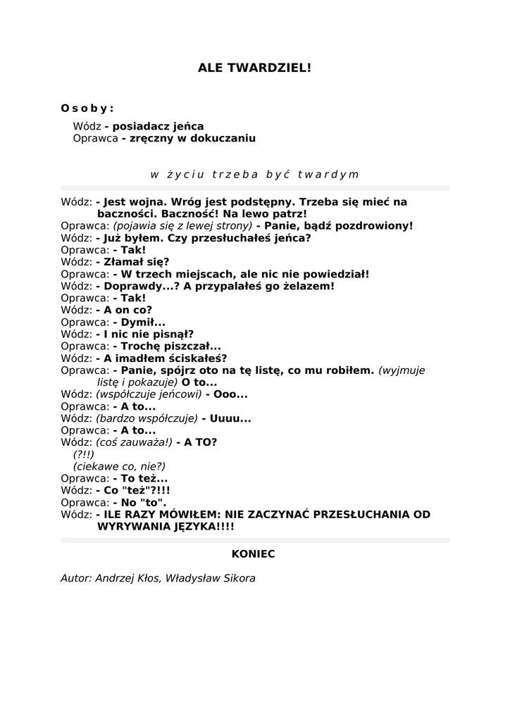 ALE TWARDZIEL! Osoby: Wódz - posiadacz jeńca Oprawca - zręczny w dokuczaniu w życiu trzeba być twardym Wódz: - Jest wojna. Wróg jest podstępny. Trzeba się mieć na baczności. Baczność! Na lewo patrz! Oprawca: (pojawia się z lewej strony) - Panie, bądź pozdrowiony! Wódz: - Już byłem. Czy przesłuchałeś jeńca? Oprawca: - Tak! Wódz: - Złamał się? Oprawca: - W trzech miejscach, ale nic nie powiedział! Wódz: - Doprawdy...? A przypalałeś go żelazem! Oprawca: - Tak! Wódz: - A on co? Oprawca: - Dymił... Wódz: - I nic nie pisnął? Oprawca: - Trochę piszczał... Wódz: - A imadłem ściskałeś? Oprawca: - Panie, spójrz oto na tę listę, co mu robiłem. (wyjmuje listę i pokazuje) O to... Wódz: (współczuje jeńcowi) - Ooo... Oprawca: - A to... Wódz: (bardzo współczuje) - Uuuu... Oprawca: - A to... Wódz: (coś zauważa!) - A TO? (?!!) (ciekawe co, nie?) Oprawca: - To też... Wódz: - Co "też"?!!! Oprawca: - No "to". Wódz: - ILE RAZY MÓWIŁEM: NIE ZACZYNAĆ PRZESŁUCHANIA OD WYRYWANIA JĘZYKA!!!! KONIEC Autor: Andrzej Kłos, Władysław Sikora