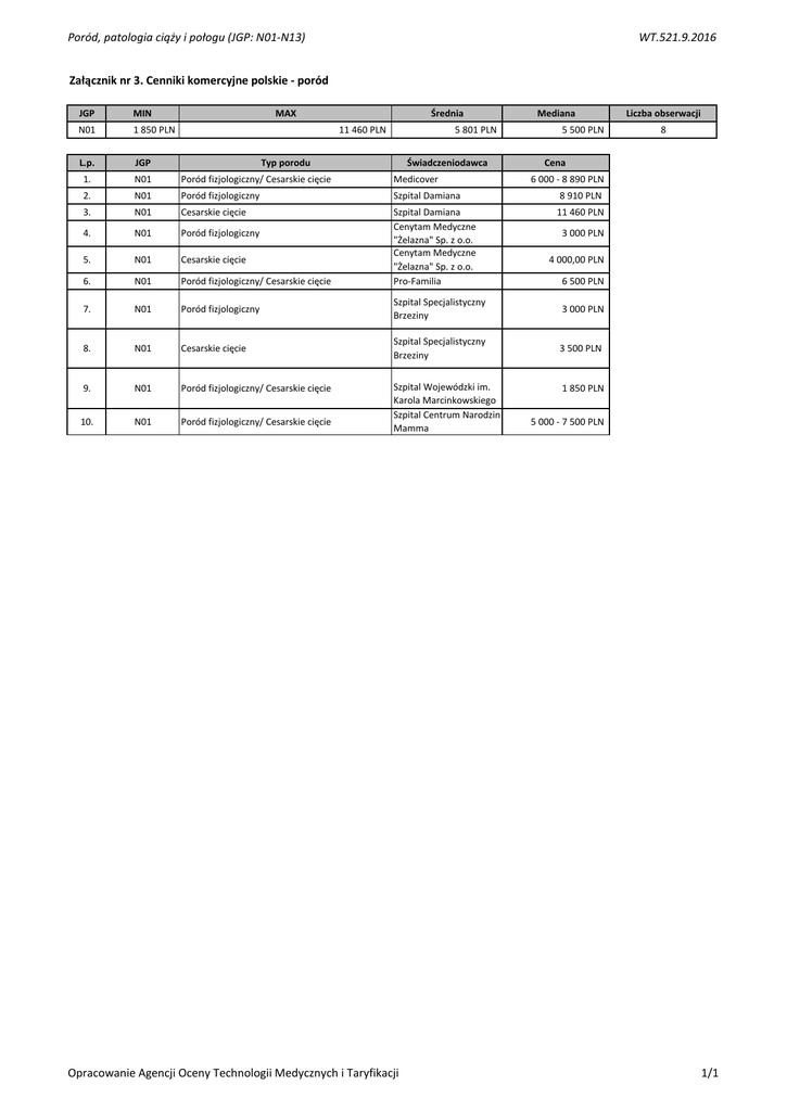 Poród, patologia ciąży i połogu (JGP: N01-N13) WT.521.9.2016 Załącznik nr 3. Cenniki komercyjne polskie - poród JGP MIN N01 1 850 PLN MAX Średnia 11 460 PLN 5 801 PLN Typ porodu Świadczeniodawca Mediana 5 500 PLN L.p. JGP 1. N01 Poród fizjologiczny/ Cesarskie cięcie Medicover 2. N01 Poród fizjologiczny Szpital Damiana 8 910 PLN 3. N01 Cesarskie cięcie 11 460 PLN 4. N01 Poród fizjologiczny 5. N01 Cesarskie cięcie 6. N01 Poród fizjologiczny/ Cesarskie cięcie Szpital Damiana Cenytam Medyczne "Żelazna" Sp. z o.o. Cenytam Medyczne "Żelazna" Sp. z o.o. Pro-Familia 7. N01 Poród fizjologiczny Szpital Specjalistyczny Brzeziny 3 000 PLN 8. N01 Cesarskie cięcie Szpital Specjalistyczny Brzeziny 3 500 PLN 9. N01 Poród fizjologiczny/ Cesarskie cięcie 10. N01 Poród fizjologiczny/ Cesarskie cięcie Szpital Wojewódzki im. Karola Marcinkowskiego Szpital Centrum Narodzin Mamma Opracowanie Agencji Oceny Technologii Medycznych i Taryfikacji Liczba obserwacji 8 Cena 6 000 - 8 890 PLN 3 000 PLN 4 000,00 PLN 6 500 PLN 1 850 PLN 5 000 - 7 500 PLN 1/1