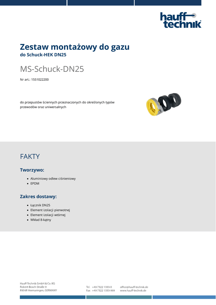 Zestaw montażowy do gazu do Schuck-HEK DN25 MS-Schuck-DN25 Nr art.: 1551022200 do przepustów ściennych przeznaczonych do określonych typów przewodów oraz uniwersalnych FAKTY Tworzywo: Aluminiowy odlew ciśnieniowy EPDM Zakres dostawy: Łącznik DN25 Element izolacji pierwotnej Element izolacji wtórnej Wkład 8-kątny