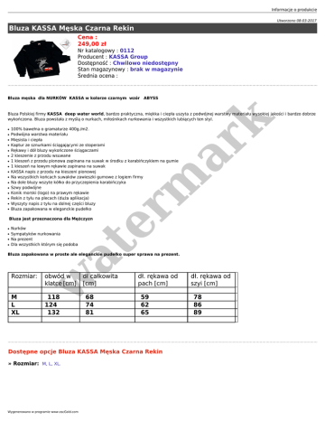 Informacje o produkcie Utworzono 08-03-2017 Bluza KASSA Męska Czarna Rekin Cena : 249,00 zł Nr katalogowy : 0112 Producent : KASSA Group Dostępność : Chwilowo niedostępny Stan magazynowy : brak w magazynie Średnia ocena : Bluza męska dla NURKÓW KASSA w kolorze czarnym wzór ABYSS ● ● ● ● ● ● ● ● ● ● ● ● ● ● ● ● er m ar k Bluza Polskiej firmy KASSA deep water world, bardzo praktyczna, miękka i ciepła uszyta z podwójnej warstwy materiału wysokiej jakości i bardzo dobrze wykończona. Bluza powstała z myślą o nurkach, miłośnikach nurkowania i wszystkich lubiących ten styl. 100% bawełna o gramaturze 400g./m2. Podwójna warstwa materiału Mięsista i ciepła Kaptur ze sznurkami ściągającymi ze stoperami Rękawy i dół bluzy wykończone ściągaczami 2 kieszenie z przodu wsuwane 1 kieszeń z przodu pionowa zapinana na suwak w środku z karabińczykiem na gumie 1 kieszeń na lewym rękawie zapinana na suwak KASSA napis z przodu na kieszeni pionowej Na wszystkich końcach suwaków zawieszki gumowe z logiem firmy Na dole bluzy wszyte kółko do przyczepienia karabińczyka Szwy podwójne Konik morski (logo) na prawym rękawie Rekin z tyłu na plecach (duża aplikacja) Wyszyty napis z tyłu na dolnej części bluzy Bluza zapakowana w eleganckie pudełko Bluza jest przeznaczona dla Mężczyzn ● ● ● Nurków Sympatyków nurkowania Na prezent Dla wszystkich którym się podoba at ● Bluza zapakowana w proste ale eleganckie pudełko super sprawa na prezent. obwód w dł całkowita klatce [cm] [cm] M L XL 118 124 132 w Rozmiar: 68 74 81 dł. rękawa od pach [cm] 59 62 65 Dostępne opcje Bluza KASSA Męska Czarna Rekin » Rozmiar: M, L, XL. Wygenerowano w programie www.oscGold.com dł. rękawa od szyi [cm] 78 86 89