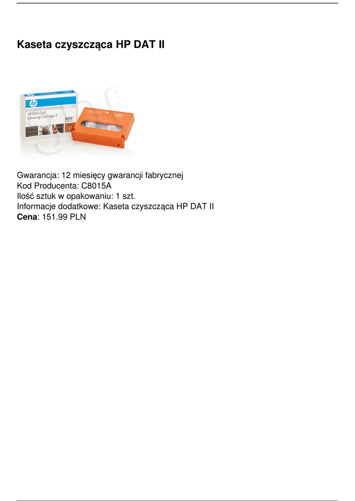 Kaseta czyszcząca HP DAT II Gwarancja: 12 miesięcy gwarancji fabrycznej Kod Producenta: C8015A Ilość sztuk w opakowaniu: 1 szt. Informacje dodatkowe: Kaseta czyszcząca HP DAT II Cena: 151.99 PLN Powered by TCPDF (www.tcpdf.org)