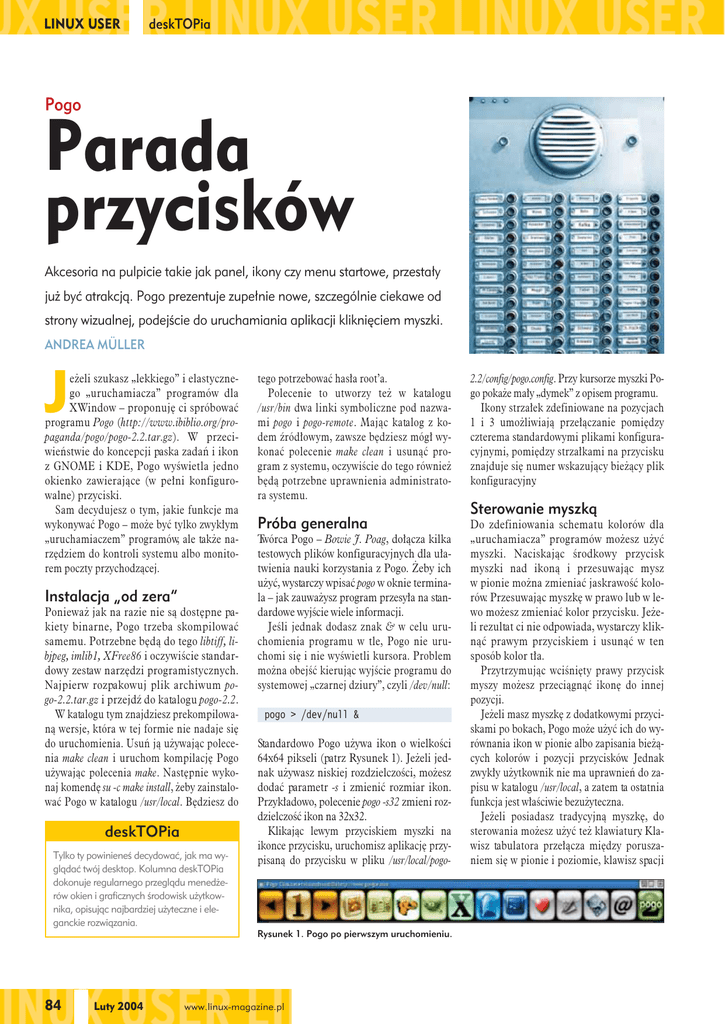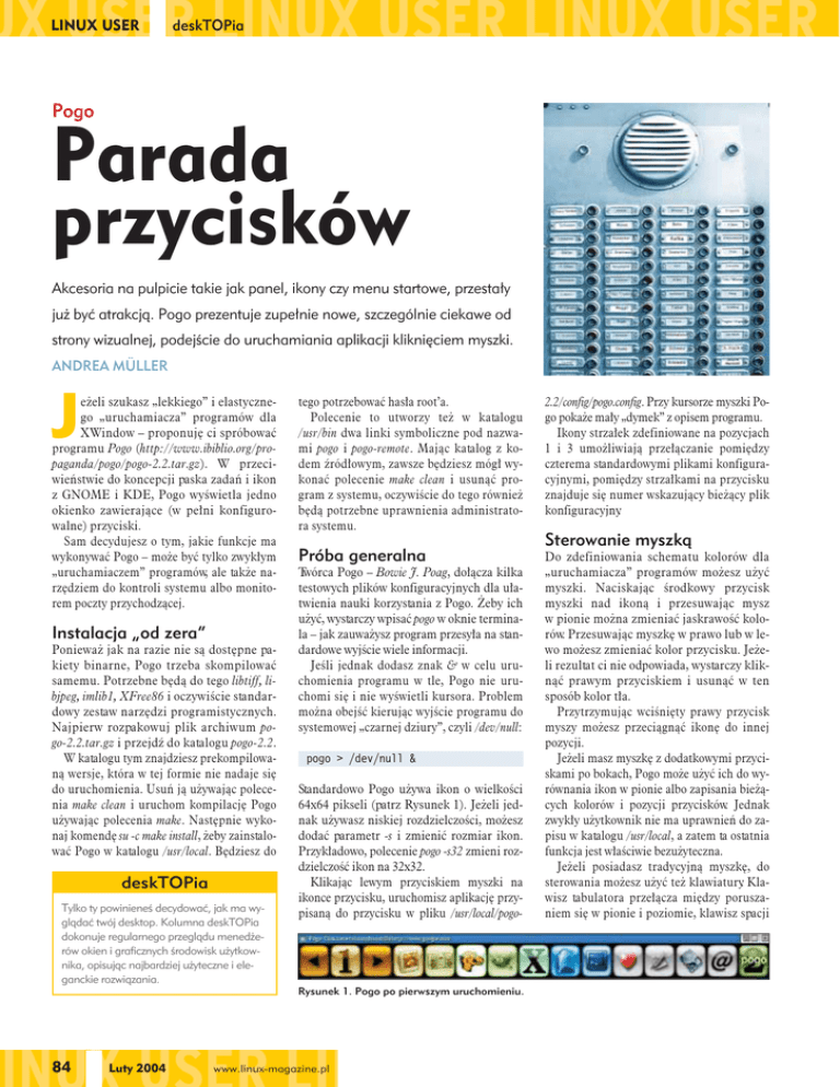 LINUX USER deskTOPia Pogo Parada przycisków Akcesoria na pulpicie takie jak panel, ikony czy menu startowe, przestały już być atrakcją. Pogo prezentuje zupełnie nowe, szczególnie ciekawe od strony wizualnej, podejście do uruchamiania aplikacji kliknięciem myszki. ANDREA MÜLLER J eżeli szukasz „lekkiego” i elastycznego „uruchamiacza” programów dla XWindow – proponuję ci spróbować programu Pogo (http://www.ibiblio.org/propaganda/pogo/pogo-2.2.tar.gz). W przeciwieństwie do koncepcji paska zadań i ikon z GNOME i KDE, Pogo wyświetla jedno okienko zawierające (w pełni konfigurowalne) przyciski. Sam decydujesz o tym, jakie funkcje ma wykonywać Pogo – może być tylko zwykłym „uruchamiaczem” programów, ale także narzędziem do kontroli systemu albo monitorem poczty przychodzącej. Instalacja „od zera” Ponieważ jak na razie nie są dostępne pakiety binarne, Pogo trzeba skompilować samemu. Potrzebne będą do tego libtiff, libjpeg, imlib1, XFree86 i oczywiście standardowy zestaw narzędzi programistycznych. Najpierw rozpakowuj plik archiwum pogo-2.2.tar.gz i przejdź do katalogu pogo-2.2. W katalogu tym znajdziesz prekompilowaną wersje, która w tej formie nie nadaje się do uruchomienia. Usuń ją używając polecenia make clean i uruchom kompilację Pogo używając polecenia make. Następnie wykonaj komendę su -c make install, żeby zainstalować Pogo w katalogu /usr/local. Będziesz do deskTOPia Tylko ty powinieneś decydować, jak ma wyglądać twój desktop. Kolumna deskTOPia dokonuje regularnego przeglądu menedżerów okien i graficznych środowisk użytkownika, opisując najbardziej użyteczne i eleganckie rozwiązania. tego potrzebować hasła root’a. Polecenie to utworzy też w katalogu /usr/bin dwa linki symboliczne pod nazwami pogo i pogo-remote. Mając katalog z kodem źródłowym, zawsze będziesz mógł wykonać polecenie make clean i usunąć program z systemu, oczywiście do tego również będą potrzebne uprawnienia administratora systemu. Próba generalna Twórca Pogo – Bowie J. Poag, dołącza kilka testowych plików konfiguracyjnych dla ułatwienia nauki korzystania z Pogo. Żeby ich użyć, wystarczy wpisać pogo w oknie terminala – jak zauważysz program przesyła na standardowe wyjście wiele informacji. Jeśli jednak dodasz znak & w celu uruchomienia programu w tle, Pogo nie uruchomi się i nie wyświetli kursora. Problem można obejść kierując wyjście programu do systemowej „czarnej dziury”, czyli /dev/null: pogo > /dev/null & Standardowo Pogo używa ikon o wielkości 64x64 pikseli (patrz Rysunek 1). Jeżeli jednak używasz niskiej rozdzielczości, możesz dodać parametr -s i zmienić rozmiar ikon. Przykładowo, polecenie pogo -s32 zmieni rozdzielczość ikon na 32x32. Klikając lewym przyciskiem myszki na ikonce przycisku, uruchomisz aplikację przypisaną do przycisku w pliku /usr/local/pogo- Rysunek 1. Pogo po pierwszym uruchomieniu. 84 Luty 2004 www.linux-magazine.pl 2.2/config/pogo.config. Przy kursorze myszki Pogo pokaże mały „dymek” z opisem programu. Ikony strzałek zdefiniowane na pozycjach 1 i 3 umożliwiają przełączanie pomiędzy czterema standardowymi plikami konfiguracyjnymi, pomiędzy strzałkami na przycisku znajduje się numer wskazujący bieżący plik konfiguracyjny. Sterowanie myszką Do zdefiniowania schematu kolorów dla „uruchamiacza” programów możesz użyć myszki. Naciskając środkowy przycisk myszki nad ikoną i przesuwając mysz w pionie można zmieniać jaskrawość kolorów. Przesuwając myszkę w prawo lub w lewo możesz zmieniać kolor przycisku. Jeżeli rezultat ci nie odpowiada, wystarczy kliknąć prawym przyciskiem i usunąć w ten sposób kolor tła. Przytrzymując wciśnięty prawy przycisk myszy możesz przeciągnąć ikonę do innej pozycji. Jeżeli masz myszkę z dodatkowymi przyciskami po bokach, Pogo może użyć ich do wyrównania ikon w pionie albo zapisania bieżących kolorów i pozycji przycisków. Jednak zwykły użytkownik nie ma uprawnień do zapisu w katalogu /usr/local, a zatem ta ostatnia funkcja jest właściwie bezużyteczna. Jeżeli posiadasz tradycyjną myszkę, do sterowania możesz użyć też klawiatury. Klawisz tabulatora przełącza między poruszaniem się w pionie i poziomie, klawisz spacji deskTOPia miejsca w lewo (-b4). Plik /usr/local/pogo2.2/README opisuje dokładnie dostępne parametry i ich składnię. Aby nie powtarzać pisania całych wierszy z poleceniami, można oczywiście przypisać wywołania pogo-remote do przycisków Pogo. 0 0 /usr/local/pogo-2.2/images/pogo-email2.jpg 7 62 180 sylpheed /usr/local/pogo-2.2/images/pogo-mozilla.jpg 248 231 44 mozilla /usr/local/pogo-2.2/images/pogo-console.jpg 235 3 30 xterm -e top zapisuje ustawienia. Uszyte na miarę Jeśli chcesz stworzyć własny pasek przycisku, utwórz w swoim katalogu domowym plik i nadaj mu nazwę, której chcesz używać na pasku. Będziesz go potrzebować do przechowywania w nim konfiguracji Pogo. Pierwszy wpis w pierwszym wierszu decyduje, czy pasek będzie wyświetlany pionowo (1) czy poziomo (0). Następnie można wskazać, gdzie Pogo ma umieścić pasek ikon (Listing 1); pamiętaj, że lewy górny narożnik ekranu jest uważany za początek układu współrzędnych. Kolejne wiersze definicje w formacie: ID icon color_in_RGBU _notation program definiują pojedyncze ikony. Parametr ID oznacza unikalny numer dla przycisku. Zamień parametr icon na nazwę pliku graficznego dla ikony. Możesz użyć w tym celu jedRysunek 2. nej z 200 ikon dostarczanych Pogo z Pogo – są one podczas inw konfigustalacji kopiowane do kataloracji z Ligu /usr/local/pogo-2.2/images. stingu 1. Dalej przy użyciu wartości RGB definiowany jest kolor przycisku. Na przykład kolor czerwony to 255 0 0. Jeżeli nie jesteś pewien tych wartości, możesz użyć do określenia koloru programu GIMP, kcolorchooser lub innej aplikacji graficznej. Wiersz kończy polecenie, które zostanie p