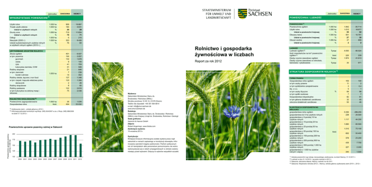 Jednostka Saksonia Jednostka Niemcy 5) Wykorzystanie powierzchni Użytki rolne Trwałe użytki zielone Udział w użytkach rolnych Grunty orne Udział w użytkach rolnych Odłogi Nieużytki (2005 r.) Udział wydzierżawionych użytków rolnych w użytkach rolnych ogółem (2010 r.) 1.000 ha 1.000 ha % 1.000 ha % 1.000 ha 1.000 ha % 908 184 20 719 79 6 353 76 1.000 ha 401 164 132 9 41 31 21 7 14 137 133 2 8 132 75 Powierzchnia ogółem Użytki rolne Udział w powierzchni krajowej Obszary leśne Udział w powierzchni krajowej Obszar wodne Udział w powierzchni krajowej Rolnictwo i gospodarka żywnościowa w liczbach 6.527 3.057 1.678 145 709 526 646 238 402 1.348 1.306 26 82 2.815 2.038 Rolnictwo ekologiczne 6) Powierzchnie zagospodarowane Gospodarstwa rolne 5) 6) 1.000 ha Ilość 36 494 1.034 23.032 Użytkowanie ziemi – ankieta główna w 2012 r. Informacje jednostek kontrolnych wg Rozp. (WE) 834/2007 w zw. z Rozp. (WE) 889/2008 na dzień 31.12.2012 r. Powierzchnie uprawne pszenicy ozimej w Saksonii Powierzchnie uprawne pszenicy ozimej (1.000 ha) Niemcy Powierzchnia 1) 16.667 4.631 28 11.834 71 215 9.426 60 Użytkowanie gruntów rolnych Zboża ogółem w tym pszenica jęczmień owies żyto kukurydza ziarnista, CCM Rośliny okopowe w tym ziemniaki buraki cukrowe Rośliny oleiste, łącznie z non food w tym rzepak i kapusta właściwa polna słonecznik Rośliny strączkowe Rośliny pastewne w tym kukurydza na zieloną masę i silosowa Saksonia Powierzchnia i ludność Raport za rok 2012 125 100 2000 2001 2002 2003 2004 2005 2006 2007 2008 2009 2010 2011 2012 35.714 18.677 52 10.781 30 858 2 Tysiąc 4.050 80.524 Ilość Tysiąc 220 1.974 229 41.613 Tysiąc 30 671 100 11 3 5 89 7 82 32 50 100 2 0,4 1 98 7 91 45 46 5.536 238 288.200 25.500 1.117 44.200 1.080 60.500 1.015 73.100 602 50.400 578 23.200 Ludność Ludność ogółem 2) Ilość mieszkańców na km² powierzchni ogółem 3) Osoby czynne zawodowo ogółem Osoby czynne zawodowo w rolnictwie, leśnictwie i rybołówstwie 4) Forma prawna Wydawca: Saksońskie Ministerstwo Stanu ds. Środowiska i Rolnictwa (SMUL) Skrytka pocztowa 10 05 10, 01076 Drezno Telefon dla obywateli: +49 351 564 6814 e-mail: [email protected] www.smul.sachsen.de Redakcja: Saksońskie Ministerstwo Stanu ds. Środowiska i Rolnictwa (SMUL) oraz Krajowy Urząd ds. Środowiska, Rolnictwa i Geologii Szata graficzna: Heimrich & Hannot GmbH Zdjęcia: Robert Angermayr, www.fotolia.com Zamknięcie wydania: 19 września 2013 r. Dystrybucja: Niniejsza broszura informacyjna została wydana przez rząd saksoński w ramach zapisanego w konstytucji obowiązku informowania szerokich kręgów publiczności. Partiom politycznym lub ich kandydatom albo personelowi pomocniczemu nie wolno wykorzystywać jej w celach propagandowych w okresie sześciu miesięcy przed wyborami. Dotyczy to wyborów wszystkich szczebli. 150 1.842 1.010 55 501 27 37 2 Struktura gospodarstw rolnych 200 175 1.000 ha 1.000 ha % 1.000 ha % 1.000 ha % Gospodarstwa rolne ogółem w tym osoby prawne w tym spółdzielnie zarejestrowane Sp. z o.o. w tym osoby fizyczne w tym spółki osobowe Gospodarstwa indywidualne w tym główna działalność zarobkowa uboczna działalność zarobkowa % Klasyfikacja gospodarstw wg wielkości gospodarstwa rolne ogółem gospodarstwa do 5 ha użytków rolnych gospodarstwa o 5-poniżej 10 ha użytków rolnych gospodarstwa o 10-poniżej 20 ha użytków rolnych gospodarstwa o 20-poniżej 50 ha użytków rolnych gospodarstwa o 50-poniżej 100 ha użytków rolnych gospodarstwa o 100-poniżej 200 ha użytków rolnych gospodarstwa o 200-poniżej 500 ha użytków rolnych gospodarstwa o 500-poniżej 1.000 ha użytków rolnych gospodarstwa o 1.000 ha użytków rolnych i więcej 1) Ankieta Ilość 439 7.700 227 2.200 240 1.500 powierzchni wg rodzaju rzeczywistego użytkowania, na dzień Niemcy: 31.12.2011 r. w dniu 31.12.2012 r. wg spisu ludności w 2011 r. obliczenia własne, Niemcy: wartość na rok 2011 4)Saksonia: Wspieranie rolnictwa 2012 r., Niemcy: ankieta główna użytkowania ziemi 2010 r., 2012 r. 2) Ludność 3) Saksonia: Niemcy Bydło ogółem w tym krowy mleczne Świnie ogółem w tym tuczniki świnie domowe Owce Kury ogółem Zwierzęta nieparzystokopytne (konie, osły, muły i in. w gospodarstwach rolnych) Produkcja jaj w gospodarstwie Nieśność jednej kury 1.000 ha 1.000 t 1.000 ha 1.000 t 4 59 0,04 4 115 3.635 1,3 133 1.000ha 1.000 t 4 105 65 1.256 1.000ha hl/ha 1.000 hl 0,5 43 21 100 91 9.081 9.177 8.237 928 306 Ilość 5.352 89 1.347 166 2.490 22 13 3 12 27 19.721 241 203 93 212 572 554.116 5.966 148.933 721 40.462 557 15.210 395 3.351 123 851 9.752 24.221 4.145 9.355 20.373 11 21 12) 10 Obroty ogółem Żywność i pasze w tym ubój i przetwórstwo mięsne Produkcja pieczywa (bez pieczywa cukierniczego trwałego) Przetwórstwo warzywniczo-owocowe Przetwórstwo mleka (bez lodów) Młyny i łuszczarnie Produkcja pasz Produkcja napojów 10.589 298 1.000 sztuk kg kg 1.000 sztuk kg 17 354 276 151 94 3.244 33610) 33610) 58.366 95 1.000 t 19 5 0,3 14 6.707 1.146 47 5.474 Zwierzęta rzeźne ogółem w tym bydło cielęta Świnie mln euro 12) Udział procentowy w eksporcie Żywność i pasze % Produkcja napojów 11) zakłady zatrudniające 20 i więcej pracowników 12)brak potwierdzenia dzień 03.11.2012 r., drób i nieparzystokopytne: na dzień 01.03.2010 r. na 9) zwierzęta z kraju i zagranicy (bez drobiu) 10) bydło ogółem Ilość umów o naukę zawodu 1,80 220.000 1,60 210.000 1,40 1,20 200.000 1,00 190.000 0,80 180.000 0,60 170.000 0,40 Ilość tuczników 230.000 13) łącznie 11 12 20 10 20 09 20 08 20 07 20 06 20 4.494* 3.523* 9.514* 4.683* 713* 574* 3.554* 2.449* 1.066* 1.270* 1.849* 925* 1.681* 342* 297* 35,4 34,6 33,9 32,0 2004 2005 30,8 31,4 31,2 31,2 31,4 31,2 30,2 2006 2007 2008 2009 2010 2011 2012 10 0 2000 2001 2002 2003 źródło: skumulowane obliczenia ekonomiczne, stan obliczeń: sierpień 2012 r./luty 2013 r. 450 400 350 300 250 200 Obroty na jednego zatrudni