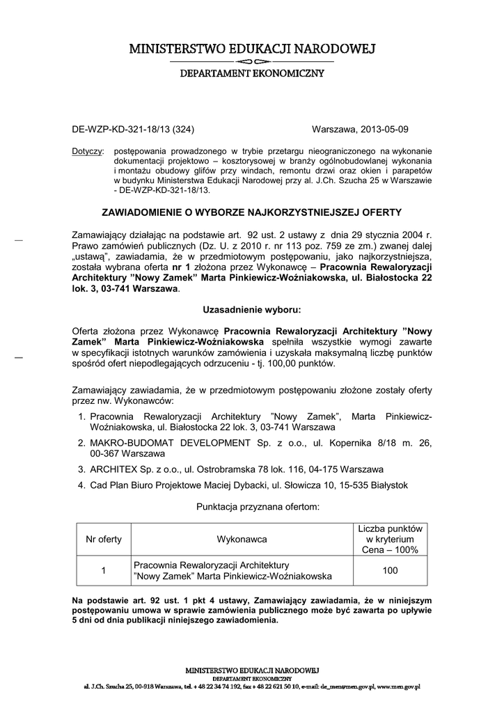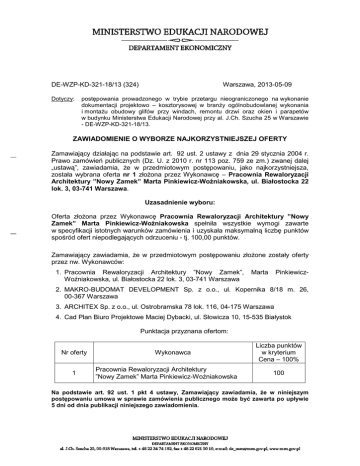 DE-WZP-KD-321-18/13 (324) Dotyczy: Warszawa, 2013-05-09 postępowania prowadzonego w trybie przetargu nieograniczonego na wykonanie dokumentacji projektowo – kosztorysowej w branży ogólnobudowlanej wykonania i montażu obudowy glifów przy windach, remontu drzwi oraz okien i parapetów w budynku Ministerstwa Edukacji Narodowej przy al. J.Ch. Szucha 25 w Warszawie - DE-WZP-KD-321-18/13. ZAWIADOMIENIE O WYBORZE NAJKORZYSTNIEJSZEJ OFERTY Zamawiający działając na podstawie art. 92 ust. 2 ustawy z dnia 29 stycznia 2004 r. Prawo zamówień publicznych (Dz. U. z 2010 r. nr 113 poz. 759 ze zm.) zwanej dalej „ustawą”, zawiadamia, że w przedmiotowym postępowaniu, jako najkorzystniejsza, została wybrana oferta nr 1 złożona przez Wykonawcę – Pracownia Rewaloryzacji Architektury ”Nowy Zamek” Marta Pinkiewicz-Woźniakowska, ul. Białostocka 22 lok. 3, 03-741 Warszawa. Uzasadnienie wyboru: Oferta złożona przez Wykonawcę Pracownia Rewaloryzacji Architektury ”Nowy Zamek” Marta Pinkiewicz-Woźniakowska spełniła wszystkie wymogi zawarte w specyfikacji istotnych warunków zamówienia i uzyskała maksymalną liczbę punktów spośród ofert niepodlegających odrzuceniu - tj. 100,00 punktów. Zamawiający zawiadamia, że w przedmiotowym postępowaniu złożone zostały oferty przez nw. Wykonawców: 1. Pracownia Rewaloryzacji Architektury ”Nowy Zamek”, Woźniakowska, ul. Białostocka 22 lok. 3, 03-741 Warszawa Marta Pinkiewicz- 2. MAKRO-BUDOMAT DEVELOPMENT Sp. z o.o., ul. Kopernika 8/18 m. 26, 00-367 Warszawa 3. ARCHITEX Sp. z o.o., ul. Ostrobramska 78 lok. 116, 04-175 Warszawa 4. Cad Plan Biuro Projektowe Maciej Dybacki, ul. Słowicza 10, 15-535 Białystok Punktacja przyznana ofertom: Nr oferty 1 Wykonawca Pracownia Rewaloryzacji Architektury ”Nowy Zamek” Marta Pinkiewicz-Woźniakowska Liczba punktów w kryterium Cena – 100% 100 Na podstawie art. 92 ust. 1 pkt 4 ustawy, Zamawiający zawiadamia, że w niniejszym postępowaniu umowa w sprawie zamówienia publicznego może być zawarta po upływie 5 dni od dnia publikacji niniejszego zawiadomienia.