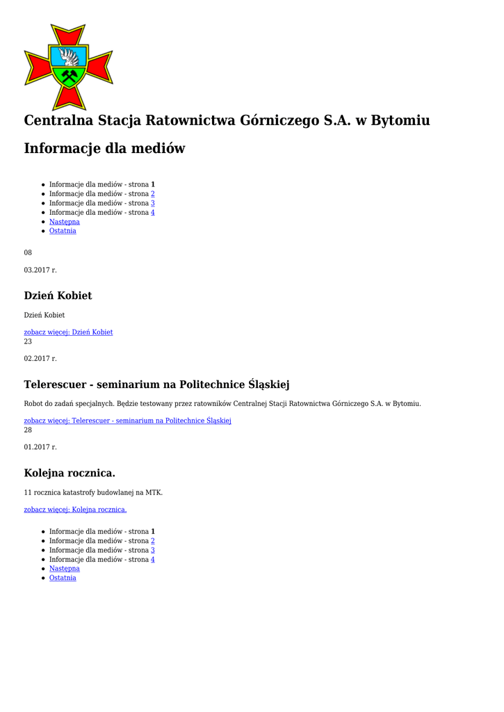 Centralna Stacja Ratownictwa Górniczego S.A. w Bytomiu Informacje dla mediów Informacje dla mediów - strona 1 Informacje dla mediów - strona 2 Informacje dla mediów - strona 3 Informacje dla mediów - strona 4 Następna Ostatnia 08 03.2017 r. Dzień Kobiet Dzień Kobiet zobacz więcej: Dzień Kobiet 23 02.2017 r. Telerescuer - seminarium na Politechnice Śląskiej Robot do zadań specjalnych. Będzie testowany przez ratowników Centralnej Stacji Ratownictwa Górniczego S.A. w Bytomiu. zobacz więcej: Telerescuer - seminarium na Politechnice Śląskiej 28 01.2017 r. Kolejna rocznica. 11 rocznica katastrofy budowlanej na MTK. zobacz więcej: Kolejna rocznica. Informacje dla mediów - strona 1 Informacje dla mediów - strona 2 Informacje dla mediów - strona 3 Informacje dla mediów - strona 4 Następna Ostatnia