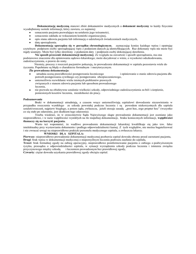 Dokumentację medyczną stanowi zbiór dokumentów medycznych a dokument medyczny to każdy fizycznie wyodrębniony nośnik informacji, który zawiera, co najmniej: oznaczenie pacjenta pozwalające na ustalenie jego tożsamości, oznaczenie zakładu ze wskazaniem komórki organizacyjnej, opis stanu zdrowia pacjenta lub informację o udzielonych świadczeniach medycznych, datę sporządzenia. Dokumentację sporządza się w porządku chronologicznym, zaznaczając koniec każdego wpisu i opatrując czytelnym podpisem osoby sporządzającej wpis z podaniem danych ją identyfikujących. Raz dokonany wpis nie może być nigdy usunięty. Może być tylko skreślony z podaniem daty i podpisem osoby dokonującej skreślenia. Nie sposób przecenić dokumentacji medycznej. Ze względu na zawartość i sposób sporządzania, ma ona podstawowe znaczenie dla opiniowania sądowo-lekarskiego; może decydować o winie, o wysokości odszkodowania, zadośćuczynienia, o prawie do renty. Niestety, procesy z roszczeń pacjentów pokazują, że prowadzenie dokumentacji w szpitalu pozostawia wiele do życzenia. Popełniane są błędy o charakterze formalnym i merytorycznym. Źle prowadzona dokumentacja: utrudnia ocenę prawidłowości postępowania leczniczego i opiniowanie o stanie zdrowia pacjenta dla potrzeb postępowania cywilnego czy postępowania ubezpieczeniowego, uniemożliwia rozwikłanie wielu istotnych problemów prawnych związanych z stanem zdrowia pacjenta lub sposobem prowadzonego leczenia, nie pozwala na obiektywne ustalenie wielkości szkody, odpowiedniego zadośćuczynienia za ból i cierpienie, poniesionych kosztów leczenia, niezdolności do pracy. Podsumowanie Braki w dokumentacji utrudniają, a czasem wręcz uniemożliwiają szpitalowi dowodzenie niezawinienia w przypadku roszczenia wynikłego ze szkody powstałej podczas leczenia i są powodem niekorzystnych dla szpitala ustaleń/orzeczeń, najpierw biegłego, a potem sądu, zwłaszcza, jeżeli stosuje zasadę „post hoc, ergo propter hoc” (wszystko co się stało po zdarzeniu, jest skutkiem tego zdarzenia). Trzeba wiedzieć, że w orzecznictwie Sądu Najwyższego skąpe prowadzenie dokumentacji jest oceniane jako nieprawidłowe, i w razie wątpliwości wynikłych na tle niepełnej dokumentacji, braku koniecznych informacji, wątpliwości tłumaczy się na korzyść pacjenta. Warto też wspomnieć, że wadliwe prowadzenie dokumentacji lekarskiej kwalifikuje się jako tzw. fałsz intelektualny przy wystawianiu dokumentu i podlega odpowiedzialności karnej. Z tych względów, nie można bagatelizować i nie zwracać uwagi na nieprawidłowe praktyki personelu medycznego szpitala, a zwłaszcza lekarzy. WNIOSKI DLA SZPITALA: Pierwszy: nieprawidłowe prowadzenie dokumentacji medycznej pozbawia szpital dowodu obrony przed zarzutami pacjenta, Drugi: brak wpisu w dokumentacji medycznej o niepomyślnym leczeniu podważa zaufanie do szpitala, Trzeci: brak formalnej zgody na zabieg operacyjny, nieprawidłowe poinformowanie pacjenta o zabiegu o podwyższonym ryzyku, przesądza o odpowiedzialności szpitala, w sytuacji wyrządzenia szkody podczas leczenia i istnienia związku przyczynowego między szkodą i leczeniem prowadzonym bez prawidłowej zgody, Czwarty: ciężar dowodu uzyskania prawidłowej zgody obciąża szpital.