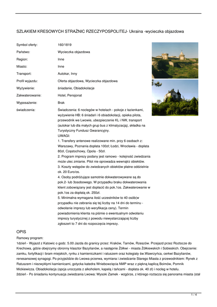 SZLAKIEM KRESOWYCH STRAŻNIC RZECZYPOSPOLITEJ- Ukraina -wycieczka objazdowa Symbol oferty: 160/1819 Państwo: Wycieczka objazdowa Region: Inne Miasto: Inne Transport: Autokar, Inny Profil wyjazdu: Oferta objazdowa, Wycieczka objazdowa Wyżywienie: śniadanie, Obiadokolacje Zakwaterowanie: Hotel, Pensjonat Wyposażenie: Brak świadczenia: Świadczenia: 6 noclegów w hotelach - pokoje z łazienkami, wyżywienie HB: 6 śniadań i 6 obiadokolacji, opieka pilota, przewodnik we Lwowie, ubezpieczenie KL i NW, transport (autokar lub dla małych grup bus z klimatyzacją), składka na Turystyczny Fundusz Gwarancyjny. UWAGI: 1. Transfery antenowe realizowane min. przy 6 osobach z: Warszawy, Poznania dopłata 100zł; Łodzi, Wrocławia - dopłata 80zł, Częstochowy, Opola - 50zł. 2. Program imprezy podany jest ramowo - kolejność zwiedzania może ulec zmianie. Pilot nie oprowadza wewnątrz obiektów. 3. Koszty wstępów do zwiedzanych obiektów płatne oddzielnie ok. 20 Euro/os. 4. Osoby podróżujące samotnie dokwaterowywane są do pok.2- lub 3osobowego. W przypadku braku dokwaterowania klient zobowiązany jest dopłacić do pok.1os. Zakwaterowanie w pok.1os za dopłatą ok. 250zł. 5. Minimalna wymagana ilość uczestników to 40 osób(w przypadku nie zebrania się tej liczby na 14 dni do terminu odwołanie imprezy lub weryfikacja ceny). Termin powiadomienia klienta na piśmie o ewentualnym odwołaniu imprezy turystycznej z powodu niewystarczającej liczby zgłoszeń to 7 dni do rozpoczęcia imprezy. OPIS Ramowy program: 1dzień - Wyjazd z Katowic o godz. 5.00 Jazda do granicy przez: Kraków, Tarnów, Rzeszów. Przejazd przez Roztocze do Krechowa, gdzie obejrzymy obronny klasztor Bazylianów, a następnie Żółkwi - miasta Żółkiewskich i Sobieskich. Obejrzenie: zamku, fortyfikacji i bram miejskich, rynku z kamieniczkami i ratuszem oraz kolegiaty św.Wawrzyńca, cerkwi Bazylianów, renesansowej synagogi. Po przyjeździe do Lwowa przerwa, wymiana i zwiedzanie Starego Miasta z przewodnikiem: Rynek z Ratuszem i niezwykłymi kamienicami, gotycka katedra Wniebowzięcia NMP wraz z piękną kaplicą Boimów, Pomnik Mickiewicza. Obiadokolacja (opcja uroczysta z alkoholem, kapelą i tańcami - dopłata ok. 40 zł) i nocleg w hotelu. 2dzień - Po śniadaniu kontynuacja zwiedzania Lwowa: Wysoki Zamek - wzgórze, z którego roztacza się panorama miasta (stał 1/4 tu zamek Kazimierza Wielkiego), Cmentarz Łyczakowski i Orląt Lwowskich, sobór św.Jura, dworzec Kolei Wiedeńskiej, kościół św. Elżbiety. Po przerwie: Baszta Prochowa, Arsenał Królewski i Miejski, klasztor Dominikanów, cerkiew Wołoska, Katedra Ormiańska, cerkiew Przemienienia Pańskiego, pomnik Mickiewicza, Klasztor Bernardynów. Obejrzenie gmachu Opery Lwowskiej. Dla chętnych możliwość pozostania na spektaklu. Obiadokolacja. Nocleg w hotelu. 3dzień - Po śniadaniu przejazd do Oleska - zamku, w którym urodził się Jan III Sobieski. Spacer po parku zamkowym. Przejazd do pobliskich Podhorzec - obronny, renesansowy pałac był kiedyś jedną z najwspanialszych rezydencji magnackich Kresów. Później odwiedzimy Brody (postój przy cytadeli i pałacu Potockich) i Poczajów (największe Sanktuarium Maryjne Ukrainy). Udajemy się do Krzemieńca - rodzinnego miasta Juliusza Słowackiego. Wyjazd na Wzgórze Bony, skąd roztaczają się panoramy Krzemieńca i Gór Krzemienieckich. Obiadokolacja, nocleg w hotelu. 4dzień - Po śniadaniu zwiedzenie Liceum Krzemienieckiego, dworku z Muzeum Słowackiego i kościoła św. Stanisława z epitafium ku czci wieszcza. Przejazd do Wiśniowca. Obejrzymy tu rodowy pałac i zamek Wiśniowieckich. Następnie udamy się do Zbaraża - obronnej rezydencji Zbaraskich i Wiśniowieckich rozsławionej bohaterską obroną przed wojskami Chmielnickiego w 1648r. Przejazd do stolicy Podola -Tarnopola. Obejrzenie barokowego Kościoła Dominikanów, zamku Tarnowskich nad Seretem, cerkwi Wniebowstąpienia i Narodzenia Chrystusa z XVIw. Zakwaterowanie w hotelu. Obiadokolacja. 5dzień - Po wczesnym śniadaniu wyjazd do Skałatu. Obejrzenie położonego w zakolu Zbrucza zamku miecznika halickiego z XVII w. (zachowane mury i dwie baszty) oraz leżącego na skraju Rezerwatu Miedobory - Satanowa z ruinami zamku Odrowążów z XIVw. i starymi bramami miejskimi. Przejazd do Husiatyna (cerkiew św. Onufrego z XVI w., synagoga z XVIw.) i pobliskiego Sidorowa, z pozostałościami twierdzy wojewody i hetmana polnego Kalinowskiego oraz osobliwy, rokokowy kościół parafialny. Kolejny postój w Skale Podolskiej (ruiny zamku Koriatowiczów). Przejazd do Kamieńca Podolskiego. Poznawanie miasta. Polski Rynek z renesansowym Ratuszem i kamieniczkami, gotycka katedra p.w. św. Piotra i Pawła, kościół Dominikanów, cerkiew św. Mikołaja z XVIw., katedra ormiańska, fortyfikacje. Obiadokolacja i nocleg. 6dzień - Po śniadaniu zwiedzenie największej na Kresach Rzeczpospolitej twierdzy w Kamieńcu Podolskim (XIV-XVIIw.): Starego Zamku oraz bastionów i kazamat Nowego Zamku, obejrzenie fortyfikacji miejskich w jarze Smotrycza. Przejazd do Chocimia z krótkim postojem w Żwańcu (ruiny zamku nad Żwańczykiem). Zwiedzenie strzegącej przeprawy na Dniestrze twierdzy w Chocimiu (XIII-XIV w.). Jazda w kierunku Stanisławowa z postojami w: Okopach Św. Trójcy (Krasiński - -Nieboska komedia”; zachowane bramy twierdzy), Krzywczach (baszty zamku Kąckich z XVIIw.), a następnie Czortkowie - rodowej posiadłości Czartoryskich (zamek, ratusz) i Buczaczu słynącym z najładniejszego ratusza na Kresach oraz ruin warowni Potockich. Obiadokolacja i nocleg w Stanisławowie. 7dzień - Po śniadaniu zwiedzanie Stanisławowa: Ratusz, Pomnik Mickiewicza, Kościoły: Farny z XVIIw., Jezuitów i Ormiański z XVIIIw. Jazda w kierunku granicy z postojem w Drohobyczu (przerwa na posiłek i obejrzenie gotyckiej kolegiaty św. Bartłomieja oraz drewnianej cerkiewki św. Jura z XVIw.). Przekroczenie granicy w Medyce. Przyjazd do Katowic 23.00. Za