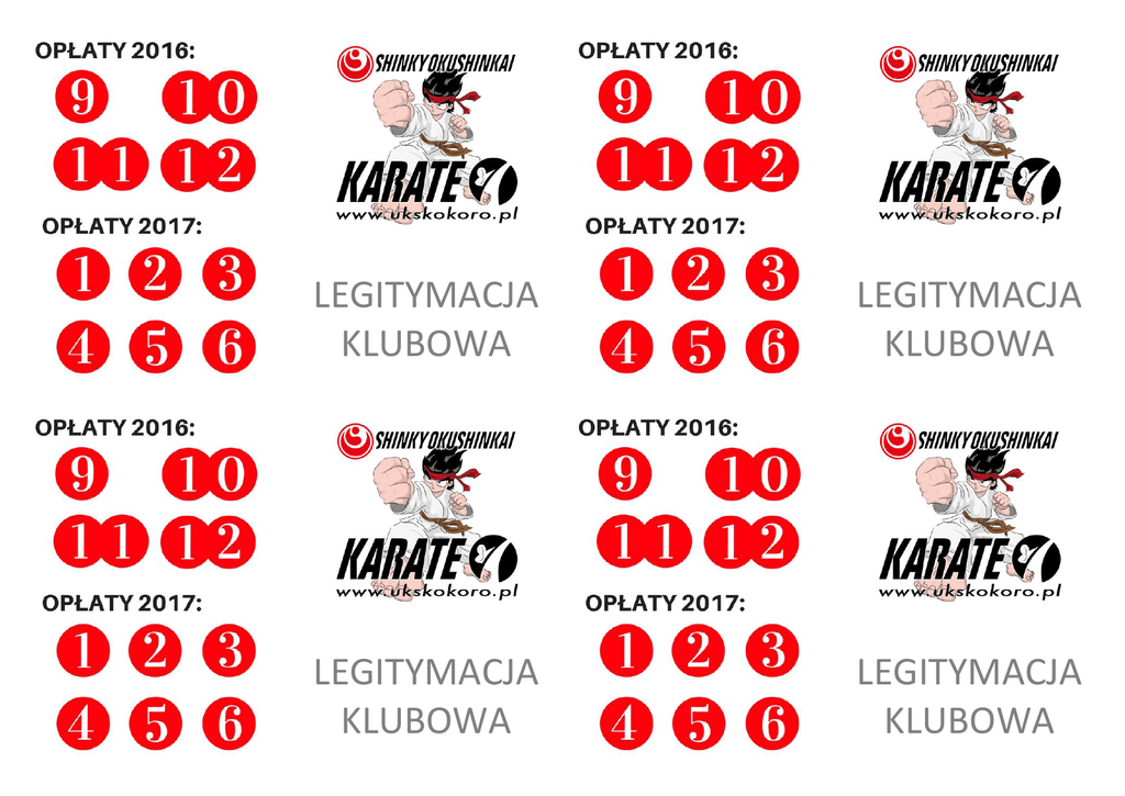 LEGITYMACJA KLUBOWA LEGITYMACJA KLUBOWA LEGITYMACJA KLUBOWA LEGITYMACJA KLUBOWA STOPIEŃ KYU Z POCZĄTKIEM ROKU SZKOLNEGO 2016/2017: FOTO IMIĘ I NAZWISKO: ……………………………………………………….. ( ) ………………..... STOPIEŃ KYU Z POCZĄTKIEM ROKU SZKOLNEGO 2016/2017: FOTO ( ) podpis instruktora ZDOBYTE STOPNIE KYU W ROKU SZKOLNYM 2016/2017: ZDOBYTE STOPNIE KYU W ROKU SZKOLNYM 2016/2017: ( ) ………………..... IMIĘ I NAZWISKO: ……………………………………………………….. ( ) podpis instruktora ……………………………………………………….. NUMER TELEFONU DO RODZICA: ( ) ………………..... NUMER TELEFONU DO RODZICA: ( ) podpis instruktora ……………………………………………………….. podpis instruktora ( ) ………………..... STOPIEŃ KYU Z POCZĄTKIEM ROKU SZKOLNEGO 2016/2017: FOTO ( ) podpis instruktora ZDOBYTE STOPNIE KYU W ROKU SZKOLNYM 2016/2017: ZDOBYTE STOPNIE KYU W ROKU SZKOLNYM 2016/2017: ( ) ………………..... ……………………………………………………….. IMIĘ I NAZWISKO: ……………………………………………………….. ( ) ………………..... podpis instruktora ……………………………………………………….. ( ) ………………..... NUMER TELEFONU DO RODZICA: podpis instruktora ……………………………………………………….. ………………..... podpis instruktora podpis instruktora NUMER TELEFONU DO RODZICA: ………………..... ……………………………………………………….. STOPIEŃ KYU Z POCZĄTKIEM ROKU SZKOLNEGO 2016/2017: IMIĘ I NAZWISKO: ………………..... podpis instruktora ……………………………………………………….. ……………………………………………………….. FOTO ………………..... podpis instruktora ( ) ………………..... podpis instruktora ………………………………………………………..