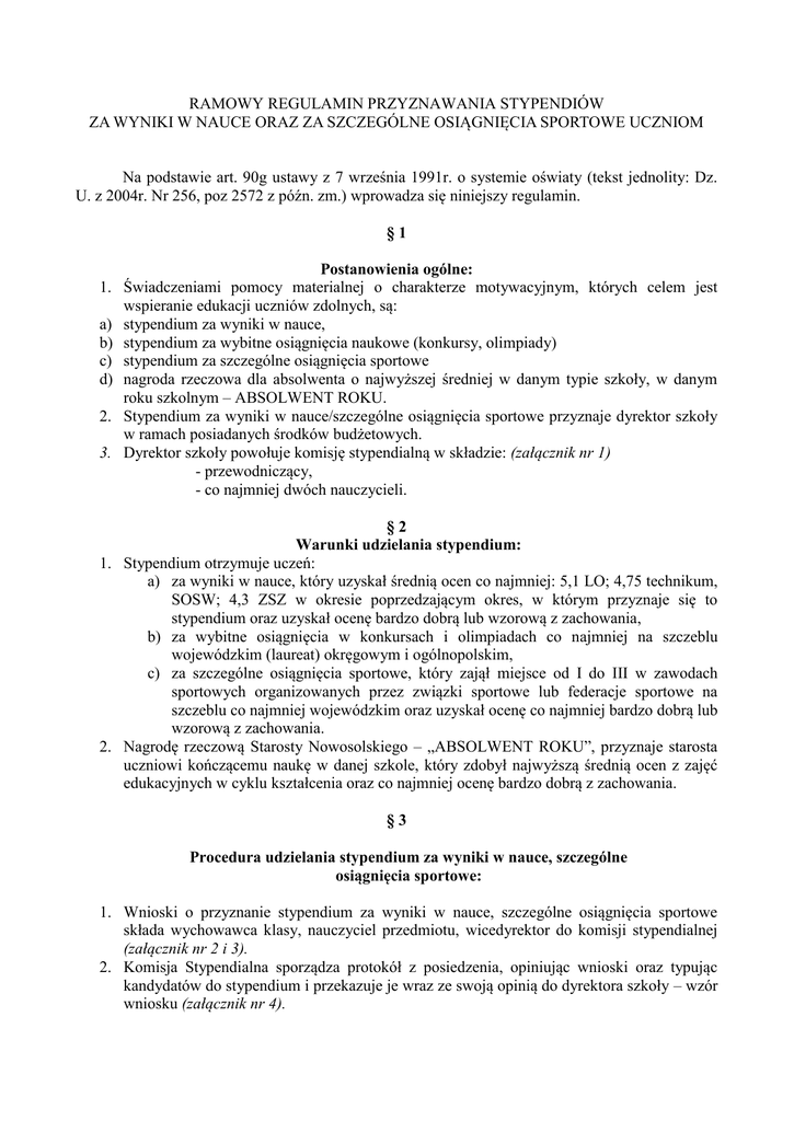 RAMOWY REGULAMIN PRZYZNAWANIA STYPENDIÓW ZA WYNIKI W NAUCE ORAZ ZA SZCZEGÓLNE OSIĄGNIĘCIA SPORTOWE UCZNIOM Na podstawie art. 90g ustawy z 7 września 1991r. o systemie oświaty (tekst jednolity: Dz. U. z 2004r. Nr 256, poz 2572 z późn. zm.) wprowadza się niniejszy regulamin. §1 Postanowienia ogólne: 1. Świadczeniami pomocy materialnej o charakterze motywacyjnym, których celem jest wspieranie edukacji uczniów zdolnych, są: a) stypendium za wyniki w nauce, b) stypendium za wybitne osiągnięcia naukowe (konkursy, olimpiady) c) stypendium za szczególne osiągnięcia sportowe d) nagroda rzeczowa dla absolwenta o najwyższej średniej w danym typie szkoły, w danym roku szkolnym – ABSOLWENT ROKU. 2. Stypendium za wyniki w nauce/szczególne osiągnięcia sportowe przyznaje dyrektor szkoły w ramach posiadanych środków budżetowych. 3. Dyrektor szkoły powołuje komisję stypendialną w składzie: (załącznik nr 1) - przewodniczący, - co najmniej dwóch nauczycieli. §2 Warunki udzielania stypendium: 1. Stypendium otrzymuje uczeń: a) za wyniki w nauce, który uzyskał średnią ocen co najmniej: 5,1 LO; 4,75 technikum, SOSW; 4,3 ZSZ w okresie poprzedzającym okres, w którym przyznaje się to stypendium oraz uzyskał ocenę bardzo dobrą lub wzorową z zachowania, b) za wybitne osiągnięcia w konkursach i olimpiadach co najmniej na szczeblu wojewódzkim (laureat) okręgowym i ogólnopolskim, c) za szczególne osiągnięcia sportowe, który zajął miejsce od I do III w zawodach sportowych organizowanych przez związki sportowe lub federacje sportowe na szczeblu co najmniej wojewódzkim oraz uzyskał ocenę co najmniej bardzo dobrą lub wzorową z zachowania. 2. Nagrodę rzeczową Starosty Nowosolskiego – „ABSOLWENT ROKU”, przyznaje starosta uczniowi kończącemu naukę w danej szkole, który zdobył najwyższą średnią ocen z zajęć edukacyjnych w cyklu kształcenia oraz co najmniej ocenę bardzo dobrą z zachowania. §3 Procedura udzielania stypendium za wyniki w nauce, szczególne osiągnięcia sportowe: 1. Wnioski o przyznanie stypendium za wyniki w nauce, szczególne osiągnięcia sportowe składa wychowawca klasy, nauczyciel przedmiotu, wicedyrektor do komisji stypendialnej (załącznik nr 2 i 3). 2. Komisja Stypendialna sporządza protokół z posiedzenia, opiniując wnioski oraz typując kandydatów do stypendium i przekazuje je wraz ze swoją opinią do dyrektora szkoły – wzór wniosku (załącznik nr 4). 3. Dyrektor szkoły przyznaje stypendium za wyniki w nauce, szczególne osiągnięcia sportowe po zasięgnięciu opinii komisji stypendialnej i rady pedagogicznej – (załącznik nr 5 i 6) oraz otrzymaniu wniosku od rodzica, prawnego opiekuna (załącznik nr 7). §4 Postanowienia końcowe 1. Stypendium za wyniki w nauce, osiągnięcia naukowe oraz szczególne osiągnięcia sportowe jest wypłacane raz w semestrze, a jego wysokość ustala dyrektor szkoły w ramach środków przyznanych na ten cel w budżecie szkoły. 2. Stypendium za wyniki w nauce, szczególne osiągnięcia sportowe przyznaje dyrektor szkoły, w ramach środków przyznanych na ten cel w budżecie szkoły przez organ prowadzący z zastrzeżeniem art. 90g ust. 10 ustawy o systemie oświaty. 3. Od decyzji o przyznaniu stypendium nie przysługuje odwołanie. 4. Ilość i wysokość nagród uzależniona jest od posiadanych środków finansowych przeznaczonych na ten cel przez organ prowadzący szkołę. 5. Stypendium przekazane jest na wskazane konto bankowe przez rodziców, prawnych opiekunów i uczniów pełnoletnich w formie przelewu. 6. W przypadku rażącego naruszenia przez stypendystę obowiązków ucznia, dyrektor szkoły na wniosek rady pedagogicznej może wstrzymać wypłatę stypendium lub ją cofnąć. 7. Termin składania wniosków o udzielenie stypendium: a) I semestr – 28.02. b) II semestr – 31.08. 8. Termin wypłaty stypendium za wyniki w nauce i osiągnięcia sportowe ucznia ustala się – za I semestr do końca 31 marca, za drugi semestr do 30 września danego roku. 9. Informacje o uczniach, którzy uzyskali stypendium za wyniki w nauce, szczególne osiągnięcia podawane będą do publicznej wiadomości. Załącznik nr 1 Nowa Sól, dn. 14.01.2016 Powołanie Komisji Stypendialnej Zgodnie z art. 90g ust. 6 ustawy z dnia 7 września 1991r. o systemie oświaty (tekst jednolity: Dz. U. z 2004r. Nr 256, poz. 2572 z późniejszymi zmianami), powołuję Komisję Stypendialną w składzie: 1. Sławomir Kalisz - przewodniczący komisji stypendialnej 2. Aneta Pisarska – członek 3. Urszula Chorążyk - członek Do zadań Komisji należy: zebranie wniosków ustalanie średniej ocen i oceny z zachowania, warunkujących przyznanie stypendium za wyniki w nauce i szczególne osiągnięcia. Jednocześnie, przed wskazaniem kandydatów do stypendium, zobowiązuję Komisję do przestrzegania zapisów regulaminu przyznawania stypendiów. ………………………… podpis dyrektora szkoły Załącznik nr 2 .............dn. ………………….... miejscowość Komisja Stypendialna WNIOSEK o przyznanie stypendium za wyniki w nauce Na podstawie art. 90g ust. 8 ustawy z 7 września 1991r. o systemie oświaty (tekst jednolity: Dz. U. Nr 256 z 2004r. poz. 2572 ze zmianami) wnioskuję o przyznanie stypendium za: wyniki w nauce: Imię i nazwisko: ……………………………………………………………….… PESEL …………………………………………………….................................... Data i miejsce urodzenia: …………………………………………………..……. Imiona rodziców:.................................................................................................... Adres zamieszkania: ulica………………………………nr domu ……................nr mieszkania............. kod pocztowy……………….....poczta..................miejscowość………………… powiat..........................................