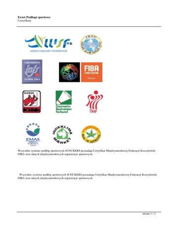 Erzet Podłogi sportowe Certyfikaty Wszystkie systemy podłóg sportowych JUNCKERS posiadają Certyfikat Międzynarodowej Federacji Koszykówki FIBA oraz innych międzynarodowych organizacji sportowych. Wszystkie systemy podłóg sportowych JUNCKERS posiadają Certyfikat Międzynarodowej Federacji Koszykówki FIBA oraz innych międzynarodowych organizacji sportowych. strona 1 / 1