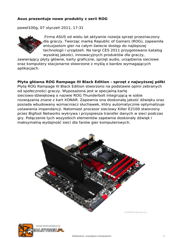 Asus prezentuje nowe produkty z serii ROG pawel100g, 07 styczeń 2011, 17:31 Firma ASUS od wielu lat aktywnie rozwija sprzęt przeznaczony dla graczy. Tworząc markę Republic of Gamers (ROG), zapewniła entuzjastom gier na całym świecie dostęp do najlepszej technologii i urządzeń. Na targi CES 2011 przygotowano katalog wysokiej jakości, innowacyjnych produktów dla graczy, zawierający płyty główne, karty graficzne, sprzęt audio, urządzenia sieciowe oraz komputery stacjonarne stworzone z myślą o bardzo wymagających aplikacjach. Płyta główna ROG Rampage III Black Edition - sprzęt z najwyższej półki Płytę ROG Rampage III Black Edition stworzono na podstawie opinii zebranych od społeczności graczy. Wyposażona jest w specjalną kartę sieciowo-dźwiękową o nazwie ROG Thunderbolt integrującą w sobie rozwiązania znane z kart XONAR. Zapewnia ona doskonałą jakość dźwięku oraz posiada wbudowany wzmacniacz słuchawek, który automatycznie optymalizuje ustawienia impendancji. Natomiast procesor sieciowy Killer E2100 stworzony przez Bigfoot Networks wykrywa i przyspiesza transfer danych w sieci podczas gry. Połączenie tych wszystkich elementów zapewnia doskonały dźwięk i maksymalną wydajność sieci dla fanów gier komputerowych. Realitynet.pl - przystępnie o komputerach 1 Karta graficzna HD 6870 DirectCU - zwiększona wydajność grafiki Zoptymalizowana do pracy z DirectX 11 karta graficzna ASUS HD 6870 DirectCU to połączenie wydajnego procesora graficznego AMD i ekskluzywnych technologii, które sprawiają, że karta uzyskuje znacznie wyższe osiągi, niż konstrukcje referencyjne. W karcie zastosowano technologię Super Alloy Power - specjalny stop, z którego wykonane są najważniejsze komponenty odpowiedzialne za zasilanie, takie jak dławiki, kondensatory i tranzystory. ASUS HD 6870 DirectCU to doskonały akcelerator graficzny dla wielbicieli gier i przetaktowywania - zapewnia o 15%* wyższe osiągi i 2,4-krotnie* dłuższą żywotność, niż rozwiązania referencyjne. Ekskluzywne rozwiązanie DirectCU firmy ASUS składa się z miedzianych przewodów cieplnych bezpośrednio stykających się z procesorem graficznym. Zapewnia nawet o 20%* niższą temperaturę pracy, niż konstrukcje referencyjne. Karta jest również wyposażona w technologię Voltage Tweak, ułatwiającą użytkownikom zmianę napięć zasilania, co pozytywnie wpływa na pomyślny overclocking, a tym samym zwiększenie wydajności karty. Realitynet.pl - przystępnie o komputerach 2 Słuchawki ROG Vulcan ANC - doskonały dźwięk podczas gry Gracze od dawna szukali słuchawek, które doskonale sprawdzałyby się we wszystkich rodzajach gier komputerowych. Vulcan ANC to pierwsze na świecie słuchawki, w których zastosowano technologię Active Noise Cancellation, dzięki czemu zapewniają 85-procentową aktywną redukcję szumów oraz pasywną redukcję hałasu o 30dB. Lekkie i ergonomiczne słuchawki wykonano ze specjalnej pianki, która dostosowuje się i zapamiętuje kształt głowy, dzięki czemu gracze mogą bez problemu korzystać z nich podczas bardzo długich sesji gier. W słuchawkach Vulcan zastosowano duże, 40-milimetrowe głośniki, które zapewniają dźwięk o bardzo wysokiej rozdzielczości i silne basy, natomiast dzięki wszechkierunkowemu mikrofonowi z redukcją szumów gracz ma pewność, że gdy mówi, słychać tylko jego głos. Realitynet.pl - przystępnie o komputerach 3 Dwupasmowy router RT-N66U - ultraszybkie połączenie i eliminacja spowolnień w grach online Bezprzewodowy, dwupasmowy router RT-N66U firmy ASUS zapewnia superszybkie połączenia - do 450Mbps na każde pasmo. Pracuje na częstotliwościach 2,4GHz oraz 5GHz i obsługuje do 300 000 jednoczesnych sesji transferu danych - to 20 razy więcej, niż typowy router. RT-N66U to doskonały wybór dla graczy. Jego przepustowość eliminuje lagi i zapewnia prawdziwą wielozadaniowość - użytkownicy mogą jednocześnie pobierać pliki i jednocześnie grać bez ryzyka wystąpienia problemów z połączeniem, które są typowe dla najpopularniejszych routerów. Realitynet.pl - przystępnie o komputerach 4 RT-N66U wyposażono w sprzętową obsługę NAT, która optymalizuje pracę systemu dzięki zmniejszeniu obciążenia procesora oraz gigabitowe porty Ethernet, obsługujące połączenia 1Gbps. Komputer stacjonarny CG8350 - doskonałe rozwiązanie do gier ASUS CG8350 łączy w sobie wszystko, co czyni z komputera stacjonarnego doskonałą platformę do gier - świetne osiągi, doskonałej jakości sprzęt, duże możliwości rozbudowy i łatwą dostępność do poszczególnych elementów. Wyposażono go w procesor Intel ‘Sandy Bridge’ Core i7-2600 i technologię Turbo Boost 2.0, umożliwiającą natychmiastowe przetaktowywanie. Za grafikę odpowiedzialna jest kompatybilna z DirectX 11 karta graficzna ASUS GTX 460 oparta na technologii ‘Fermi’ firmy NVIDIA. To ogromne możliwości dla graczy w przystępnej cenie. W płycie głównej komputera CG8350 zastosowano wysokiej jakości, wytrzymałe kondensatory, które zwiększają stabilność, żywotność i niezawodność komputera. Posiada też moduł Energy Processing Unit (EPU), który optymalizuje zużycie energii całego systemu. Standard USB 3.0 umożliwia nawet 10-krotnie szybszy transfer danych, niż stosowany do tej pory USB 2.0. Realitynet.pl - przystępnie o komputerach 5 Wszystkie te produkty pokazują, jak bardzo firma ASUS oddana jest idei zwiększania możliwości gier komputerowych. * Rzeczywiste osiągi mogą się różnić w zależności od konfiguracji systemu i innych warunków. Realitynet.pl - przystępnie o komputerach 6