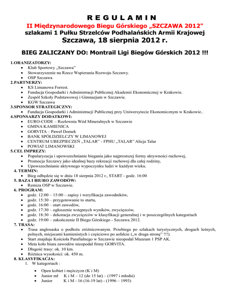 REGULAMIN II Międzynarodowego Biegu Górskiego „SZCZAWA 2012" szlakami 1 Pułku Strzelców Podhalańskich Armii Krajowej Szczawa, 18 sierpnia 2012 r. BIEG ZALICZANY DO: Montrail Ligi Biegów Górskich 2012 !!! 1. ORANIZATORZY: Klub Sportowy „Szczawa” Stowarzyszenie na Rzecz Wspierania Rozwoju Szczawy. OSP Szczawa 2. PARTNERZY: KS Limanowa Forrest. Fundacja Gospodarki i Administracji Publicznej Akademii Ekonomicznej w Krakowie. Zespół Szkoły Podstawowej i Gimnazjum w Szczawie. KGW Szczawa 3. SPONSOR STRATEGICZNY: Fundacja Gospodarki i Administracji Publicznej przy Uniwersytecie Ekonomicznym w Krakowie.. 4. SPONSARZY DODATKOWI: EURO-CODE – Rozlewnia Wód Mineralnych w Szczawie GMINA KAMIENICA GORVITA – Paweł Domek BANK SPÓŁDZIELCZY W LIMANOWEJ CENTRUM UBEZPIECZEŃ „TALAR” - FPHU „TALAR” Alicja Talar POWIAT LIMANOWSKI 5. CEL IMPREZY: Popularyzacja i upowszechnianie biegania jako najprostszej formy aktywności ruchowej, Promocja Szczawy jako idealnej bazy rekreacji ruchowej dla całej rodziny, Upowszechnianie aktywnego wypoczynku ludzi w każdym wieku. 4. TERMIN: Bieg odbędzie się w dniu 18 sierpnia 2012 r., START - godz. 16:00 5. BAZA I BIURO ZAWODÓW: Remiza OSP w Szczawie. 6. PROGRAM: godz. 12:00 – 15:00 – zapisy i weryfikacja zawodników, godz. 15:30 – przygotowanie to startu, godz. 16:00 – start zawodów, godz. 17:30 – ogłoszenie wstępnych wyników, zwycięzców, godz. 18:30 – dekoracja zwycięzców w klasyfikacji generalnej i w poszczególnych kategoriach godz. 19:00 – zakończenie II Biegu Górskiego - Szczawa 2012. 7. TRASA: Trasa anglosaska o podłożu zróżnicowanym. Przebiega po szlakach turystycznych, drogach leśnych, polnych, miejscami kamienistych i częściowo po asfalcie („w druga stronę” !!!). Start znajduje Kościoła Parafialnego w Szczawie nieopodal Muzeum 1 PSP AK. Meta koło biura zawodów nieopodal firmy GORVITA. Długość trasy: ok. 10 km. Różnica wysokości: ok. 450 m. 8. KLASYFIKACJA: 1. W kategoriach : Open kobiet i mężczyzn (K i M) Junior mł K i M – 12 (do 15 lat) – (1997 i młodsi) Junior K i M - 16 (16-19 lat) - (1996 – 1993) Senior I K i M - 20 (20-29 lat) - (1992 – 1983) Senior II - K i M - 30 (30-39 lat) - (1982 – 1973) Masters K i M - 40 (40-49 lat) - (1972 – 1963) Weteran I K i M - 50 (50-59 lat) - (1962 – 1953) Weteran II K i M - 60 (powyżej 60 lat) – (1952 i starsi) 2. Oddzielna dodatkowa Klasyfikacja dla służb mundurowych open (nagrody, medale i dyplomy). 3. Oddzielna dodatkowa Klasyfikacja dla mieszkańców Szczawy: kobiety i mężczyźni open (nagrody, medale i dyplomy). 4. Dodatkowo oddzielna dodatkowa Klasyfikacja dla mieszkańców Szczawy: kobiety i mężczyźni we wszystkich kategoriach (medale i dyplomy). Warunkiem prowadzenia klasyfikacji w danej kategorii (grupie wiekowej) jest uczestnictwo co najmniej 3 zawodników w danej kategorii. Jeśli w danej kategorii nie zgłosi się minimum 3 zawodników zawodnicy będą klasyfikowani w kategorii niższej wiekowo. 9. NAGRODY: 1. Miejsca I – III we wszystkich kategoriach - medale - dyplomy. 2. Klasyfikacja generalna /open/ kobiet i mężczyzn Miejsca I – 500 zł Miejsce II – 300 zł Miejsce III – 200 zł 3. „Premia górska” – nagroda dla Zawodniczki i Zawodnika, którzy najszybciej wbiegną na najwyższy punkt trasy na „Polankach” w miejscu oznaczonym logiem sponsora - 200 zł. Warunkiem otrzymania nagrody za premię górską jest ukończenie całego biegu. 4. Nagroda dla najstarszego i najmłodszego uczestnika biegu. 5. Nagroda dla zawodnika z miejsca najbardziej oddalonego wg. Google. 6. 5 nagród niespodzianek losowanych wśród uczestników biegu. 10. WARUNKI UCZESTNICTWA: 1. W biegu mogą brać udział zawodnicy zrzeszeni i niezrzeszeni. 2. Zawodnicy, którzy nie ukończyli 18 roku życia, muszą posiadać pisemną zgodę rodziców (lub prawnego opiekuna). Zgoda na udział Zawodników poniżej 18 roku życia musi być podpisana przez rodzica w biurze zawodów. 3. Do biegu zostaną dopuszczeni zawodniczki i zawodnicy, którzy: a) dokonają zgłoszenia, b) uiszczą opłatę startową (oprócz zwolnionych z opłaty), d) dokonają weryfikacji w Biurze Zawodów w Szczawie – OSP Szczawa w dniu 18 sierpnia 2012 r. w godz. od. 12:00 do 15:00. Podczas weryfikacji zawodnicy muszą posiadać ważny dowód tożsamości ze zdjęciem, e) przedstawią aktualne zaświadczenie lekarskie, lub podpiszą oświadczenie o właściwym stanie zdrowia (w przypadku Zawodników, którzy do dnia 18.08.2012 nie ukończyli 18 roku życia, konieczne jest podpis rodziców lub opiekuna prawnego - w biurze zawodów), 11. ZGŁOSZENIA: Zgłoszenie poprzez stronę http://pifsport.pl/contest/contest/id/24: Należy podanie Nazwiska i Imienia oraz daty urodzenia i miejsca zamieszkania do dnia 16 sierpnia 2011 r. Po tym terminie zapisy wyłącznie na miejscu w Biurze Zawodów w dniu 18 sierpnia 2012 r. Zgłoszenie staje się ważne z chwilą uiszczenia opłaty startowej. 12. OPŁATA STARTOWA: 1. Płatna w biurze zawodów w wysokości: 20 zł – opłata dla osób zgłaszających się na stronie www.pifsport.pl 30 zł – dla osób zgłaszających się w dniu zawodów. zwolnieni z opłaty startowej zgłaszający się na stronie www.pifsport.pl: o zawodnicy poniżej 15 roku życia (rocznik 1997 i młodsi) o mieszkańcy Szczawy, Opłata startowa nie podlega zwrotowi. 13. ŚWIADCZENIA: Organizator w ramach opłaty startowej zapewnia: Wspaniałą biegową atmosferę, Zabezpieczenie i oznakowanie trasy, Zabezpieczenie i pomoc służb ratunkowych, Elektroniczny pomiar czasu obsługiwany przez firmę „Pif-Sport”, Pomoc wolontariuszy. Ponadto Uczestnicy biegu otrzymają: Napoje na trasie, Pamiątkowy numer startowy, Pamiątkowy okolicznościowy medal (dla zawodników, którzy ukończą bieg), Posiłek z grilla i napój na mecie, Możliwość udziału w losowaniu licznych nagród rzeczowych. Możliwość taniego, odpłatnego zakwaterowania w prywatnyc