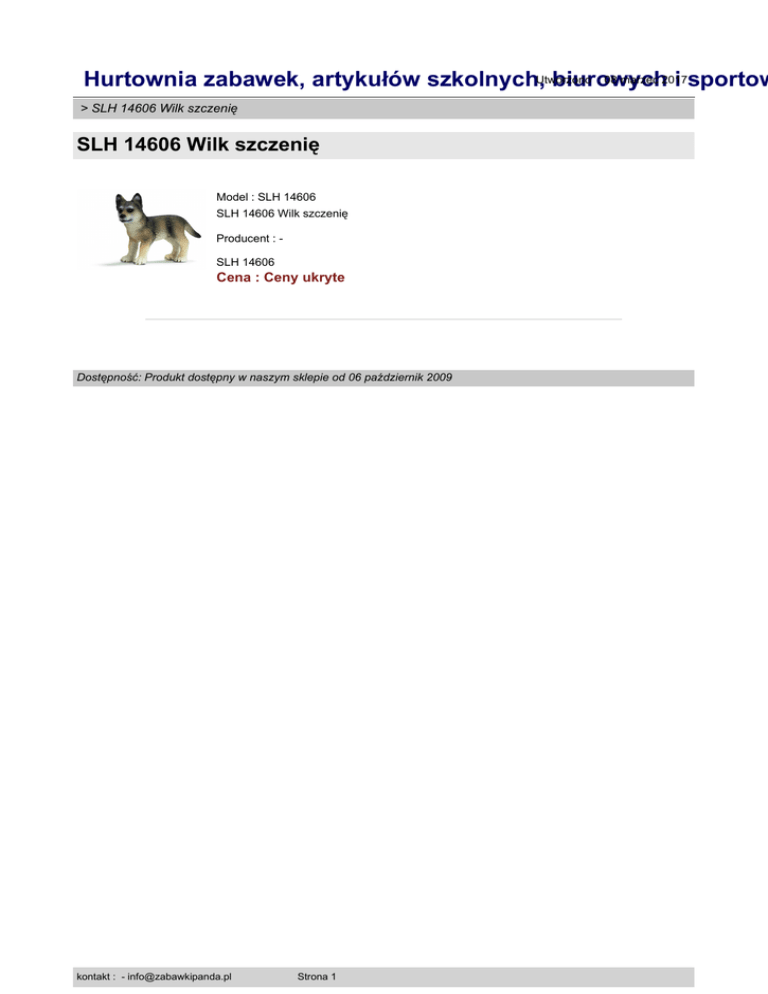 : 08 marzec 2017 Hurtownia zabawek, artykułów szkolnych,Utworzono biurowych i sportow > SLH 14606 Wilk szczenię SLH 14606 Wilk szczenię Model : SLH 14606 SLH 14606 Wilk szczenię Producent : SLH 14606 Cena : Ceny ukryte Dostępność: Produkt dostępny w naszym sklepie od 06 październik 2009 kontakt : - [email protected] Strona 1