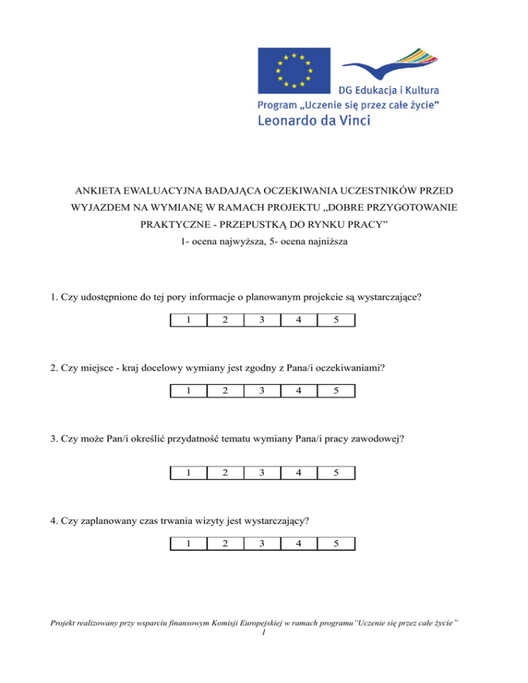 ANKIETA EWALUACYJNA BADAJĄCA OCZEKIWANIA UCZESTNIKÓW PRZED WYJAZDEM NA WYMIANĘ W RAMACH PROJEKTU „DOBRE PRZYGOTOWANIE PRAKTYCZNE - PRZEPUSTKĄ DO RYNKU PRACY” 1- ocena najwyższa, 5- ocena najniższa 1. Czy udostępnione do tej pory informacje o planowanym projekcie są wystarczające? 1 2 3 4 5 2. Czy miejsce - kraj docelowy wymiany jest zgodny z Pana/i oczekiwaniami? 1 2 3 4 5 3. Czy może Pan/i określić przydatność tematu wymiany Pana/i pracy zawodowej? 1 2 3 4 5 4. Czy zaplanowany czas trwania wizyty jest wystarczający? 1 2 3 4 5 Projekt realizowany przy wsparciu finansowym Komisji Europejskiej w ramach programu”Uczenie się przez całe życie” 1 6. Proszę zaznaczyć, które z poniższych zagadnień, będących tematem wymiany z partnerem portugalskim najbardziej Pana/ą interesuje w kontekście przydatności w pracy zawodowej: Organizacja praktyk i staży zawodowych Zawartość merytoryczna programów praktyk i staży zawodowych Powiązania organizacyjne instytucji szkoleniowych Monitorowanie rynku pracy w kontekście kształcenia zawodowego System szkolnictwa zawodowego w Portugalii Inne uwagi: ............................................................................................................................................................... ............................................................................................................................................................... ................................................................................................................................................................ ................................................................................................................................................................ Projekt realizowany przy wsparciu finansowym Komisji Europejskiej w ramach programu”Uczenie się przez całe życie” 2