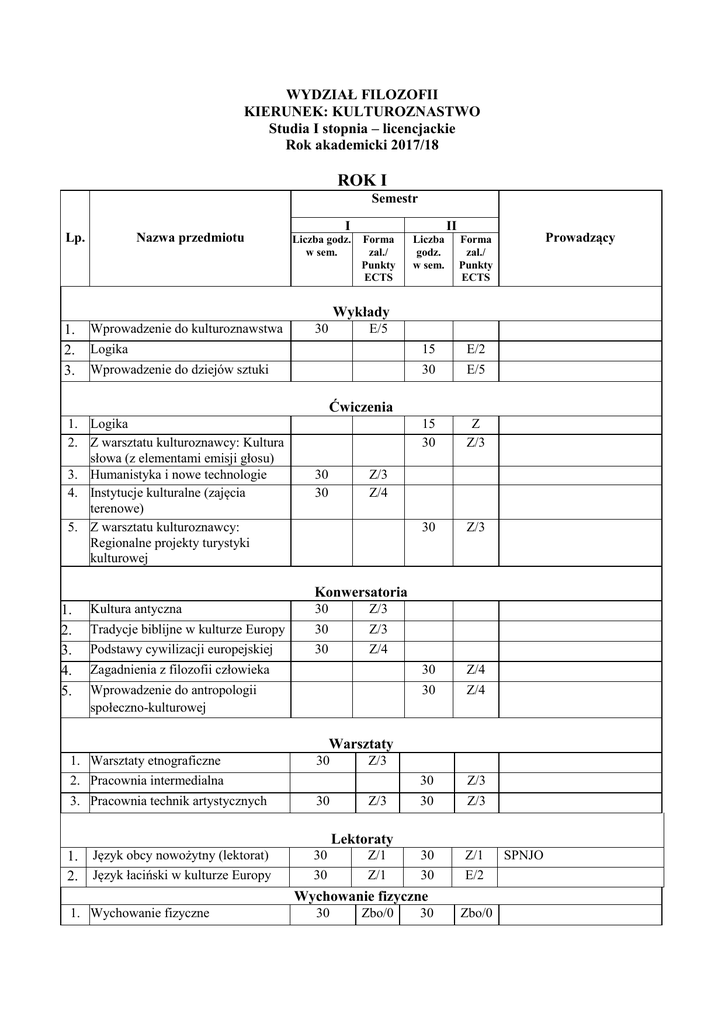WYDZIAŁ FILOZOFII KIERUNEK: KULTUROZNASTWO Studia I stopnia – licencjackie Rok akademicki 2017/18 ROK I Semestr Lp. Nazwa przedmiotu I Liczba godz. w sem. II Forma zal./ Punkty ECTS Liczba godz. w sem. Forma zal./ Punkty ECTS 15 30 E/2 E/5 15 30 Z Z/3 30 Z/3 30 Z/4 30 Z/4 30 Z/3 30 Z/3 30 30 Z/1 E/2 Prowadzący Wykłady 1. 2. 3. Wprowadzenie do kulturoznawstwa 30 E/5 Logika Wprowadzenie do dziejów sztuki Ćwiczenia 1. Logika 2. Z warsztatu kulturoznawcy: Kultura słowa (z elementami emisji głosu) 3. Humanistyka i nowe technologie 4. Instytucje kulturalne (zajęcia terenowe) 5. Z warsztatu kulturoznawcy: Regionalne projekty turystyki kulturowej 30 30 Z/3 Z/4 punkty ECTS ECTS Konwersatoria 1. 2. 3. 4. 5. Kultura antyczna Tradycje biblijne w kulturze Europy 30 30 Z/3 Z/3 Podstawy cywilizacji europejskiej Zagadnienia z filozofii człowieka 30 Z/4 Wprowadzenie do antropologii społeczno-kulturowej Warsztaty 1. Warsztaty etnograficzne 30 Z/3 2. Pracownia intermedialna 3. Pracownia technik artystycznych 30 Z/3 Lektoraty 1. 2. Język obcy nowożytny (lektorat) Język łaciński w kulturze Europy 30 30 Z/1 Z/1 Wychowanie fizyczne 1. Wychowanie fizyczne 30 Zbo/0 30 Zbo/0 SPNJO ROK II Semestr I Lp. Nazwa przedmiotu Liczba godz. w sem. II Forma zal./ Punkty ECTS Liczba godz. w sem. Forma zal./ Punkty ECTS Wykłady 1. 2. 3. 4. 5. Antropologia mediów Sztuka, piękno, estetyka Historia filozofii Dzieje chrześcijaństwa Socjologia kultury 30 30 30 E/2 E/2 E/4 30 30 30 30 E/3 E/3 E/2 E/2 30 Z/3 30 Z/3 30 Z/2 30 Z/3 30 Z/2 30 Z/1 E/2 punkty 1. 2. 3. 4. Ćwiczenia ECTS Warsztaty badań medioznawczych Warsztaty badań socjologicznych Sztuka – forma i interpretacje Animacja kultury 30 Z/3 30 Z/3 ECTS Konwersatoria 1. 2. 3. 4. 5. Sztuka – style, kierunki, tendencje, nurty Organizacja kultury (zajęcia terenowe) Polskie dziedzictwo kulturowe Podstawy prawne i ekonomiczne zarządzania kulturą Wstęp do kultur orientalnych 30 30 30 Z/3 Z/3 Z/3 Warsztaty 1. 2. Audiowizualne techniki promocji (kultury) Komunikacja perswazyjna 1. 2. Język obcy nowożytny (lektorat) Język obcy nowożytny (egzamin) 30 Z/2 Lektoraty 30 Z/1 Moduły do wyboru: (należy wybrać jeden moduł) Kultura: tradycje i innowacje 1. 2. 3. 4. Kultury mediów Współczesne recepcje kultury antycznej Pluralizm religijny a tożsamość kulturowa Teksty kultury: analiza i interpretacja 30 30 Z/2 Z/2 30 Z/2 30 Z/2 SPNJO SPNJO Prowadzący Kultury: dyplomacja i bezpieczeństwo 1. 2. 3. 4. Etykieta dyplomatyczna Bezpieczeństwo kulturowe Organizacja obronności (zajęcia terenowe) Komunikacja międzykulturowa 30 30 Z/2 Z/2 30 Z/2 30 Z/2 ROK III Semestr I Lp. Liczba godz. w sem. Nazwa przedmiotu II Forma zal./ Punkty ECTS Liczba Forma godz. zal./ w sem. Punkty ECTS Wykłady 1. 2. 3. 4. Teoria kultury Tradycje i innowacje w literaturze Antropologia teatru a antropologia widowisk Etyka 30 30 30 E/6 E/3 30 E/4 30 Z/2 30 Z/2 E/2 Ćwiczenia 1. 2. 3. Teoria kultury Studium przekazów medialnych (zajęcia terenowe) Z warsztatu kulturoznawcy: Czytanie teatru 30 30 Z Z/3 punkty Konwersatoria ECTS 1. Dydaktyka wiedzy o kulturze Translatorium (należy wybrać jedno translatorium) ECTS 1. Translatorium z tekstów kultury (gr. 1 dla początkujących) 2. Translatorium z tekstów kultury (gr. 2 dla zaawansowanych) 30 Z/3 30 Z/3 Warsztaty 1. Warsztaty performatywne 30 Z/2 Moduły do wyboru: (należy wybrać jeden moduł) Kultura: tradycje i innowacje 1. Materialne i niematerialne dziedzictwo kulturowe 30 Z/2 Prowadzący 2. Tradycje i innowacje w muzyce 30 z/2 3. Tradycyjne religie a nowa duchowość 4. Sztuka sakralna 30 Z/2 30 Z/2 5. Historia kultury polskiej 30 Z/2 6. Elementy kultury powszechnej 30 Z/2 7. Muzealnictwo 30 Z/2 8. Kultury lokalne 30 Z/2 Kultury: dyplomacja i bezpieczeństwo: 1. Globalne problemy kultury współczesnej 2. Dyplomacja międzykulturowa 30 Z/2 30 Z/2 30 Z/2 6. Judaizm w tradycji europejskiej 30 Z/2 7. Współczesne relacje międzycywilizacyjne 8. Destrukcyjne grupy kulturowe 30 Z/2 3. Islam a kultura Europy 4. Komunikacja pozawerbalna 30 Z/2 5. Bezpieczeństwo mediów 30 Z/2 30 Z/2 Seminaria do wyboru (należy wybrać jedno seminarium) 1. Wiedza o kulturze i sztuce 2. Dialog kultur i religii 3. Kultura medialna 30 30 30 Z/3 Z/3 Z/3 30 30 30 Z/3 Z/3 Z/3 Praca dyplomowa i egzamin dyplomowy 1. Praca dyplomowa i egzamin dyplomowy 0 - 0 Zbo/10 Praktyki obowiązkowe 1. Praktyka zawodowa 90 godz. Zbo/1 [3 tyg.]
