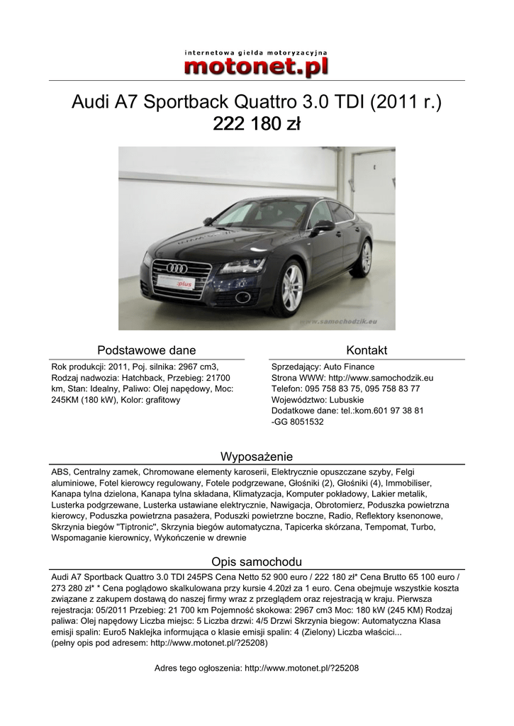 Audi A7 Sportback Quattro 3.0 TDI (2011 r.) 222 180 zł Podstawowe dane Kontakt Rok produkcji: 2011, Poj. silnika: 2967 cm3, Rodzaj nadwozia: Hatchback, Przebieg: 21700 km, Stan: Idealny, Paliwo: Olej napędowy, Moc: 245KM (180 kW), Kolor: grafitowy Sprzedający: Auto Finance Strona WWW: http://www.samochodzik.eu Telefon: 095 758 83 75, 095 758 83 77 Województwo: Lubuskie Dodatkowe dane: tel.:kom.601 97 38 81 -GG 8051532 Wyposażenie ABS, Centralny zamek, Chromowane elementy karoserii, Elektrycznie opuszczane szyby, Felgi aluminiowe, Fotel kierowcy regulowany, Fotele podgrzewane, Głośniki (2), Głośniki (4), Immobiliser, Kanapa tylna dzielona, Kanapa tylna składana, Klimatyzacja, Komputer pokładowy, Lakier metalik, Lusterka podgrzewane, Lusterka ustawiane elektrycznie, Nawigacja, Obrotomierz, Poduszka powietrzna kierowcy, Poduszka powietrzna pasażera, Poduszki powietrzne boczne, Radio, Reflektory ksenonowe, Skrzynia biegów ''Tiptronic'', Skrzynia biegów automatyczna, Tapicerka skórzana, Tempomat, Turbo, Wspomaganie kierownicy, Wykończenie w drewnie Opis samochodu Audi A7 Sportback Quattro 3.0 TDI 245PS Cena Netto 52 900 euro / 222 180 zł* Cena Brutto 65 100 euro / 273 280 zł* * Cena poglądowo skalkulowana przy kursie 4.20zł za 1 euro. Cena obejmuje wszystkie koszta związane z zakupem dostawą do naszej firmy wraz z przeglądem oraz rejestracją w kraju. Pierwsza rejestracja: 05/2011 Przebieg: 21 700 km Pojemność skokowa: 2967 cm3 Moc: 180 kW (245 KM) Rodzaj paliwa: Olej napędowy Liczba miejsc: 5 Liczba drzwi: 4/5 Drzwi Skrzynia biegow: Automatyczna Klasa emisji spalin: Euro5 Naklejka informująca o klasie emisji spalin: 4 (Zielony) Liczba właścici... (pełny opis pod adresem: http://www.motonet.pl/?25208) Adres tego ogłoszenia: http://www.motonet.pl/?25208