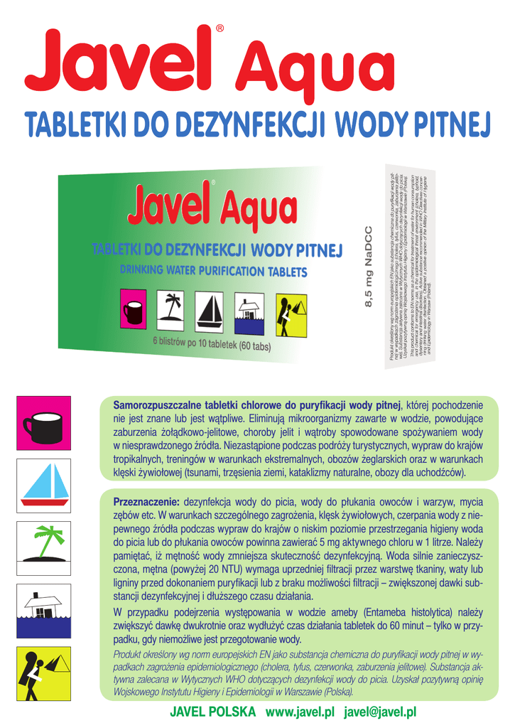 Samorozpuszczalne tabletki chlorowe do puryfikacji wody pitnej, której pochodzenie nie jest znane lub jest wątpliwe. Eliminują mikroorganizmy zawarte w wodzie, powodujące zaburzenia żołądkowo-jelitowe, choroby jelit i wątroby spowodowane spożywaniem wody w niesprawdzonego źródła. Niezastąpione podczas podróży turystycznych, wypraw do krajów tropikalnych, treningów w warunkach ekstremalnych, obozów żeglarskich oraz w warunkach klęski żywiołowej (tsunami, trzęsienia ziemi, kataklizmy naturalne, obozy dla uchodźców). Przeznaczenie: dezynfekcja wody do picia, wody do płukania owoców i warzyw, mycia zębów etc. W warunkach szczególnego zagrożenia, klęsk żywiołowych, czerpania wody z nie pewnego źródła podczas wypraw do krajów o niskim poziomie przestrzegania higieny woda do picia lub do płukania owoców powinna zawierać 5 mg aktywnego chloru w 1 litrze. Należy pamiętać, iż mętność wody zmniejsza skuteczność dezynfekcyjną. Woda silnie zanieczysz czona, mętna (powyżej 20 NTU) wymaga uprzedniej filtracji przez warstwę tkaniny, waty lub ligniny przed dokonaniem puryfikacji lub z braku możliwości filtracji – zwiększonej dawki substancji dezynfekcyjnej i dłuższego czasu działania. W przypadku podejrzenia występowania w wodzie ameby (Entameba histolytica) należy zwiększyć dawkę dwukrotnie oraz wydłużyć czas działania tabletek do 60 minut – tylko w przypadku, gdy niemożliwe jest przegotowanie wody. Produkt określony wg norm europejskich EN jako substancja chemiczna do puryfikacji wody pitnej w wypadkach zagrożenia epidemiologicznego (cholera, tyfus, czerwonka, zaburzenia jelitowe). Substancja aktywna zalecana w Wytycznych WHO dotyczących dezynfekcji wody do picia. Uzyskał pozytywną opinię Wojskowego Instytutu Higieny i Epidemiologii w Warszawie (Polska). JAVEL POLSKA www.javel.pl [email protected]