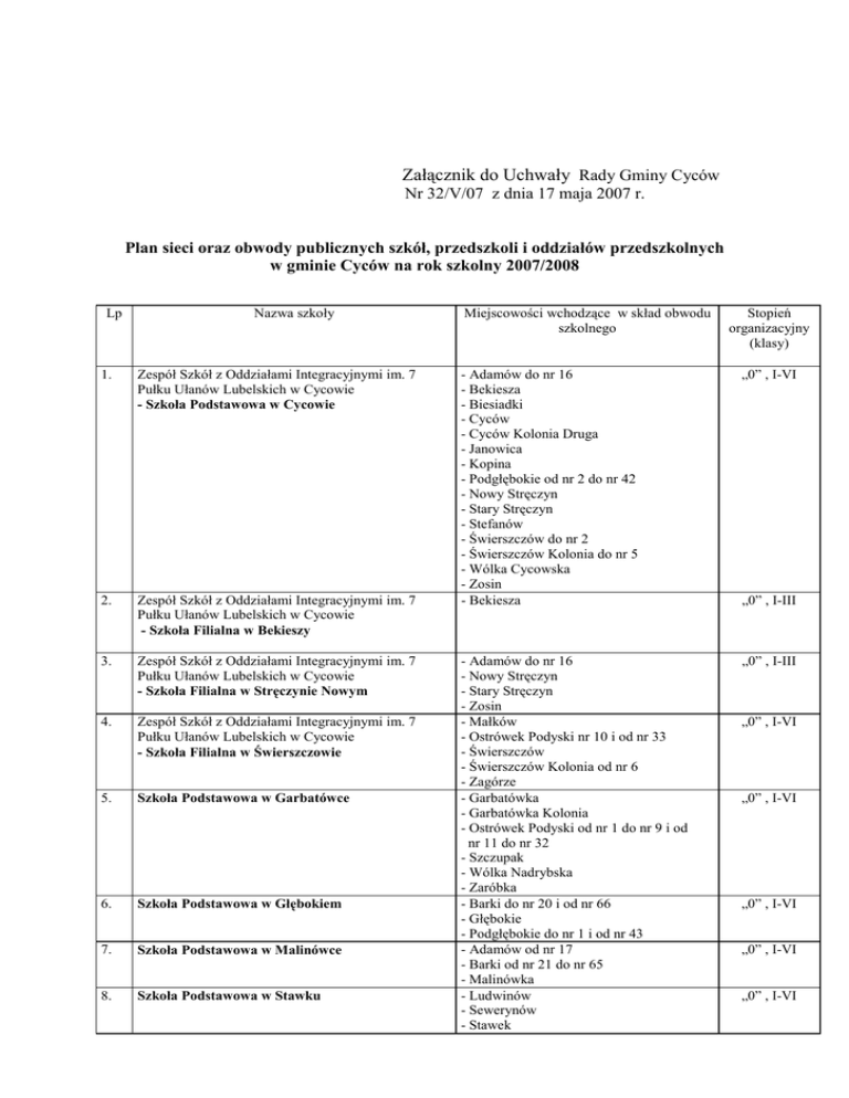 Załącznik do Uchwały Rady Gminy Cyców Nr 32/V/07 z dnia 17 maja 2007 r. Plan sieci oraz obwody publicznych szkół, przedszkoli i oddziałów przedszkolnych w gminie Cyców na rok szkolny 2007/2008 Lp Nazwa szkoły 1. Zespół Szkół z Oddziałami Integracyjnymi im. 7 Pułku Ułanów Lubelskich w Cycowie - Szkoła Podstawowa w Cycowie 2. Zespół Szkół z Oddziałami Integracyjnymi im. 7 Pułku Ułanów Lubelskich w Cycowie - Szkoła Filialna w Bekieszy 3. Zespół Szkół z Oddziałami Integracyjnymi im. 7 Pułku Ułanów Lubelskich w Cycowie - Szkoła Filialna w Stręczynie Nowym 4. Zespół Szkół z Oddziałami Integracyjnymi im. 7 Pułku Ułanów Lubelskich w Cycowie - Szkoła Filialna w Świerszczowie 5. Szkoła Podstawowa w Garbatówce 6. Szkoła Podstawowa w Głębokiem 7. Szkoła Podstawowa w Malinówce 8. Szkoła Podstawowa w Stawku Miejscowości wchodzące w skład obwodu szkolnego Stopień organizacyjny (klasy) - Adamów do nr 16 - Bekiesza - Biesiadki - Cyców - Cyców Kolonia Druga - Janowica - Kopina - Podgłębokie od nr 2 do nr 42 - Nowy Stręczyn - Stary Stręczyn - Stefanów - Świerszczów do nr 2 - Świerszczów Kolonia do nr 5 - Wólka Cycowska - Zosin - Bekiesza „0” , I-VI - Adamów do nr 16 - Nowy Stręczyn - Stary Stręczyn - Zosin - Małków - Ostrówek Podyski nr 10 i od nr 33 - Świerszczów - Świerszczów Kolonia od nr 6 - Zagórze - Garbatówka - Garbatówka Kolonia - Ostrówek Podyski od nr 1 do nr 9 i od nr 11 do nr 32 - Szczupak - Wólka Nadrybska - Zaróbka - Barki do nr 20 i od nr 66 - Głębokie - Podgłębokie do nr 1 i od nr 43 - Adamów od nr 17 - Barki od nr 21 do nr 65 - Malinówka - Ludwinów - Sewerynów - Stawek „0” , I-III „0” , I-III „0” , I-VI „0” , I-VI „0” , I-VI „0” , I-VI „0” , I-VI 9. Zespół Szkół z Oddziałami Integracyjnymi im. 7 Pułku Ułanów Lubelskich w Cycowie - Gimnazjum Publiczne w Cycowie 10. Zespół Szkół z Oddziałami Integracyjnymi im. 7 Pułku Ułanów Lubelskich w Cycowie - Przedszkole Samorządowe w Cycowie - Adamów - Barki - Bekiesza - Biesiadki - Cyców - Cyców Kolonia Druga - Garbatówka - Garbatówka Kolonia - Głębokie - Janowica - Kopina - Ludwinów - Malinówka - Małków - Ostrówek Podyski - Podgłębokie - Sewerynów - Stawek - Nowy Stręczyn - Stary Stręczyn - Stefanów - Szczupak - Świerszczów - Świerszczów Kolonia - Wólka Cycowska - Wólka Nadrybska - Zagórze - Zaróbka - Zosin Wszystkie miejscowości z terenu całej gminy I-III Przedszkolaki w wieku 3-5 lat