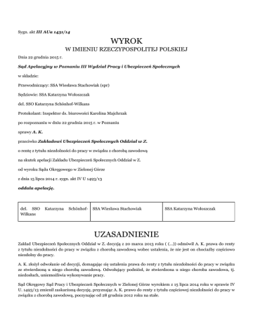 Sygn. akt III AUa 1431/14 WYROK W IMIENIU RZECZYPOSPOLITEJ POLSKIEJ Dnia 22 grudnia 2015 r. Sąd Apelacyjny w Poznaniu III Wydział Pracy i Ubezpieczeń Społecznych w składzie: Przewodniczący: SSA Wiesława Stachowiak (spr) Sędziowie: SSA Katarzyna Wołoszczak del. SSO Katarzyna Schönhof-Wilkans Protokolant: Inspektor ds. biurowości Karolina Majchrzak po rozpoznaniu w dniu 22 grudnia 2015 r. w Poznaniu sprawy A. K. przeciwko Zakładowi Ubezpieczeń Społecznych Oddział w Z. o rentę z tytułu niezdolności do pracy w związku z chorobą zawodową na skutek apelacji Zakładu Ubezpieczeń Społecznych Oddział w Z. od wyroku Sądu Okręgowego w Zielonej Górze z dnia 15 lipca 2014 r. sygn. akt IV U 1493/13 oddala apelację. del. SSO Wilkans Katarzyna Schönhof- SSA Wiesława Stachowiak SSA Katarzyna Wołoszczak UZASADNIENIE Zakład Ubezpieczeń Społecznych Oddział w Z. decyzją z 20 marca 2013 roku ( (...)) odmówił A. K. prawa do renty z tytułu niezdolności do pracy w związku z chorobą zawodową wobec ustalenia, że nie jest on chociażby częściowo niezdolny do pracy. A. K. złożył odwołanie od decyzji, domagając się ustalenia prawa do renty z tytułu niezdolności do pracy w związku ze stwierdzoną u niego chorobą zawodową. Odwołujący podniósł, że stwierdzona u niego choroba zawodowa, tj. niedosłuch, uniemożliwia wykonywanie pracy. Sąd Okręgowy Sąd Pracy i Ubezpieczeń Społecznych w Zielonej Górze wyrokiem z 15 lipca 2014 roku w sprawie IV U. 1493/13 zmienił zaskarżoną decyzję, przyznając A. K. prawo do renty z tytułu częściowej niezdolności do pracy w związku z chorobą zawodową, poczynając od 28 grudnia 2012 roku na stałe. Sąd Okręgowy ustalił następujący stan faktyczny: A. K. (ur. (...)) ma wykształcenie zawodowe o kierunku mechanizator rolnictwa. Pracował jako ładowacz, magazynier spedycyjny, a przez ostatnie 28 lat (od roku 1984) jako ślusarz suwnicowy w hałasie ponadnormatywnym. W związku z rozwiązaniem umowy o pracę uzyskał świadectwo pracy w warunkach szczególnych, potwierdzające zatrudnienie w takich warunkach w okresie od 3 stycznia 1984 roku do 30 czerwca 2012 roku. Decyzją z 20 kwietnia 2012 roku Państwowego Powiatowego Inspektora Sanitarnego w Z. stwierdzono u odwołującego chorobę zawodową w postaci obustronnego trwałego odbiorczego ubytku słuchu typu ślimakowego lub czuciowo nerwowego. W orzeczeniu lekarskim poprzedzającym w/w decyzję wskazano, że ubytek ten wyrażony jest podwyższeniem progu słuchu o wielkości co najmniej 45 dB w uchu lepiej słyszącym, a uszkodzenie to ma charakter zawodowego uszkodzenia narządu słuchu w związku z pracą w hałasie ponadnormatywnym. Aktualnie u A. K. rozpoznaje się: 1. obustronny niedosłuch pochodzenia zawodowego, większy po stronie prawej, nie protezowany; 2. szumy uszne w wywiadzie, 3. przewlekły nieżyt gardła, 4. przewlekły przerostowy nieżyt krtani. Z uwagi na występujący u odwołującego niedosłuch jest on trwale niezdolny do pracy w hałasie ponadnormatywnym, a także do pracy na wysokościach i przy maszynach w ruchu. Może pracować jako pracownik magazynowy, ślusarz czy ładowacz i wykonywać inne prace, jednak z uwzględnieniem ograniczenia pracy w hałasie ponadnormatywnym. Odwołujący przez ostatnie 28 lat pracował jako ślusarz suwnicowy w hałasie ponadnormatywnym. Jest trwale niezdolny do wykonywania pracy na dotychczasowym stanowisku. W tak ustalonym stanie faktycznym Sąd I instancji uznał, że odwołanie A. K. było zasadne i powołał przepisy stanowiące podstawę rozstrzygnięcia, tj. art. 6 ust. 1 pkt 6 i art. 17 ust. 4 ustawy z 30 października 2002 roku o ubezpieczeniu społecznym z tytułu wypadków przy pracy i chorób zawodowych, a także art. 12 i 13 ustawy z 17 grudnia 1998 roku o emeryturach i rentach z Funduszu Ubezpieczeń Społecznych. Sąd I instancji zaznaczył, że w sprawie przeprowadzone zostały dowody z opinii biegłych lekarzy specjalistów otolaryngologa i medycyny pracy. W ocenie Sądu Okręgowego, opinie w/w biegłych są w wiarygodne i spójne w zakresie poczynionego rozpoznania. Wyczerpująco i szczegółowo wyjaśniają istotę stanu zdrowia odwołującego z uwzględnieniem posiadanych przez biegłych wiadomości specjalnych. Przed wydaniem opinii biegli zapoznali się z dostarczoną im dokumentacją i przeprowadzili badania, podczas którego mieli okazję do osobistego kontaktu z odwołującym, oceny przedstawianego przez niego wywiadu. Sąd podkreślił, że obaj biegli stwierdzili u odwołującego niedosłuch zawodowy na poziomie uniemożliwiającym mu pracę w hałasie ponadnormatywnym oraz potwierdzili związek schorzenia z dotychczas wykonywaną pracą. To rozpoznanie jest zgodne z pozostałymi dowodami zgromadzonymi w aktach, poczynając od dokumentacji medycznej, aż po orzeczenie Powiatowego Inspektowa Sanitarnego w Z. z 20 kwietnia 2012 roku. W takim zakresie opinie biegłych stanowiły dla Sądu I instancji pełnowartościowy materiał dowodowy. Jednocześnie Sąd Okręgowy uznał, że z poczynionych przez siebie ustaleń, biegli wyciągnęli błędne wnioski co do oceny zdolności do pracy wnioskodawcy w rozumieniu obowiązujących przepisów prawa. Dywagacje na temat, jakie prace mógłby wykonywać odwołujący, przy swoich ograniczeniach, są drugorzędne wobec niekwestionowanego także przez biegłych faktu, że nie może on pracować w dotychczas wykonywanym zawodzie ślusarza i suwnicowego, bowiem oba te stanowiska narażają na prace w hałasie ponadnormatywnym. Odwołujący nie jest natomiast niezdolny do wykonywania jakiejkolwiek pracy. W ocenie Sądu biegli przepisy ustawy emerytalnej definiujące pojęcie niezdolności do pracy zinterpretowali błędnie. Nie ma także znaczenia fakt, że odwołujący posiada inne kwalifikacje, bowiem na 31 lat jego aktywności zawodowej, przez 28 lat pracował jako ślusarz suwnicowy, (przy tej pracy stracił słuch i tej pracy nie może 