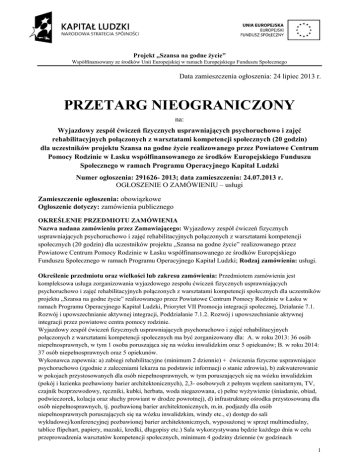 Projekt „Szansa na godne życie” Współfinansowany ze środków Unii Europejskiej w ramach Europejskiego Funduszu Społecznego Data zamieszczenia ogłoszenia: 24 lipiec 2013 r. PRZETARG NIEOGRANICZONY na: Wyjazdowy zespół ćwiczeń fizycznych usprawniających psychoruchowo i zajęć rehabilitacyjnych połączonych z warsztatami kompetencji społecznych (20 godzin) dla uczestników projektu Szansa na godne życie realizowanego przez Powiatowe Centrum Pomocy Rodzinie w Łasku współfinansowanego ze środków Europejskiego Funduszu Społecznego w ramach Programu Operacyjnego Kapitał Ludzki Numer ogłoszenia: 291626- 2013; data zamieszczenia: 24.07.2013 r. OGŁOSZENIE O ZAMÓWIENIU – usługi Zamieszczenie ogłoszenia: obowiązkowe Ogłoszenie dotyczy: zamówienia publicznego OKREŚLENIE PRZEDMIOTU ZAMÓWIENIA Nazwa nadana zamówieniu przez Zamawiającego: Wyjazdowy zespół ćwiczeń fizycznych usprawniających psychoruchowo i zajęć rehabilitacyjnych połączonych z warsztatami kompetencji społecznych (20 godzin) dla uczestników projektu „Szansa na godne życie” realizowanego przez Powiatowe Centrum Pomocy Rodzinie w Łasku współfinansowanego ze środków Europejskiego Funduszu Społecznego w ramach Programu Operacyjnego Kapitał Ludzki; Rodzaj zamówienia: usługi. Określenie przedmiotu oraz wielkości lub zakresu zamówienia: Przedmiotem zamówienia jest kompleksowa usługa zorganizowania wyjazdowego zespołu ćwiczeń fizycznych usprawniających psychoruchowo i zajęć rehabilitacyjnych połączonych z warsztatami kompetencji społecznych dla uczestników projektu „Szansa na godne życie” realizowanego przez Powiatowe Centrum Pomocy Rodzinie w Łasku w ramach Programu Operacyjnego Kapitał Ludzki, Priorytet VII Promocja integracji społecznej, Działanie 7.1. Rozwój i upowszechnianie aktywnej integracji, Poddziałanie 7.1.2. Rozwój i upowszechnianie aktywnej integracji przez powiatowe centra pomocy rodzinie. Wyjazdowy zespół ćwiczeń fizycznych usprawniających psychoruchowo i zajęć rehabilitacyjnych połączonych z warsztatami kompetencji społecznych ma być zorganizowany dla: A. w roku 2013: 36 osób niepełnosprawnych, w tym 1 osoba poruszająca się na wózku inwalidzkim oraz 5 opiekunów; B. w roku 2014: 37 osób niepełnosprawnych oraz 5 opiekunów. Wykonawca zapewnia: a) zabiegi rehabilitacyjne (minimum 2 dziennie) + ćwiczenia fizyczne usprawniające psychoruchowo (zgodnie z zaleceniami lekarza na podstawie informacji o stanie zdrowia), b) zakwaterowanie w pokojach przystosowanych dla osób niepełnosprawnych, w tym poruszających się na wózku inwalidzkim (pokój i łazienka pozbawiony barier architektonicznych), 2,3- osobowych z pełnym węzłem sanitarnym, TV, czajnik bezprzewodowy, ręczniki, kubki, herbata, woda niegazowana, c) pełne wyżywienie (śniadanie, obiad, podwieczorek, kolacja oraz słuchy prowiant w drodze powrotnej), d) infrastrukturę ośrodka przystosowaną dla osób niepełnosprawnych, tj. pozbawioną barier architektonicznych, m.in. podjazdy dla osób niepełnosprawnych poruszających się na wózku inwalidzkim, windy etc., e) dostęp do sali wykładowej/konferencyjnej pozbawionej barier architektonicznych, wyposażonej w sprzęt multimedialny, tablice flipchart, papiery, mazaki, kredki, długopisy etc.) Sala wykorzystywana będzie każdego dnia w celu przeprowadzenia warsztatów kompetencji społecznych, minimum 4 godziny dziennie (w godzinach 1 Projekt „Szansa na godne życie” Współfinansowany ze środków Unii Europejskiej w ramach Europejskiego Funduszu Społecznego wskazanych przez Zamawiającego). Warsztaty kompetencji społecznych poprowadzi trener zatrudniony przez Zamawiającego; f) całodobową opiekę medyczną, g) dowóz uczestników z Łasku do ośrodka i z ośrodka do Łasku oraz transport uczestników w miejscu pobytu zgodnie z programem dodatkowych zajęć integracyjnorozwojowych (transport z udogodnieniami dla osób niepełnosprawnych, tj. w miarę możliwości z obniżoną podłogą pojazdu i wysuwaną rampą pozwalającą na dostęp dla wózków inwalidzkich; ponadto autokar wyposażony obowiązkowo w pasy bezpieczeństwa, klimatyzację, regulowane fotele), h) polisę ubezpieczeniową dla wszystkich uczestników wyjazdu, z uwzględnieniem stanu zdrowia osób uczestniczących w wyjeździe, i) dodatkowe zajęcia integracyjno- rozwojowe obejmujące: wieczorek taneczny, ognisko z grillowaniem i muzyką, 2 x spotkanie integracyjne, wycieczka piesza ( z uwzględnieniem osoby niepełnosprawnej poruszającej się na wózku inwalidzkim), wycieczka autokarowa (zwiedzanie atrakcji turystycznych) i inne. Wykonawca zapewnia bilety wstępu, opłaty parkingowe i pokrywa inne koszty związane z organizacją zajęć integracyjno- rozwojowych. Zajęcia, o których mowa wyżej realizowane muszą być każdego dnia pobytu uczestników wyjazdu, minimum 4 godziny dziennie; j) opiekę rezydenta w miejscu i czasie realizacji zamówienia. Czas trwania wyjazdów: po 7 dni w terminach wskazanych przez Zamawiającego, tj. do 30 czerwca 2014 r. Czy przewiduje się udzielenie zamówień uzupełniających: nie. Wspólny Słownik Zamówień (CPV): 85.31.25.00-4. Czy dopuszcza się złożenie oferty częściowej: nie. Czy dopuszcza się złożenie ofert wariantowej: nie. CZAS TRWANIA ZAMÓWIENIA LUB TERMIN WYKONANIA: Zakończenie: 30.06.2014 r. INFORMACJE O CHARAKTERZE PRAWNYM, EKONOMICZNYM, FINANSOWYM I TECHNICZNYM Czy przewiduje się udzielenie zaliczek na poczet wykonania zamówienia: nie. WARUNKI UDZIAŁU W POSTĘPOWANIU ORAZ OPIS SPOSOBU DOKONYWANIA OCENY SPEŁANIANIA TYCH WARUNKÓW 1.Uprawnienia do wykonywania określonej działalności lub czynności, jeżeli przepisy prawa nakładają obowiązek ich posiadania. Opis sposobu dokonywania oceny spełniania tego warunku Zamawiający uzna, że warunek jest spełniony, jeżeli Wykonawca złoży wraz z ofertą podpisany załącznik nr 2 do SIWZ – oświadczenie o spełnianiu warun