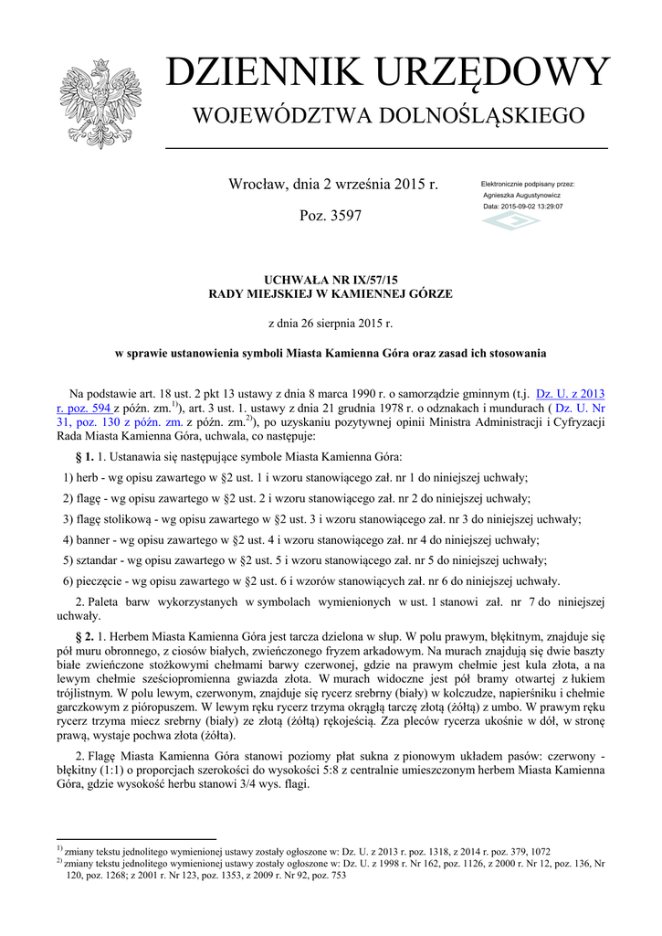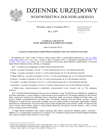DZIENNIK URZĘDOWY WOJEWÓDZTWA DOLNOŚLĄSKIEGO Wrocław, dnia 2 września 2015 r. Elektronicznie podpisany przez: Agnieszka Augustynowicz Poz. 3597 Data: 2015-09-02 13:29:07 UCHWAŁA NR IX/57/15 RADY MIEJSKIEJ W KAMIENNEJ GÓRZE z dnia 26 sierpnia 2015 r. w sprawie ustanowienia symboli Miasta Kamienna Góra oraz zasad ich stosowania Na podstawie art. 18 ust. 2 pkt 13 ustawy z dnia 8 marca 1990 r. o samorządzie gminnym (t.j. Dz. U. z 2013 r. poz. 594 z późn. zm.1)), art. 3 ust. 1. ustawy z dnia 21 grudnia 1978 r. o odznakach i mundurach ( Dz. U. Nr 31, poz. 130 z późn. zm. z późn. zm.2)), po uzyskaniu pozytywnej opinii Ministra Administracji i Cyfryzacji Rada Miasta Kamienna Góra, uchwala, co następuje: § 1. 1. Ustanawia się następujące symbole Miasta Kamienna Góra: 1) herb - wg opisu zawartego w §2 ust. 1 i wzoru stanowiącego zał. nr 1 do niniejszej uchwały; 2) flagę - wg opisu zawartego w §2 ust. 2 i wzoru stanowiącego zał. nr 2 do niniejszej uchwały; 3) flagę stolikową - wg opisu zawartego w §2 ust. 3 i wzoru stanowiącego zał. nr 3 do niniejszej uchwały; 4) banner - wg opisu zawartego w §2 ust. 4 i wzoru stanowiącego zał. nr 4 do niniejszej uchwały; 5) sztandar - wg opisu zawartego w §2 ust. 5 i wzoru stanowiącego zał. nr 5 do niniejszej uchwały; 6) pieczęcie - wg opisu zawartego w §2 ust. 6 i wzorów stanowiących zał. nr 6 do niniejszej uchwały. 2. Paleta barw wykorzystanych w symbolach wymienionych w ust. 1 stanowi zał. nr 7 do niniejszej uchwały. § 2. 1. Herbem Miasta Kamienna Góra jest tarcza dzielona w słup. W polu prawym, błękitnym, znajduje się pół muru obronnego, z ciosów białych, zwieńczonego fryzem arkadowym. Na murach znajdują się dwie baszty białe zwieńczone stożkowymi chełmami barwy czerwonej, gdzie na prawym chełmie jest kula złota, a na lewym chełmie sześciopromienna gwiazda złota. W murach widoczne jest pół bramy otwartej z łukiem trójlistnym. W polu lewym, czerwonym, znajduje się rycerz srebrny (biały) w kolczudze, napierśniku i chełmie garczkowym z pióropuszem. W lewym ręku rycerz trzyma okrągłą tarczę złotą (żółtą) z umbo. W prawym ręku rycerz trzyma miecz srebrny (biały) ze złotą (żółtą) rękojeścią. Zza pleców rycerza ukośnie w dół, w stronę prawą, wystaje pochwa złota (żółta). 2. Flagę Miasta Kamienna Góra stanowi poziomy płat sukna z pionowym układem pasów: czerwony błękitny (1:1) o proporcjach szerokości do wysokości 5:8 z centralnie umieszczonym herbem Miasta Kamienna Góra, gdzie wysokość herbu stanowi 3/4 wys. flagi. 1) 2) zmiany tekstu jednolitego wymienionej ustawy zostały ogłoszone w: Dz. U. z 2013 r. poz. 1318, z 2014 r. poz. 379, 1072 zmiany tekstu jednolitego wymienionej ustawy zostały ogłoszone w: Dz. U. z 1998 r. Nr 162, poz. 1126, z 2000 r. Nr 12, poz. 136, Nr 120, poz. 1268; z 2001 r. Nr 123, poz. 1353, z 2009 r. Nr 92, poz. 753 Dziennik Urzędowy Województwa Dolnośląskiego –2– Poz. 3597 3. Flagę stolikową Miasta Kamienna Góra stanowi pionowy płat sukna z pionowym układem pasów: czerwony - błękitny (1:1) o proporcjach szerokości do wysokości 1:2 z herbem Miasta Kamienna Góra, gdzie szerokość herbu stanowi 3/4 szer. flagi stolikowej, a środek herbu znajduje się na wysokości 1/3 flagi mierząc od góry. 4. Banner Miasta Kamienna Góra stanowi pionowy płat sukna z pionowym układem pasów: czerwony błękitny (1:1) o proporcjach szerokości do wysokości 1:4 z herbem Miasta Kamienna Góra, gdzie szerokość herbu stanowi 3/4 szer. bannera, a środek herbu znajduje się na wysokości 1/4 flagi mierząc od góry. 5. Sztandar Miasta Kamienna Góra składa się z dwóch płatów o łącznych wymiarach 110 x 100 cm obszytych złotymi frędzlami z trzech stron nie przylegających do drzewca. Na awersie sztandaru na płacie dzielonym w układzie pionowym czerwono-błękitnym (1:1) umieszczony jest herb Miasta Kamienna Góra, którego wysokość stanowi 3/5 wysokości płata bez frędzli. Nad herbem widnieje napis MIASTO, a pod herbem w łuku napis KAMIENNA GÓRA. Na lewo i prawo od herbu w górnej części daty: 1249 (data lokacji miasta) i 2015 (data ustanowienia sztandaru). Litery są złote z czarną linią konturową. Na rewersie sztandaru na płacie czerwonym znajduje się godło Rzeczypospolitej Polskiej – Orzeł Biały w koronie, którego wysokość stanowi 4/5 wysokości płata. Szarfy pocztu sztandarowego i wstęgi drzewca noszą barwy czerwoną i błękitną w proporcjach 1:1. Szarfa jest zawiązana na drzewcu w kokardę.Głowica sztandaru to złota kula . 6. Pieczęcie Miasta Kamienna Góra mają kształt okrągły i średnicę 36 mm. W środku każdej pieczęci znajduje się wewnętrzne perełkowe koło, w które wpisane jest konturowe godło Miasta Kamienna Góra. Nazwa organu i nazwa miasta są oddzielone od siebie z dwóch stron ażurowymi sześciopromiennymi gwiazdkami. W otoku majuskulny napis, odpowiednio: 1) MIASTO * KAMIENNA GÓRA *; 2) RADA MIASTA * KAMIENNA GÓRA *; 3) BURMISTRZ MIASTA * KAMIENNA GÓRA *. § 3. 1. Symbole wymienione w §1 stanowią własność Miasta Kamienna Góra i podlegają ochronie prawnej. 2. Symbole wymienione w §1 mogą być używane wyłącznie w sposób zapewniający im należytą cześć i szacunek, a sposób ich używania nie może godzić w dobre obyczaje, prestiż i interes Gminy. 3. Symbole wymienione w §1 mogą być używane tylko w kształcie, proporcjach i kolorach zgodnych ze wzorcami ustalonymi w niniejszej uchwale. 4. Dopuszcza się stosowanie jednobarwnej lub wielobarwnej stylizacji herbu w postaci płaskorzeźby, metaloplastyki lub innych dzieł artystycznych. § 4. 1. Prawo do używania symboli wymienionych w §1 przysługuje organom Gminy Miejskiej Kamienna Góra i jednostkom organizacyjnym Gminy do celów związanych z realizacją zadań statutowych. 2. Herb i flagę umieszcza się w pomieszczeniach, na budynkach i przed budynkami stanowiącymi si