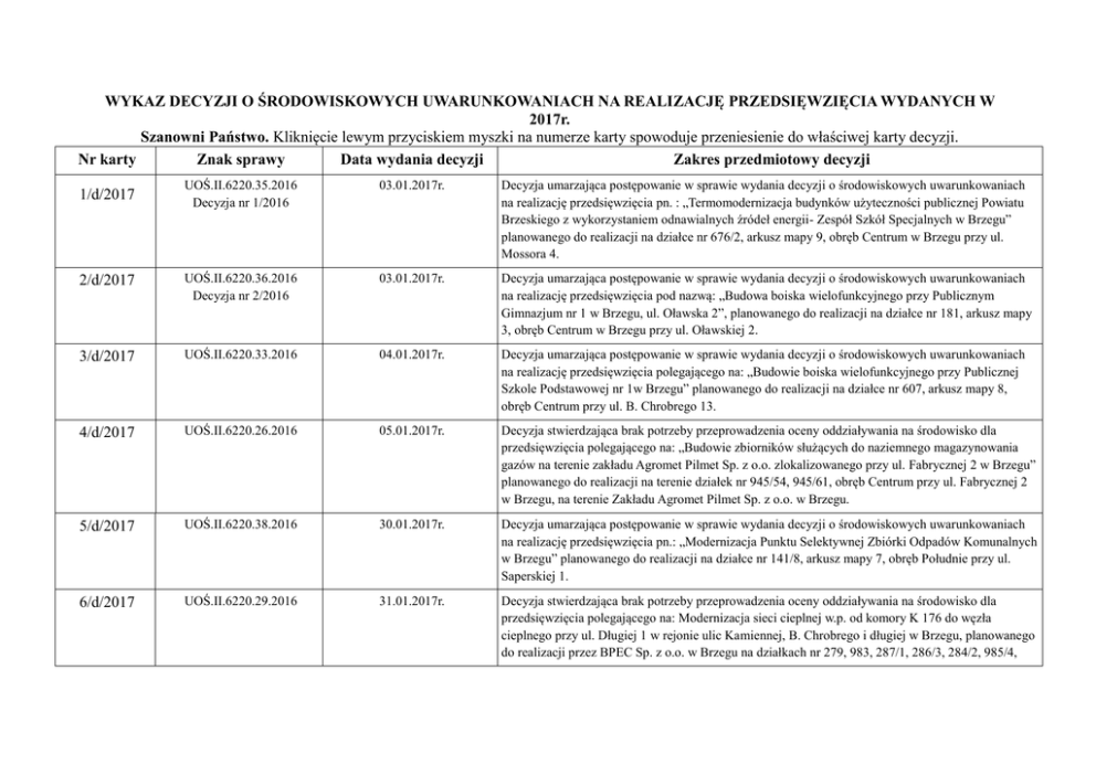 WYKAZ DECYZJI O ŚRODOWISKOWYCH UWARUNKOWANIACH NA REALIZACJĘ PRZEDSIĘWZIĘCIA WYDANYCH W 2017r. Szanowni Państwo. Kliknięcie lewym przyciskiem myszki na numerze karty spowoduje przeniesienie do właściwej karty decyzji. Nr karty Znak sprawy Data wydania decyzji Zakres przedmiotowy decyzji UOŚ.II.6220.35.2016 Decyzja nr 1/2016 03.01.2017r. Decyzja umarzająca postępowanie w sprawie wydania decyzji o środowiskowych uwarunkowaniach na realizację przedsięwzięcia pn. : „Termomodernizacja budynków użyteczności publicznej Powiatu Brzeskiego z wykorzystaniem odnawialnych źródeł energii- Zespół Szkół Specjalnych w Brzegu” planowanego do realizacji na działce nr 676/2, arkusz mapy 9, obręb Centrum w Brzegu przy ul. Mossora 4. 2/d/2017 UOŚ.II.6220.36.2016 Decyzja nr 2/2016 03.01.2017r. Decyzja umarzająca postępowanie w sprawie wydania decyzji o środowiskowych uwarunkowaniach na realizację przedsięwzięcia pod nazwą: „Budowa boiska wielofunkcyjnego przy Publicznym Gimnazjum nr 1 w Brzegu, ul. Oławska 2”, planowanego do realizacji na działce nr 181, arkusz mapy 3, obręb Centrum w Brzegu przy ul. Oławskiej 2. 3/d/2017 UOŚ.II.6220.33.2016 04.01.2017r. Decyzja umarzająca postępowanie w sprawie wydania decyzji o środowiskowych uwarunkowaniach na realizację przedsięwzięcia polegającego na: „Budowie boiska wielofunkcyjnego przy Publicznej Szkole Podstawowej nr 1w Brzegu” planowanego do realizacji na działce nr 607, arkusz mapy 8, obręb Centrum przy ul. B. Chrobrego 13. 4/d/2017 UOŚ.II.6220.26.2016 05.01.2017r. Decyzja stwierdzająca brak potrzeby przeprowadzenia oceny oddziaływania na środowisko dla przedsięwzięcia polegającego na: „Budowie zbiorników służących do naziemnego magazynowania gazów na terenie zakładu Agromet Pilmet Sp. z o.o. zlokalizowanego przy ul. Fabrycznej 2 w Brzegu” planowanego do realizacji na terenie działek nr 945/54, 945/61, obręb Centrum przy ul. Fabrycznej 2 w Brzegu, na terenie Zakładu Agromet Pilmet Sp. z o.o. w Brzegu. 5/d/2017 UOŚ.II.6220.38.2016 30.01.2017r. Decyzja umarzająca postępowanie w sprawie wydania decyzji o środowiskowych uwarunkowaniach na realizację przedsięwzięcia pn.: „Modernizacja Punktu Selektywnej Zbiórki Odpadów Komunalnych w Brzegu” planowanego do realizacji na działce nr 141/8, arkusz mapy 7, obręb Południe przy ul. Saperskiej 1. 6/d/2017 UOŚ.II.6220.29.2016 31.01.2017r. Decyzja stwierdzająca brak potrzeby przeprowadzenia oceny oddziaływania na środowisko dla przedsięwzięcia polegającego na: Modernizacja sieci cieplnej w.p. od komory K 176 do węzła cieplnego przy ul. Długiej 1 w rejonie ulic Kamiennej, B. Chrobrego i długiej w Brzegu, planowanego do realizacji przez BPEC Sp. z o.o. w Brzegu na działkach nr 279, 983, 287/1, 286/3, 284/2, 985/4, 1/d/2017 300/3, 286/1, 305/4 arkusz mapy 5, obręb Centrum przy ul. Kamiennej, Herberta, B. Chrobrego w Brzegu. 7/d/2017 UOŚ.II.6220.28.2016 01.02.2017r. Decyzja stwierdzająca brak potrzeby przeprowadzenia oceny oddziaływania na środowisko dla przedsięwzięcia polegającego na: Modernizacja sieci cieplnej wysokich parametrów od komory K148 do granicy działki nr 632/4 w rejonie ul. Piwowarskiej i Ofiar Katynia w Brzegu, planowanego do realizacji przez BPEC Sp. z o.o. w Brzegu na działkach nr 636/9, 1007, 637/1, 636/3, 636/8, 632/4, 632/3, 632/2, 641/3, 631, arkusz mapy 9, obręb Centrum przy ul. Piwowarskiej i Ofiar Katynia w Brzegu. Powrót do wykazu KARTA INFORMACYJNA Numer karty/rok Rodzaj dokumentu 1/d/2017 Decyzja Temat dokumentu Środowiskowe uwarunkowania Nazwa dokumentu Zakres przedmiotowy dokumentu – opis dokumentu Decyzja umarzająca wydanie decyzji o środowiskowych uwarunkowaniach Obszar, którego dokument dotyczy, zgodnie z podziałem administracyjnym kraju Decyzja umarzająca postępowanie w sprawie wydania decyzji o środowiskowych uwarunkowaniach na realizację przedsięwzięcia pn. : „Termomodernizacja budynków użyteczności publicznej Powiatu Brzeskiego z wykorzystaniem odnawialnych źródeł energii- Zespół Szkół Specjalnych w Brzegu” planowanego do realizacji na działce nr 676/2, arkusz mapy 9, obręb Centrum w Brzegu przy ul. Mossora 4. Gmina Brzeg Znak sprawy UOŚ.II.6220.35.2016 Dokument wytworzył Biuro Urbanistyki i Ochrony Środowiska Urząd Miasta w Brzegu ul. Robotnicza 12 Data dokumentu Dokument zatwierdził Data zatwierdzenia dokumentu 03.01.2017r. Kierownik Biura Urbanistyki i Ochrony Środowiska z upoważnienia Burmistrza 03.01.2017r. Miejsce przechowywania dokumentu Biuro Urbanistyki i Ochrony Środowiska Urząd Miasta w Brzegu ul. Robotnicza 12 Adres elektroniczny zawierający odnośnik do dokumentu Czy dokument jest ostateczny Tak Numery kart innych dokumentów w sprawie 31/w/2016, Data zamieszczenia w wykazie danych o dokumencie 04.01.2017r. Zastrzeżenia dotyczące nieudostępniania informacji Uwagi Powrót do wykazu KARTA INFORMACYJNA Numer karty/rok Rodzaj dokumentu 2/d/2017 Decyzja Temat dokumentu Środowiskowe uwarunkowania Nazwa dokumentu Zakres przedmiotowy dokumentu – opis dokumentu Decyzja umarzająca wydanie decyzji o środowiskowych uwarunkowaniach Obszar, którego dokument dotyczy, zgodnie z podziałem administracyjnym kraju Decyzja umarzająca postępowanie w sprawie wydania decyzji o środowiskowych uwarunkowaniach na realizację przedsięwzięcia pod nazwą: „Budowa boiska wielofunkcyjnego przy Publicznym Gimnazjum nr 1 w Brzegu, ul. Oławska 2”, planowanego do realizacji na działce nr 181, arkusz mapy 3, obręb Centrum w Brzegu przy ul. Oławskiej 2. Gmina Brzeg Znak sprawy UOŚ.II.6220.36.2016 Dokument wytworzył Biuro Urbanistyki i Ochrony Środowiska Urząd Miasta w Brzegu ul. Robotnicza 12 Data dokumentu Dokument zatwierdził Data zatwierdzenia dokumentu 03.01.2017r. Kierownik Biura Urbanistyki i Ochrony Środowiska z upoważnienia Burmistrza 03.01.2017r. Miejsce przechowywania dokumentu Biuro Urbanistyki i Ochrony Środowiska Urząd