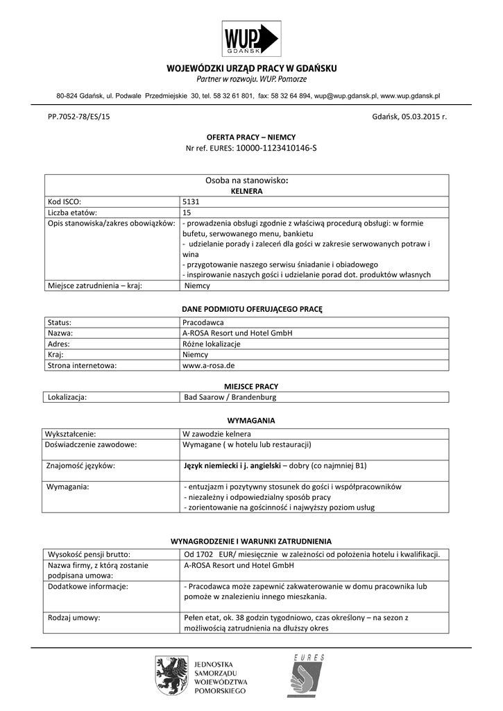 80-824 Gdańsk, ul. Podwale Przedmiejskie 30, tel. 58 32 61 801, fax: 58 32 64 894, [email protected], www.wup.gdansk.pl PP.7052-78/ES/15 Gdańsk, 05.03.2015 r. OFERTA PRACY – NIEMCY Nr ref. EURES: 10000-1123410146-S Osoba na stanowisko: KELNERA Kod ISCO: 5131 Liczba etatów: 15 Opis stanowiska/zakres obowiązków: - prowadzenia obsługi zgodnie z właściwą procedurą obsługi: w formie bufetu, serwowanego menu, bankietu - udzielanie porady i zaleceń dla gości w zakresie serwowanych potraw i wina - przygotowanie naszego serwisu śniadanie i obiadowego - inspirowanie naszych gości i udzielanie porad dot. produktów własnych Miejsce zatrudnienia – kraj: Niemcy DANE PODMIOTU OFERUJĄCEGO PRACĘ Status: Nazwa: Adres: Kraj: Strona internetowa: Pracodawca A-ROSA Resort und Hotel GmbH Różne lokalizacje Niemcy www.a-rosa.de Lokalizacja: MIEJSCE PRACY Bad Saarow / Brandenburg WYMAGANIA Wykształcenie: Doświadczenie zawodowe: W zawodzie kelnera Wymagane ( w hotelu lub restauracji) Znajomość języków: Język niemiecki i j. angielski – dobry (co najmniej B1) Wymagania: - entuzjazm i pozytywny stosunek do gości i współpracowników - niezależny i odpowiedzialny sposób pracy - zorientowanie na gościnność i najwyższy poziom usług WYNAGRODZENIE I WARUNKI ZATRUDNIENIA Wysokość pensji brutto: Nazwa firmy, z którą zostanie podpisana umowa: Dodatkowe informacje: Od 1702 EUR/ miesięcznie w zależności od położenia hotelu i kwalifikacji. A-ROSA Resort und Hotel GmbH Rodzaj umowy: Pełen etat, ok. 38 godzin tygodniowo, czas określony – na sezon z możliwością zatrudnienia na dłuższy okres - Pracodawca może zapewnić zakwaterowanie w domu pracownika lub pomoże w znalezieniu innego mieszkania. Data rozpoczęcia: Wymagane dokumenty Język, w którym muszą być sporządzone przedkładane dokumenty: Do kogo należy wysłać dokumenty: Gdzie należy wysłać dokumenty: Do uzgodnienia SPOSÓB SKŁADANIA WNIOSKU CV oraz list motywacyjny język angielski lub niemiecki Do pracodawcy i do wiadomości doradcy EURES WUP Gdańsk Dokumenty należy przesłać na adres e-mail: [email protected] oraz dw: [email protected] W tytule maila proszę wpisać „waiter” WAŻNOŚĆ Data publikacji: 06.03.2015 r. Termin przedkładania podań o pracę / zakończenia ważności oferty: 31.12.2015 r. UWAGA: 1. Umowa z zagranicznym pracodawcą zostanie zawarta zgodnie z prawem kraju zatrudnienia. Oznacza to, że wszystkie roszczenia odnośnie do warunków, które obejmuje umowa, można kierować wyłącznie do odpowiedniego sądu w kraju zatrudnienia. Publiczne służby zatrudnienia (EURES) nie mogą pośredniczyć ani reprezentować pracownika w sądzie kraju zatrudnienia w przypadku sporu z pracodawcą. 2. Publiczne służby zatrudnienia (EURES) dokładają wszelkich starań, aby zapewnić rzetelność i wiarygodność ofert pracy zgłoszonych w lokalnym urzędzie pracy. Należy wyjaśnić, że oferta pracy została zgłoszona przez stronę trzecią i EURES nie odpowiada za ewentualne rozbieżności między warunkami pracy określonymi w ofercie pracy i warunkami oferowanymi przez potencjalnego pracodawcę. 3. Publiczne służby zatrudnienia (EURES) informują, że będą zbierać, przetwarzać i przekazywać potencjalnym pracodawcom zgodnie z przepisami dotyczącymi ochrony danych osobowych wszystkie dane osobowe dostarczone przez osoby poszukujące pracy.
