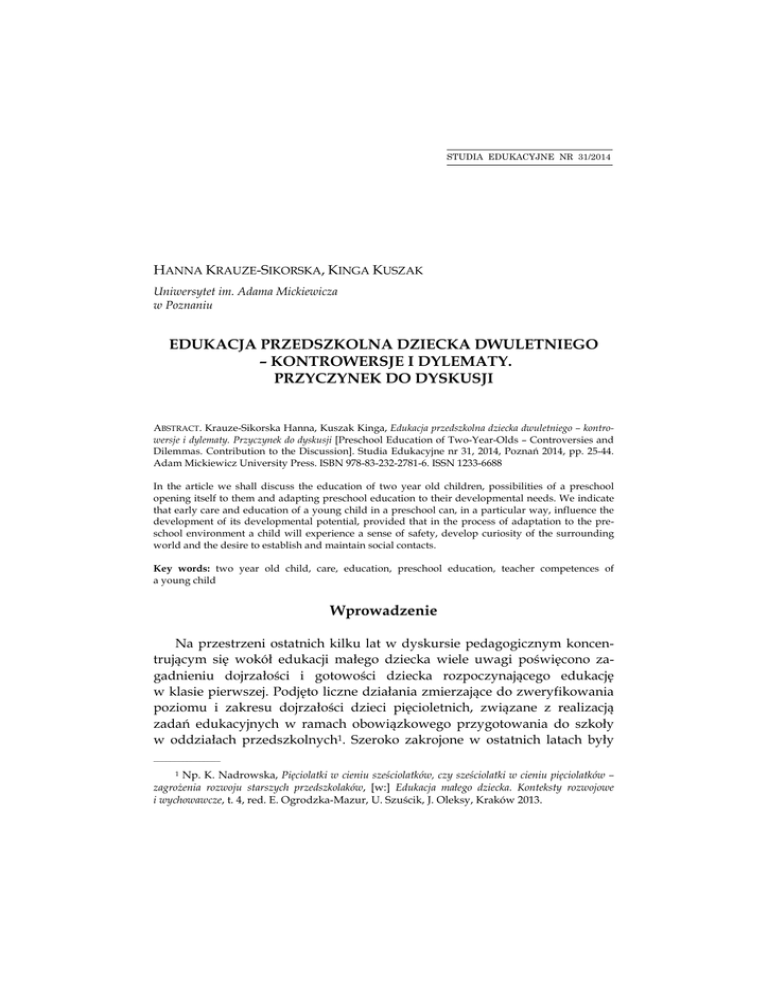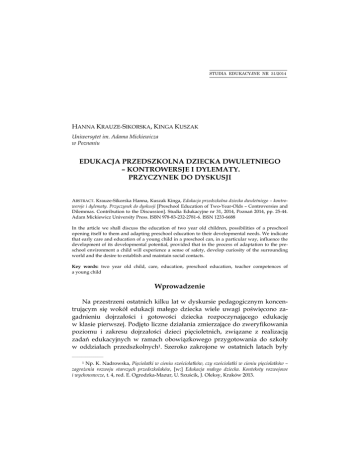 STUDIA EDUKACYJNE NR 31/2014 HANNA KRAUZE-SIKORSKA, KINGA KUSZAK Uniwersytet im. Adama Mickiewicza w Poznaniu EDUKACJA PRZEDSZKOLNA DZIECKA DWULETNIEGO – KONTROWERSJE I DYLEMATY. PRZYCZYNEK DO DYSKUSJI ABSTRACT. Krauze-Sikorska Hanna, Kuszak Kinga, Edukacja przedszkolna dziecka dwuletniego – kontrowersje i dylematy. Przyczynek do dyskusji [Preschool Education of Two-Year-Olds – Controversies and Dilemmas. Contribution to the Discussion]. Studia Edukacyjne nr 31, 2014, Poznań 2014, pp. 25-44. Adam Mickiewicz University Press. ISBN 978-83-232-2781-6. ISSN 1233-6688 In the article we shall discuss the education of two year old children, possibilities of a preschool opening itself to them and adapting preschool education to their developmental needs. We indicate that early care and education of a young child in a preschool can, in a particular way, influence the development of its developmental potential, provided that in the process of adaptation to the preschool environment a child will experience a sense of safety, develop curiosity of the surrounding world and the desire to establish and maintain social contacts. Key words: two year old child, care, education, preschool education, teacher competences of a young child Wprowadzenie Na przestrzeni ostatnich kilku lat w dyskursie pedagogicznym koncentrującym się wokół edukacji małego dziecka wiele uwagi poświęcono zagadnieniu dojrzałości i gotowości dziecka rozpoczynającego edukację w klasie pierwszej. Podjęto liczne działania zmierzające do zweryfikowania poziomu i zakresu dojrzałości dzieci pięcioletnich, związane z realizacją zadań edukacyjnych w ramach obowiązkowego przygotowania do szkoły w oddziałach przedszkolnych1. Szeroko zakrojone w ostatnich latach były ________________ 1 Np. K. Nadrowska, Pięciolatki w cieniu sześciolatków, czy sześciolatki w cieniu pięciolatków – zagrożenia rozwoju starszych przedszkolaków, [w:] Edukacja małego dziecka. Konteksty rozwojowe i wychowawcze, t. 4, red. E. Ogrodzka-Mazur, U. Szuścik, J. Oleksy, Kraków 2013. 26 Hanna Krauze-Sikorska, Kinga Kuszak też badania nad dziećmi sześcioletnimi, realizowane w kontekście najpierw zapowiadanej, później stopniowo wdrażanej reformy edukacji, której konsekwencją było wzbudzające wiele kontrowersji wśród pedagogów i rodziców obniżenie wieku szkolnego dzieci2. Weryfikacjom empirycznym towarzyszyły, i ciągle towarzyszą, próby konstruowania rozwiązań praktycznych zmierzających do: – (bardziej efektywnego/bezpiecznego) przygotowania dziecka do podjęcia roli ucznia na terenie przedszkola; – (bardziej efektywnego/bezpiecznego) badania poziomu dojrzałości/gotowości dzieci przedszkolnych do podjęcia nauki w klasie pierwszej; – (bardziej efektywnego) przygotowania nauczyciela przedszkola do pracy z dzieckiem pięcioletnim; – (bardziej efektywnego) przygotowania nauczyciela do pracy z młodszym uczniem; – (bardziej efektywnego/bezpiecznego) przygotowania rodzica do rozumienia potrzeb i możliwości dziecka – małego ucznia; – (bardziej efektywnego/bezpiecznego) przygotowania szkoły – właściwa aranżacja przestrzeni klasy, dostosowanie toalet, korytarzy, świetlic, placów zabaw do potrzeb dzieci młodszych, dobór właściwego podręcznika itp. W dyskursie tym zdecydowanie dominuje nurt narracji koncentrujących się wokół kompetencji i efektywności nauczyciela oraz zapewnienia bezpieczeństwa dziecku i jego rodzicom. Ten bez wątpienia istotny obszar dokonujących się zmian w systemie edukacji nie jest jednak jedynym obszarem, w którym zachodzą aktualnie ważne i potrzebne zmiany. Część z nich pozostaje jednak poza głównym nurtem zainteresowań władz oświatowych, teoretyków i praktyków edukacji. Naszym zamierzeniem jest podjęcie dyskusji nad zagadnieniem podejmowanym niejako przy okazji, na marginesie rozważań nad kwestią obniżenia wieku szkolnego dzieci. W niniejszym artykule zamierzamy skoncentrować naszą uwagę na zagadnieniu edukacji przedszkolnej dzieci najmłodszych – dwuletnich. Nasze wieloletnie doświadczenia skupione wokół zagadnień edukacji elementarnej skłaniają nas do podjęcia refleksji nad możliwościami otwarcia się przedszkola na dzieci młodsze i dostosowania edukacji przedszkolnej do potrzeb rozwojowych dzieci dwuletnich. ________________ 2 Np. A. Kopik i in., Rekomendacje dla praktyki edukacyjnej. Droga edukacyjna sześciolatków – szkoła czy przedszkole, Warszawa 2011; R. Kaczan, P. Rycielski, Co wiemy o sześciolatkach w szkole na podstawie badań? Warszawa 2014. Edukacja przedszkolna dziecka dwuletniego – kontrowersje i dylematy 27 Europejska strategia usług dla najmłodszych – założenia W obecnym ogólnoeuropejskim dyskursie podejmowanym wokół zagadnienia opieki i edukacji dzieci najmłodszych wyraźnie daje się zauważyć tendencja do upowszechniania oferty edukacyjnej skierowanej do dzieci młodszych. W dokumentach ogólnoeuropejskich3 można znaleźć takie, które podejmują zagadnienie „usług dla najmłodszych”, a więc dotyczą dzieci, które nie są jeszcze objęte obowiązkiem szkolnym4. Wśród aktualnych założeń europejskiej strategii usług dla najmłodszych (od 0 do 6 roku życia) wskazano kwestie, które wyznaczają ramy dla rozwiązań najbardziej optymalnych na poziomie poszczególnych krajów członkowskich Unii Europejskiej. Założenia te mają postać bardzo ogólnych tez, które odnoszą się do następujących kwestii: 1. Dostępności miejsc dla wszystkich dzieci niezależnie od miejsca zamieszkania i statusu społeczno-ekonomicznego rodziców. 2. Przystępności wszystkich usług skierowanych na zaspokojenie potrzeb edukacyjnych małego dziecka, które powinny być finansowane z budżetu państwa. 3. Wszechstronności i holizmu jako podstawy edukacji najmłodszych. 4. Współpracy polegającej na aktywnym zaangażowaniu lokalnej społeczności w działania na rzecz najmłodszych. 5. Spój