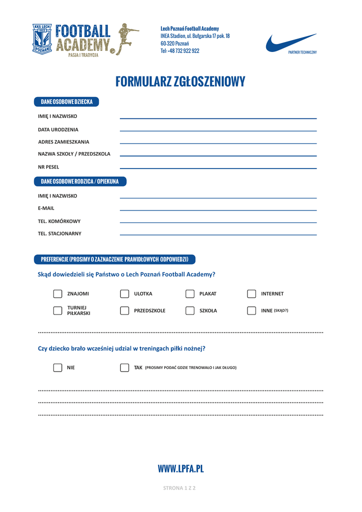 Lech Poznań Football Academy INEA Stadion, ul. Bułgarska 17 pok. 18 60-320 Poznań Tel: +48 732 922 922 PARTNER TECHNICZNY FORMULARZ ZGŁOSZENIOWY DANE OSOBOWE DZIECKA IMIĘ I NAZWISKO DATA URODZENIA ADRES ZAMIESZKANIA NAZWA SZKOŁY / PRZEDSZKOLA NR PESEL DANE OSOBOWE RODZICA / OPIEKUNA IMIĘ I NAZWISKO E-MAIL TEL. KOMÓRKOWY TEL. STACJONARNY PREFERENCJE (PROSIMY O ZAZNACZENIE PRAWIDŁOWYCH ODPOWIEDZI) Skąd dowiedzieli się Państwo o Lech Poznań Football Academy? ZNAJOMI ULOTKA PLAKAT INTERNET TURNIEJ PIŁKARSKI PRZEDSZKOLE SZKOŁA INNE (SKĄD?) ................................................................................................................................................................ NIE TAK (PROSIMY PODAĆ GDZIE TRENOWAŁO I JAK DŁUGO) ................................................................................................................................................................ ................................................................................................................................................................ ................................................................................................................................................................ WWW.LPFA.PL STRONA 1 Z 2 Lech Poznań Football Academy INEA Stadion, ul. Bułgarska 17 pok. 18 60-320 Poznań Tel: +48 732 922 922 PARTNER TECHNICZNY Prosimy o podanie informacji o stanie zdrowia dziecka UCZULENIA NIE TAK (PROSIMY NAPISAĆ NA CO) ................................................................................................................................................................ ................................................................................................................................................................ ................................................................................................................................................................ CHOROBY NIE TAK (JAKIE?) ................................................................................................................................................................ ................................................................................................................................................................ ................................................................................................................................................................ INNE PRZECIWWSKAZANIA DO PODJĘCIA TRENINGÓW NIE TAK (JAKIE?) ................................................................................................................................................................ ................................................................................................................................................................ ................................................................................................................................................................ Oświadczenie rodzica / opiekuna 1. wyrażam zgodę na przetwarzanie danych osobowych opiekuna oraz danych osobowych dziecka wyżej podanych przez Fundację Lech Poznań Football Academy w zakresie realizacji umowy o świadczenie usługi w postaci zajęć piłkarskich, organizacji wyjazdów szkoleniowych oraz na zawody sportowe, prowadzenia rejestrów postępów szkoleniowych zgodnie z Ustawą o Ochronie Danych Osobowych z dnia 29 sierpnia 1997 r. (Dz. U. Nr 101, poz. 926). 2. wyrażam zgodę Fundacji Lech Poznań Football Academy na przesyłanie informacji handlowych o nowych ofertach zgodnie z art. 10 ust. 2 Ustawy o świadczeniu usług drogą elektroniczną z dnia 18 lipca 2002 r. (Dz. U. Nr 144, poz. 1204). MIEJSCOWOŚĆ / DATA CZYTELNY PODPIS RODZICA / OPIEKUNA WWW.LPFA.PL STRONA 2 Z 2