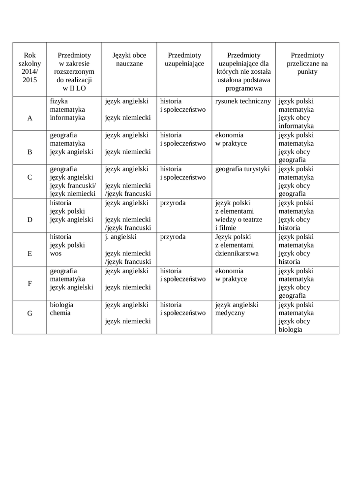 Rok szkolny 2014/ 2015 Przedmioty w zakresie rozszerzonym do realizacji w II LO Języki obce nauczane Przedmioty uzupełniające Przedmioty uzupełniające dla których nie została ustalona podstawa programowa historia i społeczeństwo rysunek techniczny historia i społeczeństwo ekonomia w praktyce historia i społeczeństwo geografia turystyki język niemiecki /język francuski język angielski przyroda język niemiecki /język francuski j. angielski przyroda język polski z elementami wiedzy o teatrze i filmie Język polski z elementami dziennikarstwa język angielski A fizyka matematyka informatyka język angielski B geografia matematyka język angielski język angielski D geografia język angielski język francuski/ język niemiecki historia język polski język angielski E historia język polski wos C F G geografia matematyka język angielski biologia chemia język niemiecki język niemiecki język niemiecki /język francuski język angielski historia i społeczeństwo ekonomia w praktyce historia i społeczeństwo język angielski medyczny język niemiecki język angielski język niemiecki Przedmioty przeliczane na punkty język polski matematyka język obcy informatyka język polski matematyka język obcy geografia język polski matematyka język obcy geografia język polski matematyka język obcy historia język polski matematyka język obcy historia język polski matematyka język obcy geografia język polski matematyka język obcy biologia