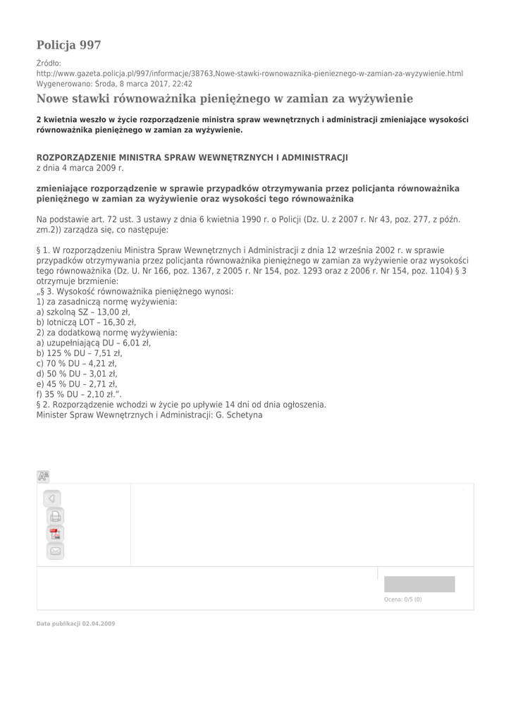 Policja 997 Źródło: http://www.gazeta.policja.pl/997/informacje/38763,Nowe-stawki-rownowaznika-pienieznego-w-zamian-za-wyzywienie.html Wygenerowano: Środa, 8 marca 2017, 22:42 Nowe stawki równoważnika pieniężnego w zamian za wyżywienie 2 kwietnia weszło w życie rozporządzenie ministra spraw wewnętrznych i administracji zmieniające wysokości równoważnika pieniężnego w zamian za wyżywienie. ROZPORZĄDZENIE MINISTRA SPRAW WEWNĘTRZNYCH I ADMINISTRACJI z dnia 4 marca 2009 r. zmieniające rozporządzenie w sprawie przypadków otrzymywania przez policjanta równoważnika pieniężnego w zamian za wyżywienie oraz wysokości tego równoważnika Na podstawie art. 72 ust. 3 ustawy z dnia 6 kwietnia 1990 r. o Policji (Dz. U. z 2007 r. Nr 43, poz. 277, z późn. zm.2)) zarządza się, co następuje: § 1. W rozporządzeniu Ministra Spraw Wewnętrznych i Administracji z dnia 12 września 2002 r. w sprawie przypadków otrzymywania przez policjanta równoważnika pieniężnego w zamian za wyżywienie oraz wysokości tego równoważnika (Dz. U. Nr 166, poz. 1367, z 2005 r. Nr 154, poz. 1293 oraz z 2006 r. Nr 154, poz. 1104) § 3 otrzymuje brzmienie: „§ 3. Wysokość równoważnika pieniężnego wynosi: 1) za zasadniczą normę wyżywienia: a) szkolną SZ – 13,00 zł, b) lotniczą LOT – 16,30 zł, 2) za dodatkową normę wyżywienia: a) uzupełniającą DU – 6,01 zł, b) 125 % DU – 7,51 zł, c) 70 % DU – 4,21 zł, d) 50 % DU – 3,01 zł, e) 45 % DU – 2,71 zł, f) 35 % DU – 2,10 zł.”. § 2. Rozporządzenie wchodzi w życie po upływie 14 dni od dnia ogłoszenia. Minister Spraw Wewnętrznych i Administracji: G. Schetyna Ocena: 0/5 (0) Data publikacji 02.04.2009