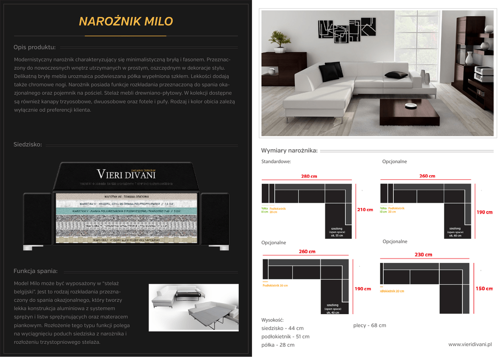 NAROŻNIK MILO Opis produktu: Modernistyczny narożnik charakteryzujący się minimalistyczną bryłą i fasonem. Przeznaczony do nowoczesnych wnętrz utrzymanych w prostym, oszczędnym w dekoracje stylu. Delikatną bryłę mebla urozmaica podwieszana półka wypełniona szkłem. Lekkości dodają także chromowe nogi. Narożnik posiada funkcje rozkładania przeznaczoną do spania okazjonalnego oraz pojemnik na pościel. Stelaż mebli drewniano-płytowy. W kolekcji dostępne są również kanapy trzyosobowe, dwuosobowe oraz fotele i pufy. Rodzaj i kolor obicia zależą wyłącznie od preferencji klienta. Siedzisko: Wymiary narożnika: Standardowe: Opcjonalne Opcjonalne Opcjonalne Funkcja spania: Model Milo może być wyposażony w “stelaż belgijski”. Jest to rodzaj rozkładania przeznaczony do spania okazjonalnego, który tworzy lekka konstrukcja aluminiowa z systemem sprężyn i listw sprężynujących oraz materacem piankowym. Rozłożenie tego typu funkcji polega na wyciągnięciu poduch siedziska z narożnika i rozłożeniu trzystopniowego stelaża. Wysokość: siedzisko - 44 cm plecy - 68 cm podłokietnik - 51 cm półka - 28 cm www.vieridivani.pl
