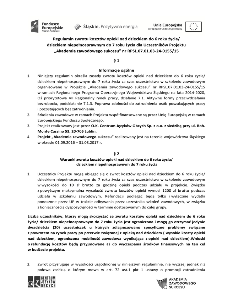 Regulamin zwrotu kosztów opieki nad dzieckiem do 6 roku życia/ dzieckiem niepełnosprawnym do 7 roku życia dla Uczestników Projektu „Akademia zawodowego sukcesu” nr RPSL.07.01.03-24-0155/15 §1 Informacje ogólne 1. 2. 3. 4. Niniejszy regulamin określa zasady zwrotu kosztów opieki nad dzieckiem do 6 roku życia/ dzieckiem niepełnosprawnym do 7 roku życia za czas uczestnictwa w szkoleniu zawodowym organizowane w Projekcie „Akademia zawodowego sukcesu” nr RPSL.07.01.03-24-0155/15 w ramach Regionalnego Programu Operacyjnego Województwa Śląskiego na lata 2014-2020, Oś priorytetowa VII Regionalny rynek pracy, działanie 7.1. Aktywne formy przeciwdziałania bezrobociu, poddziałanie 7.1.3. Poprawa zdolności do zatrudnienia osób poszukujących pracy i pozostających bez zatrudnienia. Szkolenia zawodowe w ramach Projektu współfinansowane są przez Unię Europejską w ramach Europejskiego Funduszu Społecznego. Projekt realizowany jest przez O.K. Centrum Języków Obcych Sp. z o.o. z siedzibą przy ul. Boh. Monte Cassino 53, 20-705 Lublin. Projekt „Akademia zawodowego sukcesu” realizowany jest na terenie województwa śląskiego w okresie 01.09.2016 – 31.08.2017 r. §2 Warunki zwrotu kosztów opieki nad dzieckiem do 6 roku życia/ dzieckiem niepełnosprawnym do 7 roku życia 1. Uczestnicy Projektu mogą ubiegać się o zwrot kosztów opieki nad dzieckiem do 6 roku życia/ dzieckiem niepełnosprawnym do 7 roku życia za czas uczestnictwa w szkoleniu zawodowym w wysokości do 10 zł brutto za godzinę opieki podczas udziału w projekcie. Związku z powyższym maksymalna wysokość zwrotu kosztów opieki wynosi 1200 zł brutto podczas udziału w szkoleniu zawodowym. Refundacji podlegać będą tylko i wyłącznie wydatki ponoszone przez UP w trakcie odbywania przez uczestnika szkoleń zawodowych, w związku z koniecznością dyspozycyjności w terminie dostosowanym do całej grupy. Liczba uczestników, którzy mogą skorzystać ze zwrotu kosztów opieki nad dzieckiem do 6 roku życia/ dzieckiem niepełnosprawnym do 7 roku życia jest ograniczona i mogą go otrzymać jedynie dwadzieścia (20) uczestniczek u których zdiagnozowano specyficzne problemy związane z powrotem na rynek pracy po przerwie związanej z opieką nad dzieckiem ( wysokie koszty opieki nad dzieckiem, ograniczona mobilność zawodowa wynikająca z opieki nad dzieckiem).Wnioski o refundację kosztów będą przyjmowane aż do wyczerpania środków finansowych na ten cel w budżecie projektu. 2. Zwrot przysługuje w wysokości uzgodnionej w niniejszym regulaminie, nie wyższej jednak niż połowa zasiłku, o którym mowa w art. 72 ust.1 pkt 1 ustawy o promocji zatrudnienia i instytucjach rynku pracy, na każde dziecko, na opiekę, którego poniesiono koszty, w danym miesiącu. 3. Uczestnik projektu ma prawo do uzyskania zwrotu kosztów opieki nad jednym dzieckiem. W wyjątkowych przypadkach uczestnik może otrzymać zwrot kosztów opieki nad większą liczbą dzieci, pod warunkiem spełnienia wszystkich warunków określonych w niniejszych zasadach oraz dostępności środków w budżecie Projektu, przeznaczonych na ten cel. 4. Zwrot kosztów opieki nad dzieckiem do 6 roku życia/ dzieckiem niepełnosprawnym do 7 roku życia może nastąpić w następujących formach: zwrot kosztów zatrudnienia opiekuna (z wyłączeniem osób blisko spokrewnionych z Uczestnikiem, w szczególności współmałżonkiem i osób pozostających z Uczestnikiem we wspólnym gospodarstwie domowym /Osoba w stopniu pokrewieństwa wynikająca z art. 14 ust. 3 pkt. 1 ustawy z dnia 28 lipca 1983 r. o podatku od spadków i darowizn \tekst jedn.: Dz. U. z 2004 r., Nr 142, poz. 1514 z późn. zm). Stopień pokrewieństwa wskazany w art. 14 ust. 3 pkt. 1 w/w Ustawy to: małżonek, zstępni, wstępni, pasierb, zięć, synowa, rodzeństwa, ojczym, macocha, teściowie/ – 5. 6. koszt wynikający z umów cywilnoprawnych, zwrot kosztów usług świadczonych przez przedszkole/żłobek lub inną instytucję uprawnioną do sprawowania opieki nad dziećmi. Uczestnik projektu, ubiegający się o zwrot kosztów opieki nad dzieckiem do 6 roku życia/ dzieckiem niepełnosprawnym do 7 roku życia sam wskazuje osoby sprawujące opiekę. Projektodawca nie ponosi odpowiedzialności za opiekuna. Zwroty poniesionych kosztów dokonywane będą na wnioski Uczestników Projektu. Formularze wniosków są dostępne na stronie internetowej projektu http://projektyokcjo.pl/akademiazawodowego-sukcesu/ oraz w Biurze Projektu: ul. Cieszyńska 367, 43-382 Bielsko-Biała. Wnioski należy składać osobiście bądź listownie do Biura Projektu – każdorazowo za każdy miesiąc uczestnictwa w kursie – do 10 dnia miesiąca następującego po miesiącu, za który jest składany wniosek. §3 Dokumenty Koszty zatrudnienia opiekuna Uczestnikom Projektu przysługuje zwrot kosztów na podstawie przedstawionych dokumentów potwierdzających faktycznie poniesione koszty opieki nad dzieckiem przez okres uczestnictwa w szkoleniu zawodowym, jednak nie więcej niż 10 zł brutto za godzinę opieki podczas udziału w projekcie. Koszty opieki nad dzieckiem zostają wyliczone proporcjonalnie do liczby godzin udziału w szkoleniu. Wymagane dokumenty: 1) poprawnie wypełniony wniosek Uczestnika Projektu o zwrot kosztów opieki nad dzieckiem do 6 roku życia/ dzieckiem niepełnosprawnym do 7 roku życia, 2) kserokopię aktualnego orzeczenia o niepełnosprawności dziecka (jeśli dotyczy), 3) kserokopia umowy cywilnoprawnej z opiekunem zawierająca informację za jaki okres obowiązuje (okres powinien pokrywać się z okresem uczestnictwa w szkoleniu) tak, aby można było zidentyfikować stawkę brutto za godzinę opieki (z dopiskiem „Potwierdzam za zgodność z oryginałem (imię i nazwisko, podpis UP)”, 4) kserokopia rachunku/faktury (za każdy miesiąc) z dopiskiem „Potwierdzam za zgodność z oryginałem (imię i nazwisko, podpis UP)”, 5) dowód dokonania zapłaty rachun