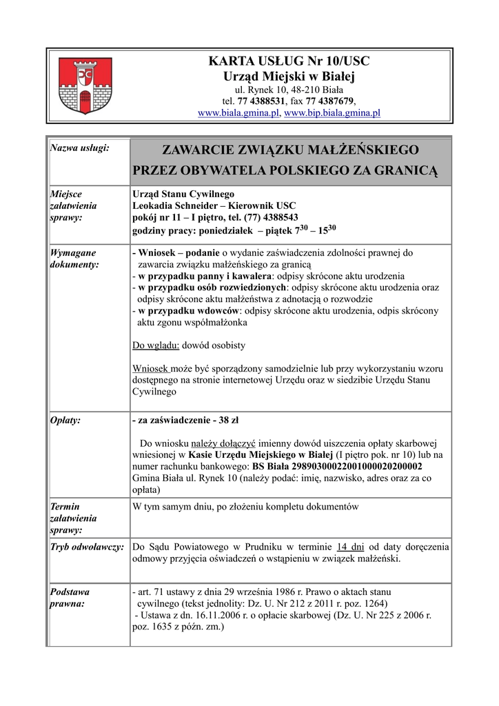 KARTA USŁUG Nr 10/USC Urząd Miejski w Białej ZAWARCIE