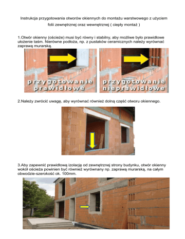 Instrukcja przygotowania otworów okiennych do montażu warstwowego z użyciem folii zewnętrznej oraz wewnętrznej ( ciepły montaż ) 1.Otwór okienny (ościeże) musi być równy i stabilny, aby możliwe było prawidłowe ułożenie taśm. Nierówne podłoża, np. z pustaków ceramicznych należy wyrównać zaprawą murarską. 2.Należy zwrócić uwagę, aby wyrównać również dolną część otworu okiennego. 3.Aby zapewnić prawidłową izolację od zewnętrznej strony budynku, otwór okienny wokół ościeża powinien być również wyrównany np. zaprawą murarską, na całym obwodzie-szerokość ok. 100mm. 4.Poniżej zdjęcie przedstawiające prawidłowo przygotowane otwory do montażu warstwowego z użyciem folii zewnętrznej oraz wewnętrznej . Z poważaniem Firma Bralbud