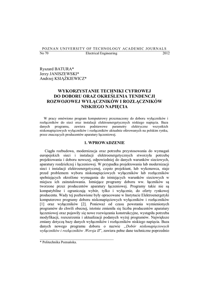 P O Z N A N UN I VE RS I T Y O F T E C HN O L O G Y ACA D E MI C J O URN A L S No 70 Electrical Engineering 2012 Ryszard BATURA* Jerzy JANISZEWSKI* Andrzej KSIĄŻKIEWICZ* WYKORZYSTANIE TECHNIKI CYFROWEJ DO DOBORU ORAZ OKREŚLENIA TENDENCJI ROZWOJOWEJ WYŁĄCZNIKÓW I ROZŁĄCZNIKÓW NISKIEGO NAPIĘCIA W pracy omówiono program komputerowy przeznaczony do doboru wyłączników i rozłączników do sieci oraz instalacji elektroenergetycznych niskiego napięcia. Baza danych programu, zawiera podstawowe parametry elektryczne wszystkich niskonapięciowych wyłączników i rozłączników aktualnie oferowanych na polskim rynku, przez znaczących producentów aparatury łączeniowej. 1. WPROWADZENIE Ciągła rozbudowa, modernizacja oraz potrzeba przystosowania do wymagań europejskich sieci i instalacji elektroenergetycznych stworzyła potrzebę projektowania i doboru nowszej, odpowiedniej do danych warunków sieciowych, aparatury rozdzielczej i łączeniowej. W przypadku projektowania lub modernizacji sieci i instalacji elektroenergetycznej, często projektant, lub wykonawca, staje przed problemem wyboru niskonapięciowych wyłączników lub rozłączników spełniających określone wymagania do istniejących warunków sieciowych w miejscu ich zainstalowania. Istniejące programy doboru ww. łączników są tworzone przez producentów aparatury łączeniowej. Programy takie nie są kompatybilne i ograniczają wybór, tylko i wyłącznie, do oferty rynkowej producenta. Wady tej pozbawione były opracowane w Instytucie Elektroenergetyki komputerowe programy doboru niskonapięciowych wyłączników i rozłączników [1] oraz wyłączników [2]. Ponieważ od czasu powstania wymienionych programów do chwili obecnej, istotnie zmieniła się liczba producentów aparatury łączeniowej oraz pojawiły się nowe rozwiązania konstrukcyjne, wystąpiła potrzeba modyfikacji, rozszerzenia i aktualizacji podanych wyżej programów. Największe zmiany dotyczą bazy danych wyłączników i rozłączników niskiego napięcia. Baza danych nowego programu doboru o nazwie „Dobór niskonapięciowych wyłączników i rozłączników .Wersja II”, zawiera pełne dane techniczne poprzednio __________________________________________ * Politechnika Poznańska. 106 Ryszard Batura, Jerzy Janiszewski, Andrzej Książkiewicz i aktualnie oferowanych na polskim rynku wyłączników i rozłączników niskiego napięcia [312]. Opracowany program ułatwia nie tylko wybór odpowiedniego wyłącznika i rozłącznika niskiego napięcia, nie ogranicza wybór do produktów jednego producenta, ale pozwala też określić tendencję zmian w konstrukcji, zdolności i trwałości łączeniowej. 2. PODSTAWOWE DANE I OPIS PROGRAMU Program „Dobór niskonapięciowych wyłączników i rozłączników. Wersja II” opracowany został w języku Borland Delphi z osobnym programem instalacyjnym. Wymieniony program pozwala: utworzyć i zapisać w pamięci komputera zbiór danych katalogowych wyłączników i rozłączników niskiego napięcia; dla podanych parametrów technicznych, z odpowiedniego zbioru, dokonać doboru wyłączników lub rozłączników posiadających żądane parametry techniczne; wykonać wydruk danych katalogowych wybranego łącznika (-ów). Różna liczba parametrów technicznych wyłączników i rozłączników podanych w katalogach producentów [312] aparatury łączeniowej sprawiła, że w programie przyjęto uproszczenie polegające na ograniczeniu się do parametrów uznanych za podstawowe. W przypadku wyłączników za podstawowe parametry doboru uznano: Bieg. - liczbę biegunów, Ue - napięcie znamionowe łączeniowe (dla którego podano prąd znamionowy wyłączalny zwarciowy graniczny), Ui - napięcie znamionowe izolacji, Uimp - wytrzymywane napięcie udarowe 1,2/50 μs, In - prąd znamionowy, Icu - prąd znamionowy wyłączalny zwarciowy graniczny, Ics - prąd znamionowy wyłączalny zwarciowy eksploatacyjny, Icw - prąd znamionowy krótkotrwały wytrzymywany, natomiast w przypadku rozłączników: Bieg. - liczbę biegunów, Ue - napięcie znamionowe łączeniowe (dla którego podano znamionowy prąd łączeniowy Ie), Ui - napięcie znamionowe izolacji, Uimp - wytrzymywane napięcie udarowe 1,2/50 μs, In - prąd znamionowy, Ie - znamionowy prąd łączeniowy (oznaczony symbolem Iest dla prądu stałego i Iezm dla prądu zmiennego), Icm - znamionowy prąd załączalny, Icw - prąd znamionowy krótkotrwały wytrzymywany. Wykorzystanie techniki cyfrowej do doboru oraz określenia tendencji ... 107 W danych wyłączników podane są także nastawy regulacyjne wyzwalaczy przeciążeniowych i zwarciowych, pozwalające na kształtowanie charakterystyki czasowo-prądowej wyzwalaczy odpowiedniej dla uzyskania, pełnej lub częściowej, selektywnej współpracy zabezpieczeń przetężeniowych zainstalowanych w obwodach zasilających, odbiorczych lub zasilających i odbiorczych. Program składa się z programu instalacyjnego oraz programu właściwego z plikami katalogowymi danych łączników zapisanych w formacie Paradox. Zastosowany format zapisu danych katalogowych, umożliwia ich wymianę z innymi programami bazo-danymi. Po zainstalowaniu i uruchomieniu programu na ekranie pojawi się właściwa aplikacja zawierająca rozwijane menu: Katalogi, Analiza, Drukarka , WWW, Informacje, Zamknij oraz przyciski szybkiego otwierania okien najważniejszych funkcji programu (rys. 1). Przycisk: - Dodaj WYŁ/ROZŁ pozwala na tworzenie nowego katalogu, odpowiednio, wyłączników lub rozłączników, - Edytuj służy do dodawania nowych wyłączników lub rozłączników do istniejących katalogów oraz modyfikację zapisanych danych, - Analiza WYŁ/ROZŁ przeznaczony jest do selekcji bazy danych wyłączników/rozłączników według zadanych przez użytkownika parametrów doboru, - Zamknij pozwala na szybkie zamknięcie programu. Rys. 1. Widok ekranu po uruchomieniu programu Menu Katalogi (rys. 2) zawiera dwie opcje zwią