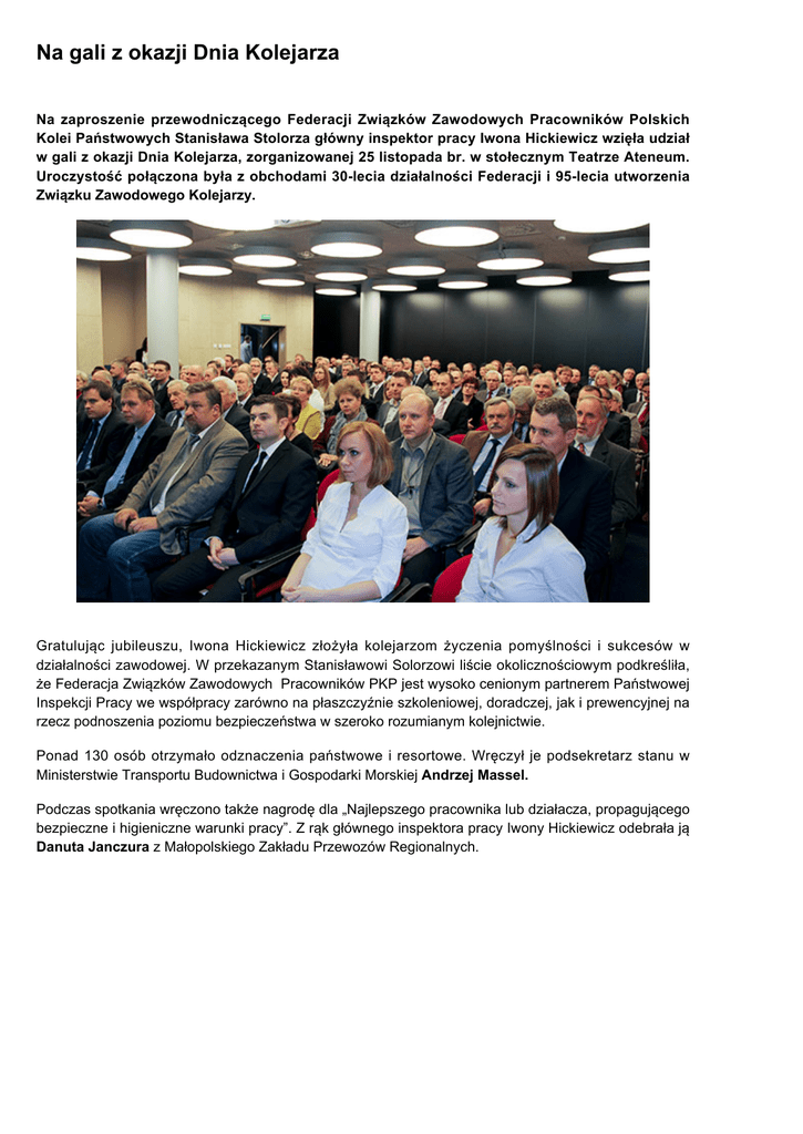 Na gali z okazji Dnia Kolejarza Na zaproszenie przewodniczącego Federacji Związków Zawodowych Pracowników Polskich Kolei Państwowych Stanisława Stolorza główny inspektor pracy Iwona Hickiewicz wzięła udział w gali z okazji Dnia Kolejarza, zorganizowanej 25 listopada br. w stołecznym Teatrze Ateneum. Uroczystość połączona była z obchodami 30-lecia działalności Federacji i 95-lecia utworzenia Związku Zawodowego Kolejarzy. Gratulując jubileuszu, Iwona Hickiewicz złożyła kolejarzom życzenia pomyślności i sukcesów w działalności zawodowej. W przekazanym Stanisławowi Solorzowi liście okolicznościowym podkreśliła, że Federacja Związków Zawodowych Pracowników PKP jest wysoko cenionym partnerem Państwowej Inspekcji Pracy we współpracy zarówno na płaszczyźnie szkoleniowej, doradczej, jak i prewencyjnej na rzecz podnoszenia poziomu bezpieczeństwa w szeroko rozumianym kolejnictwie. Ponad 130 osób otrzymało odznaczenia państwowe i resortowe. Wręczył je podsekretarz stanu w Ministerstwie Transportu Budownictwa i Gospodarki Morskiej Andrzej Massel. Podczas spotkania wręczono także nagrodę dla „Najlepszego pracownika lub działacza, propagującego bezpieczne i higieniczne warunki pracy”. Z rąk głównego inspektora pracy Iwony Hickiewicz odebrała ją Danuta Janczura z Małopolskiego Zakładu Przewozów Regionalnych.