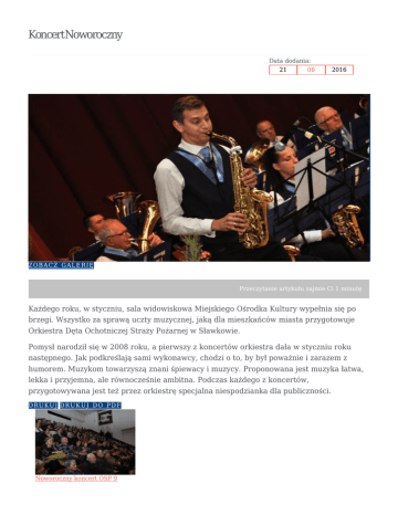 KoncertNoworoczny Data dodania: 21 06 2016 Z O BACZ GALE R IĘ Przeczytanie artykułu zajmie Ci 1 minutę Każdego roku, w styczniu, sala widowiskowa Miejskiego Ośrodka Kultury wypełnia się po brzegi. Wszystko za sprawą uczty muzycznej, jaką dla mieszkańców miasta przygotowuje Orkiestra Dęta Ochotniczej Straży Pożarnej w Sławkowie. Pomysł narodził się w 2008 roku, a pierwszy z koncertów orkiestra dała w styczniu roku następnego. Jak podkreślają sami wykonawcy, chodzi o to, by był poważnie i zarazem z humorem. Muzykom towarzyszą znani śpiewacy i muzycy. Proponowana jest muzyka łatwa, lekka i przyjemna, ale równocześnie ambitna. Podczas każdego z koncertów, przygotowywana jest też przez orkiestrę specjalna niespodzianka dla publiczności. D R U KUJ D RUKUJ DO PDF Noworoczny koncert OSP 9 stycznia http://www.slawkow.pl/print.php?pdf=true&unique=koncert-noworoczny&lang=oc