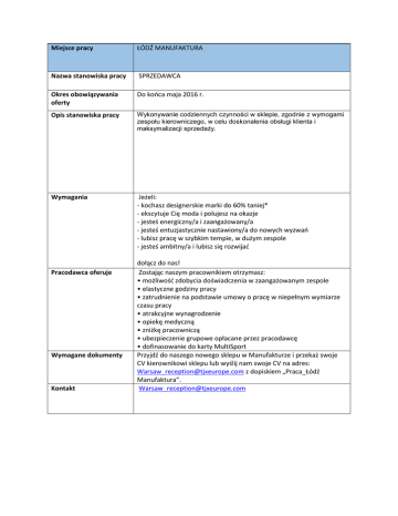 Miejsce pracy ŁÓDŹ MANUFAKTURA Nazwa stanowiska pracy