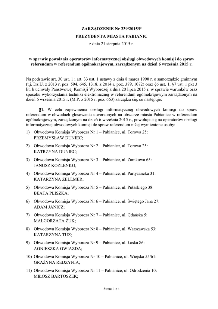 ZARZĄDZENIE Nr 239/2015/P PREZYDENTA MIASTA PABIANIC z dnia 21 sierpnia 2015 r. w sprawie powołania operatorów informatycznej obsługi obwodowych komisji do spraw referendum w referendum ogólnokrajowym, zarządzonym na dzień 6 września 2015 r. Na podstawie art. 30 ust. 1 i art. 33 ust. 1 ustawy z dnia 8 marca 1990 r. o samorządzie gminnym (t.j. Dz.U. z 2013 r. poz. 594, 645, 1318, z 2014 r. poz. 379, 1072) oraz §6 ust. 1, §7 ust. 1 pkt 3 lit. b uchwały Państwowej Komisji Wyborczej z dnia 20 lipca 2015 r. w sprawie warunków oraz sposobu wykorzystania techniki elektronicznej w referendum ogólnokrajowym zarządzonym na dzień 6 września 2015 r. (M.P. z 2015 r. poz. 663) zarządza się, co następuje: §1. W celu zapewnienia obsługi informatycznej obwodowych komisji do spraw referendum w obwodach głosowania utworzonych na obszarze miasta Pabianice w referendum ogólnokrajowym, zarządzonym na dzień 6 września 2015 r., powołuje się na operatorów obsługi informatycznej obwodowych komisji do spraw referendum niżej wymienione osoby: 1) Obwodowa Komisja Wyborcza Nr 1 – Pabianice, ul. Torowa 25: PRZEMYSŁAW DUNIEC; 2) Obwodowa Komisja Wyborcza Nr 2 – Pabianice, ul. Torowa 25: KATRZYNA DUNIEC; 3) Obwodowa Komisja Wyborcza Nr 3 – Pabianice, ul. Zamkowa 65: JANUSZ KOŹLENKO; 4) Obwodowa Komisja Wyborcza Nr 4 – Pabianice, ul. Partyzancka 31: KATARZYNA ZELLMER; 5) Obwodowa Komisja Wyborcza Nr 5 – Pabianice, ul. Pułaskiego 38: BEATA PLISZKA; 6) Obwodowa Komisja Wyborcza Nr 6 – Pabianice, ul. Świętego Jana 27: ADAM JANICZ; 7) Obwodowa Komisja Wyborcza Nr 7 – Pabianice, ul. Gdańska 5: MAŁGORZATA ŻUK; 8) Obwodowa Komisja Wyborcza Nr 8 – Pabianice, ul. Warszawska 53: KATARZYNA TUZ; 9) Obwodowa Komisja Wyborcza Nr 9 – Pabianice, ul. Łaska 86: AGNIESZKA GWIAZDA; 10) Obwodowa Komisja Wyborcza Nr 10 – Pabianice, ul. Wiejska 55/61: GRAŻYNA REDZYNIA; 11) Obwodowa Komisja Wyborcza Nr 11 – Pabianice, ul. Odrodzenia 10: MIŁOSZ BARTOSZEK; Strona 1 z 4 12) Obwodowa Komisja Wyborcza Nr 12 – Pabianice, ul. Moniuszki 132: JAROSŁAW SMOLAREK; 13) Obwodowa Komisja Wyborcza Nr 13 – Pabianice, ul. Ostatnia 15a: ANNA SZYMAŃSKA; 14) Obwodowa Komisja Wyborcza Nr 14 – Pabianice, ul. Tkacka 15: JAROSŁAW WLAŹLAK; 15) Obwodowa Komisja Wyborcza Nr 15 – Pabianice, ul. Zamkowa 65: DARIUSZ SAUTER; 16) Obwodowa Komisja Wyborcza Nr 16 – Pabianice, ul. Zamkowa 48: PATRYCJA PAWLAK; 17) Obwodowa Komisja Wyborcza Nr 17 – Pabianice, ul. Skłodowskiej-Curie 5: PAWEŁ LEWICKI; 18) Obwodowa Komisja Wyborcza Nr 18 – Pabianice, ul. Skłodowskiej-Curie 5: RYSZARD ZAPART; 19) Obwodowa Komisja Wyborcza Nr 19 – Pabianice, ul. Kościuszki 14: SYLWESTER JAGUDZKI; 20) Obwodowa Komisja Wyborcza Nr 20 – Pabianice, ul. Kilińskiego 8a: MAŁGORZATA KACZMAREK; 21) Obwodowa Komisja Wyborcza Nr 21 – Pabianice, ul. Piotra Skargi 70: ARKADIUSZ AGATA; 22) Obwodowa Komisja Wyborcza Nr 22 – Pabianice, ul. Warszawska 65: MIROSŁAWA DĄBROWSKA; 23) Obwodowa Komisja Wyborcza Nr 23 – Pabianice, ul. Warszawska 65: RENATA WIŚNIEWSKA-KOCIOŁEK; 24) Obwodowa Komisja Wyborcza Nr 24 – Pabianice, ul. Mokra 28/34: MARTA PLUCIŃSKA; 25) Obwodowa Komisja Wyborcza Nr 25 – Pabianice, ul. Wileńska 61: JOANNA ROZWENS; 26) Obwodowa Komisja Wyborcza Nr 26 – Pabianice, ul. Śniadeckiego 6a: KATARZYNA DURAJSKA; 27) Obwodowa Komisja Wyborcza Nr 27 – Pabianice, ul. Orla 45: MONIKA MAKSYMOWICZ; 28) Obwodowa Komisja Wyborcza Nr 28 – Pabianice, ul. Cicha 26: MICHAŁ NOWAK; 29) Obwodowa Komisja Wyborcza Nr 29 – Pabianice, ul. Jana Pawła II 16: ANNA KRAUZOWICZ; 30) Obwodowa Komisja Wyborcza Nr 30 – Pabianice, ul. Jana Pawła II 16: PIOTR BINKOWSKI; Strona 2 z 4 31) Obwodowa Komisja Wyborcza Nr 31 – Pabianice, ul. Orla 1: BARTŁOMIEJ NOWAK; 32) Obwodowa Komisja Wyborcza Nr 32 – Pabianice, ul. Mokra 28/34: ANNA BUJACZ; 33) Obwodowa Komisja Wyborcza Nr 33 – Pabianice, ul. Bugaj 58: DANIEL DURAJ; 34) Obwodowa Komisja Wyborcza Nr 34 – Pabianice, ul. Bugaj 58: PAULINA ADASIAK; 35) Obwodowa Komisja Wyborcza Nr 35 – Pabianice, ul. 20 Stycznia 9/13: ANNA BOROWSKA; 36) Obwodowa Komisja Wyborcza Nr 36 – Pabianice, ul. 20 Stycznia 9/13: IZABELA RUSZER; 37) Obwodowa Komisja Wyborcza Nr 37 – Pabianice, ul. 20 Stycznia 9/13: GRAŻYNA ROSIAK; 38) Obwodowa Komisja Wyborcza Nr 38 – Pabianice, ul. 20 Stycznia 9/13: KRZYSZTOF ROSIAK; 39) Obwodowa Komisja Wyborcza Nr 39 – Pabianice, ul. Nawrockiego 24a: DOROTA FRONCZAK; 40) Obwodowa Komisja Wyborcza Nr 40 – Pabianice, ul. Mokra 28/34: AGNIESZKA KOŁODZIEJSKA; 41) Obwodowa Komisja Wyborcza Nr 41 – Pabianice, ul. Żytnia 13/17: BOGUSŁAWA MADAJ; 42) Obwodowa Komisja Wyborcza Nr 42 – Pabianice, ul. Stefana Grota Roweckiego 18a: PAWEŁ ZYCH; 43) Obwodowa Komisja Wyborcza Nr 43 – Pabianice, ul. Mokra 28/34: AGNIESZKA JABŁOŃSKA; 44) Obwodowa Komisja Wyborcza Nr 44 – Pabianice, ul. Mokra 28/34: KAMILA SZCZEGODZIŃSKA; 45) Obwodowa Komisja Wyborcza Nr 45 – Pabianice, ul. Mokra 19/23: ALEKSANDRA RĘKORAJSKA; 46) Obwodowa Komisja Wyborcza Nr 46 – Pabianice, ul. Mokra 19/23: DOROTA KOZIARA; 47) Obwodowa Komisja Wyborcza Nr 47 – Pabianice, ul. Jana Pawła II 68: RENATA ANDZIAK; 48) Obwodowa Komisja Wyborcza Nr 48 – Pabianice, ul. Wiejska 55/61: MARIA BANACH; 49) Obwodowa Komisja Wyborcza Nr 49 – Pabianice, ul. Łaska 86: BOŻENA BUKOWSKA. Strona 3 z 4 §2. Do zadań operatora informatycznej obsługi obwodowej komisji wyborczej należy w szczególności: 1) udział w szkoleniu organizowanym przez koordynatora gminnego; 2) udział w wyznaczonych terminach w testach ogólnokrajowych obejmujących wprowadzenie testowych wyników głosowania w zakresie obsługiwanych obwodów głosowania oraz przesłanie danych za pośrednictwem sieci publicznej lub w przypadku braku dostępu do sieci publicznej przekazanie danych do pełnomocnika komisarza wyborczego w gminie w wyznaczonym terminie; 3) odbiór za potwierdzeniem loginu i hasła operatora do syste