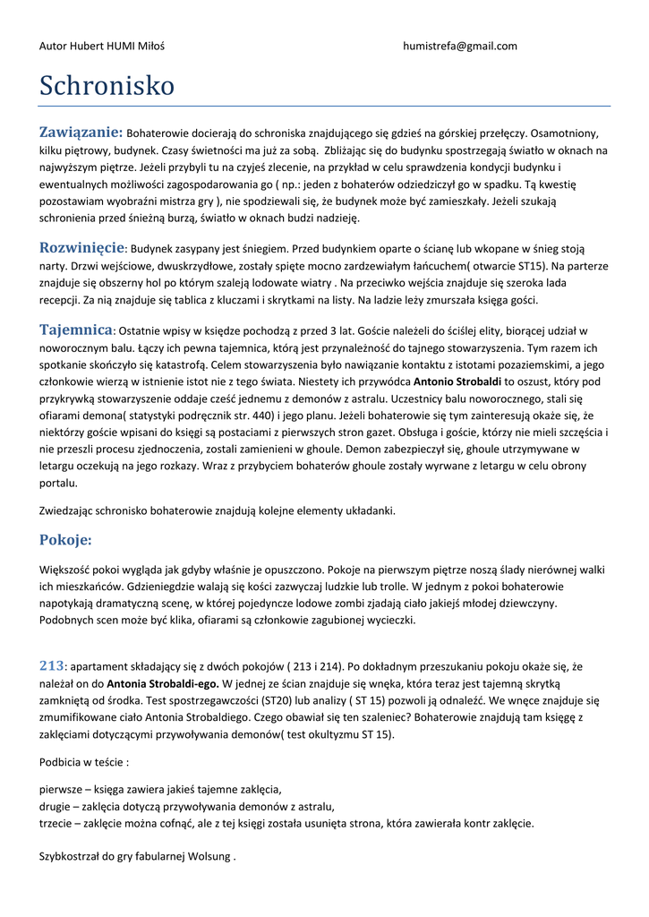 Autor Hubert HUMI Miłoś [email protected] Schronisko Zawiązanie: Bohaterowie docierają do schroniska znajdującego się gdzieś na górskiej przełęczy. Osamotniony, kilku piętrowy, budynek. Czasy świetności ma już za sobą. Zbliżając się do budynku spostrzegają światło w oknach na najwyższym piętrze. Jeżeli przybyli tu na czyjeś zlecenie, na przykład w celu sprawdzenia kondycji budynku i ewentualnych możliwości zagospodarowania go ( np.: jeden z bohaterów odziedziczył go w spadku. Tą kwestię pozostawiam wyobraźni mistrza gry ), nie spodziewali się, że budynek może byd zamieszkały. Jeżeli szukają schronienia przed śnieżną burzą, światło w oknach budzi nadzieję. Rozwinięcie: Budynek zasypany jest śniegiem. Przed budynkiem oparte o ścianę lub wkopane w śnieg stoją narty. Drzwi wejściowe, dwuskrzydłowe, zostały spięte mocno zardzewiałym łaocuchem( otwarcie ST15). Na parterze znajduje się obszerny hol po którym szaleją lodowate wiatry . Na przeciwko wejścia znajduje się szeroka lada recepcji. Za nią znajduje się tablica z kluczami i skrytkami na listy. Na ladzie leży zmurszała księga gości. Tajemnica: Ostatnie wpisy w księdze pochodzą z przed 3 lat. Goście należeli do ściślej elity, biorącej udział w noworocznym balu. Łączy ich pewna tajemnica, którą jest przynależnośd do tajnego stowarzyszenia. Tym razem ich spotkanie skooczyło się katastrofą. Celem stowarzyszenia było nawiązanie kontaktu z istotami pozaziemskimi, a jego członkowie wierzą w istnienie istot nie z tego świata. Niestety ich przywódca Antonio Strobaldi to oszust, który pod przykrywką stowarzyszenie oddaje cześd jednemu z demonów z astralu. Uczestnicy balu noworocznego, stali się ofiarami demona( statystyki podręcznik str. 440) i jego planu. Jeżeli bohaterowie się tym zainteresują okaże się, że niektórzy goście wpisani do księgi są postaciami z pierwszych stron gazet. Obsługa i goście, którzy nie mieli szczęścia i nie przeszli procesu zjednoczenia, zostali zamienieni w ghoule. Demon zabezpieczył się, ghoule utrzymywane w letargu oczekują na jego rozkazy. Wraz z przybyciem bohaterów ghoule zostały wyrwane z letargu w celu obrony portalu. Zwiedzając schronisko bohaterowie znajdują kolejne elementy układanki. Pokoje: Większośd pokoi wygląda jak gdyby właśnie je opuszczono. Pokoje na pierwszym piętrze noszą ślady nierównej walki ich mieszkaoców. Gdzieniegdzie walają się kości zazwyczaj ludzkie lub trolle. W jednym z pokoi bohaterowie napotykają dramatyczną scenę, w której pojedyncze lodowe zombi zjadają ciało jakiejś młodej dziewczyny. Podobnych scen może byd klika, ofiarami są członkowie zagubionej wycieczki. 213: apartament składający się z dwóch pokojów ( 213 i 214). Po dokładnym przeszukaniu pokoju okaże się, że należał on do Antonia Strobaldi-ego. W jednej ze ścian znajduje się wnęka, która teraz jest tajemną skrytką zamkniętą od środka. Test spostrzegawczości (ST20) lub analizy ( ST 15) pozwoli ją odnaleźd. We wnęce znajduje się zmumifikowane ciało Antonia Strobaldiego. Czego obawiał się ten szaleniec? Bohaterowie znajdują tam księgę z zaklęciami dotyczącymi przywoływania demonów( test okultyzmu ST 15). Podbicia w teście : pierwsze – księga zawiera jakieś tajemne zaklęcia, drugie – zaklęcia dotyczą przywoływania demonów z astralu, trzecie – zaklęcie można cofnąd, ale z tej księgi została usunięta strona, która zawierała kontr zaklęcie. Szybkostrzał do gry fabularnej Wolsung . Autor Hubert HUMI Miłoś [email protected] 106: duży jedno pokojowy apartament. Na ścianie apartamentu ktoś wymalował symbole, które są częścią zaklęcia pozwalającego na zamknięcie portalu ( okultyzm ST, 25 jeżeli bohaterowie wcześniej znaleźli księgę to test wynosi ST 20). 405: pokój na poddaszu. To tutaj pali się lampa maniaczna, której światło widzieli bohaterowie. W pokoju znajdują się zmumifikowane ciała, jak gdyby zastygłe w bezruchu. Siedzą wokół okrągłego stołu na którym wymalowano symbole podobne do tych w książce. Ubrania okrywające ich wysuszone ciał sprawiają, że widok jest piorunujący. Klika miejsc przy stole jest pustych. To tutaj odbył się rytuał zjednoczenia, brali w nim udział tylko nieliczni wtajemniczeni członkowie towarzystwa, lecz nie wszyscy go przetrwali. Demon wybrał tylko nielicznych, najbardziej wartościowych. Reszta z nich została przemieniona w ghoule. Piwnica: W piwnicy znajduje się skomplikowana maszyneria, która uruchamia portal znajdujący się na zapleczu recepcji. Mechanizm pracuje według zaprogramowanego cyklu. Zawsze o 1 w nocy uruchamia portal, przez który ta kilka godzin powracają ci, którzy nie przetrwali testu. W tym czasie wielka sala balowa, która znajduje się na 3 piętrze rozbrzmiewa muzyką a upiorne istoty taoczą na balu noworocznym. Piwnica jest zabezpieczona czarem (sceneria "Arktyka" PG 313-314). Tutaj śpią w letargu ghoule (Lodowe Ghoule ("Operacja Wotan" str. 107). Jest tu przeraźliwie zimno, wejście do niej powoduje automatyczne obniżenie wytrwałości o 4 pkt ( jednak wytrwałośd nie spada poniżej 10 opcjonalnie można zastosowad zasadę że nawet po wyjściu z piwnicy aby odzyskad bonus z kondycji do wytrwałości należy zjeśd ciepły posiłek lub rozgrzad się buteleczką czegoś mocniejszego). Zasypana śniegiem , śliska podłoga i pokryte lodem ściany powodują, że każdy nieudany atak w walce wręcz wymusza test (wysportowania ST 10) nieudany test powoduje upadek. Osoby posiadające na ręce karty kier i karo co najmniej 10 zdaje test automatycznie. Cele: - Celem bohaterów jest oczyszczenie schroniska z ghouli i zombi . - Zniszczenie lub zamknięcie portalu. - Pokonanie demona. Ten cel jest raczej nie realny do zrealizowania. Demon w razie widocznej przegrane ucieknie do portalu. To nie jest jedyne okno do tego świata, w którym jest