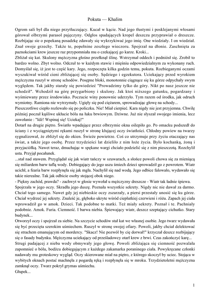 Pokuta — Khalim Ogrom sali był dla niego przytłaczający. Kucał w kącie. Nad jego tłustymi i posklejanymi włosami górował olbrzymi parasol pajęczyny. Odgłos spadających kropel deszczu przyprawiał o dreszcze. Rozbijając sie o popekaną posadzkę zdawały się wykrzykiwać jego imię. One wiedziały. I on wiedział. Znał swoje grzechy. Także te, popełnine zeszłego wieczoru. Spojrzał na dłonie. Zaschnięta za paznokciami krew jeszcze raz przypomniała mu o czekającej go karze. Kroki... Zbliżał się kat. Skulony mężczyzna głośno przełknął ślinę. Wstrzymał oddech i podniósł się. Zrobił to bardzo wolno. Zbyt wolno. Odczuł to w każdym stawie i mięśniu odpowiedzialnym za wykonany ruch. Domyślał się, iż jest to część kary. Jego, rozpoczęta kilka godzin temu, pokuta. Rozbieganymi oczami wyszukiwał wśród cieni zbliżającej się osoby. Sędziego i egzekutora. Uciekający przed wyrokiem mężczyzna ruszył w stronę schodów. Posępne bloki, monotonnie ciągnące się ku górze odpychały swym wyględem. Tak jakby starały się powiedzieć "Prowadzimy tylko do góry. Nikt po nasz jeszcze nie schodził". Wchodził na górę przygarbiony i skulony. Jak ktoś niższego gatunku, pogardzany i wyśmiewany przez środowisko. Poczucie winy ponownie uderzyło. Tym razem od środka, jak odruch wymiotny. Ramiona nie wytrzymały. Ugięły się pod ciężarem, sprowadzając głowę na schody... Pieszczotliwe ciepło rozlewało się po policzku. Nie! Miał cierpieć. Kara nigdy nie jest przyjemna. Chwilę później poczuł kąśliwe ukłucie bólu na łuku brwiowym. Dziwne. Już nie słyszał swojego imienia, lecz zawołanie : "Idź! Wspinaj się! Uciekaj!" Dotarł na drugie piętro. Światło wpadające przez olbrzymie okna oślepiło go. Po omacku podszedł do ściany i z wyciągniętymi rękami ruszył w stronę kłującej oczy światłości. Chłodny powiew na twarzy sygnalizował, że zbliżył się do okien. Świeże powietrze. Coś co utrzymuje przy życiu otaczający nas świat, a także jego osobę. Przez trzydzieści lat dzieliło z nim łoże życia. Było kochanką, żoną i przyjaciółką. Nawet teraz, dmuchając w spękane wargi chciało podzielić się z nim pieszczotą. Rozchylił usta. Przyjął pocałunek. ...stał nad stawem. Przyglądał się jak wiatr tańczy w szuwarach, a słońce powoli chowa się za mieniącą się miliardem barw taflą wody. Dobiegający do jego uszu śmiech dzieci sprowadził go z powrotem. Wiatr ucichł, a fearia barw rozpłynęła się jak mgła. Nachylił się nad wodą. Jego odbice falowało, wydawało się takie nierealne. Tak jak odbicie osoby stojącej obok niego. - Piękny zachód, prawda? - zachwyt w głosie wywołał u mężczyzny dreszcze - Wiatr tak ładnie śpiewa. Spojrzała w jego oczy. Skradła jego duszę. Poznała wszystkie sekrety. Nigdy nic nie dawał za darmo. Chciał tego samego. Nawet gdy jej niebieskie oczy zszarzały, a piersi przestały unosić się ku górze. Chciał wydrzeć jej sekrety. Znaleść je, głęboko ukryte wśród cieplutkiej czerwieni i różu. Zapach jej ciała wprowadził go w amok. Dzieci. Tak podobne to matki. Też miały sekrety. Poznał i te. Pachniały podobnie. Amok. Furia. Ciemność. I barwa niebia. Śpiewający wiatr, deszcz szeptający cichutko. Stary budynek... Otworzył oczy i spojrzał za siebie. Na szczycie schodów stał kat we własnej osobie. Jego twarz wydawała się być przecięta szerokim uśmiechem. Ruszył w stronę swojej ofiary. Powoli, jakby chciał delektować się strachem emanującym od mordercy. "Skacz! Nie pozwól by cię dorwał!" krzyczał deszcz rozbijający się o fasady budynku. Mężczyzna uciekający od prześladowcy otarł krew z brwi. Czas zakończyć karę... Strugi padającej z nieba wody obmywały jego głowę. Powoli zbliżająca się ciemność pozwalała zapomnieć o bólu, bodźcu dobiegającym z każdego zakamarka poraninego ciała. Powykręcane członki nadawały mu groteskowy wygląd. Oczy skierowane miał na piętro, z którego skoczył by uciec. Stojąca w wybitych oknach postać machnęła z pogardą ręką i rozpłynęła się w mroku. Trzydzietoletni mężczyzna zamknął oczy. Twarz pokrył grymas uśmiechu. Głupek... 1 To słowo po wieki będzie szumieć w martwym umyśle mordercy. Kopiowanie tekstów, obrazów i wszelakiej twórczości użytkowników portalu bez ich zgody jest stanowczo zabronione. (Ustawa o prawie autorskim i prawach pokrewnych, Dz.U. 1994 nr 24 poz. 83 z dnia 4 lutego 1994r.). Khalim, dodano 21.05.2006 22:32 Dokument został wygenerowany przez www.portal-pisarski.pl. 2