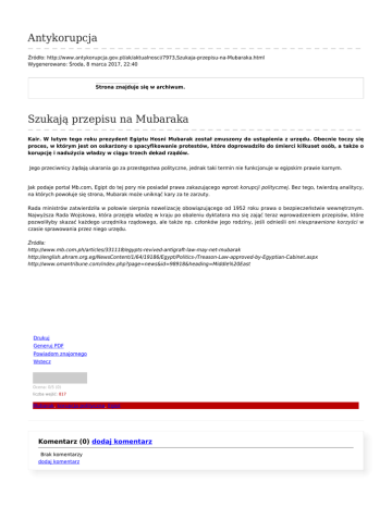 Antykorupcja Źródło: http://www.antykorupcja.gov.pl/ak/aktualnosci/7973,Szukaja-przepisu-na-Mubaraka.html Wygenerowano: Środa, 8 marca 2017, 22:40 Strona znajduje się w archiwum. Szukają przepisu na Mubaraka Kair. W lutym tego roku prezydent Egiptu Hosni Mubarak został zmuszony do ustąpienia z urzędu. Obecnie toczy się proces, w którym jest on oskarżony o spacyfikowanie protestów, które doprowadziło do śmierci kilkuset osób, a także o korupcję i nadużycia władzy w ciągu trzech dekad rządów. Jego przeciwnicy żądają ukarania go za przestępstwa polityczne, jednak taki termin nie funkcjonuje w egipskim prawie karnym. Jak podaje portal Mb.com, Egipt do tej pory nie posiadał prawa zakazującego wprost korupcji politycznej. Bez tego, twierdzą analitycy, na których powołuje się strona, Mubarak może uniknąć kary za te zarzuty. Rada ministrów zatwierdziła w połowie sierpnia nowelizację obowiązującego od 1952 roku prawa o bezpieczeństwie wewnętrznym. Najwyższa Rada Wojskowa, która przejęła władzę w kraju po obaleniu dyktatora ma się zająć teraz wprowadzeniem przepisów, które pozwoliłyby skazać każdego urzędnika rządowego, ale także np. członków jego rodziny, jeśli odnieśli oni nieuprawnione korzyści w czasie sprawowania przez niego urzędu. Źródła: http://www.mb.com.ph/articles/331118/egypts-revived-antigraft-law-may-net-mubarak http://english.ahram.org.eg/NewsContent/1/64/19186/Egypt/Politics-/Treason-Law-approved-by-Egyptian-Cabinet.aspx http://www.omantribune.com/index.php?page=news&id=98918&heading=Middle%20East Drukuj Generuj PDF Powiadom znajomego Wstecz Ocena: 0/5 (0) liczba wejść: 817 Mubarak, korupcja polityczna, Egipt Komentarz (0) dodaj komentarz Brak komentarzy dodaj komentarz