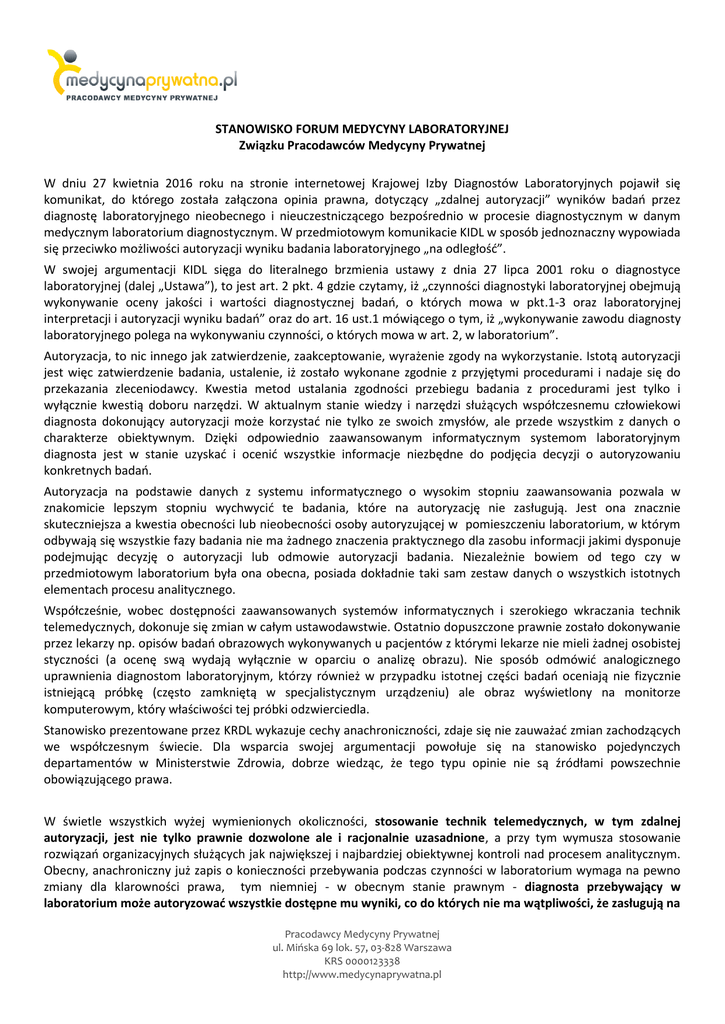 STANOWISKO FORUM MEDYCYNY LABORATORYJNEJ Związku Pracodawców Medycyny Prywatnej W dniu 27 kwietnia 2016 roku na stronie internetowej Krajowej Izby Diagnostów Laboratoryjnych pojawił się komunikat, do którego została załączona opinia prawna, dotyczący „zdalnej autoryzacji” wyników badań przez diagnostę laboratoryjnego nieobecnego i nieuczestniczącego bezpośrednio w procesie diagnostycznym w danym medycznym laboratorium diagnostycznym. W przedmiotowym komunikacie KIDL w sposób jednoznaczny wypowiada się przeciwko możliwości autoryzacji wyniku badania laboratoryjnego „na odległość”. W swojej argumentacji KIDL sięga do literalnego brzmienia ustawy z dnia 27 lipca 2001 roku o diagnostyce laboratoryjnej (dalej „Ustawa”), to jest art. 2 pkt. 4 gdzie czytamy, iż „czynności diagnostyki laboratoryjnej obejmują wykonywanie oceny jakości i wartości diagnostycznej badań, o których mowa w pkt.1-3 oraz laboratoryjnej interpretacji i autoryzacji wyniku badań” oraz do art. 16 ust.1 mówiącego o tym, iż „wykonywanie zawodu diagnosty laboratoryjnego polega na wykonywaniu czynności, o których mowa w art. 2, w laboratorium”. Autoryzacja, to nic innego jak zatwierdzenie, zaakceptowanie, wyrażenie zgody na wykorzystanie. Istotą autoryzacji jest więc zatwierdzenie badania, ustalenie, iż zostało wykonane zgodnie z przyjętymi procedurami i nadaje się do przekazania zleceniodawcy. Kwestia metod ustalania zgodności przebiegu badania z procedurami jest tylko i wyłącznie kwestią doboru narzędzi. W aktualnym stanie wiedzy i narzędzi służących współczesnemu człowiekowi diagnosta dokonujący autoryzacji może korzystać nie tylko ze swoich zmysłów, ale przede wszystkim z danych o charakterze obiektywnym. Dzięki odpowiednio zaawansowanym informatycznym systemom laboratoryjnym diagnosta jest w stanie uzyskać i ocenić wszystkie informacje niezbędne do podjęcia decyzji o autoryzowaniu konkretnych badań. Autoryzacja na podstawie danych z systemu informatycznego o wysokim stopniu zaawansowania pozwala w znakomicie lepszym stopniu wychwycić te badania, które na autoryzację nie zasługują. Jest ona znacznie skuteczniejsza a kwestia obecności lub nieobecności osoby autoryzującej w pomieszczeniu laboratorium, w którym odbywają się wszystkie fazy badania nie ma żadnego znaczenia praktycznego dla zasobu informacji jakimi dysponuje podejmując decyzję o autoryzacji lub odmowie autoryzacji badania. Niezależnie bowiem od tego czy w przedmiotowym laboratorium była ona obecna, posiada dokładnie taki sam zestaw danych o wszystkich istotnych elementach procesu analitycznego. Współcześnie, wobec dostępności zaawansowanych systemów informatycznych i szerokiego wkraczania technik telemedycznych, dokonuje się zmian w całym ustawodawstwie. Ostatnio dopuszczone prawnie zostało dokonywanie przez lekarzy np. opisów badań obrazowych wykonywanych u pacjentów z którymi lekarze nie mieli żadnej osobistej styczności (a ocenę swą wydają wyłącznie w oparciu o analizę obrazu). Nie sposób odmówić analogicznego uprawnienia diagnostom laboratoryjnym, którzy również w przypadku istotnej części badań oceniają nie fizycznie istniejącą próbkę (często zamkniętą w specjalistycznym urządzeniu) ale obraz wyświetlony na monitorze komputerowym, który właściwości tej próbki odzwierciedla. Stanowisko prezentowane przez KRDL wykazuje cechy anachroniczności, zdaje się nie zauważać zmian zachodzących we współczesnym świecie. Dla wsparcia swojej argumentacji powołuje się na stanowisko pojedynczych departamentów w Ministerstwie Zdrowia, dobrze wiedząc, że tego typu opinie nie są źródłami powszechnie obowiązującego prawa. W świetle wszystkich wyżej wymienionych okoliczności, stosowanie technik telemedycznych, w tym zdalnej autoryzacji, jest nie tylko prawnie dozwolone ale i racjonalnie uzasadnione, a przy tym wymusza stosowanie rozwiązań organizacyjnych służących jak największej i najbardziej obiektywnej kontroli nad procesem analitycznym. Obecny, anachroniczny już zapis o konieczności przebywania podczas czynności w laboratorium wymaga na pewno zmiany dla klarowności prawa, tym niemniej - w obecnym stanie prawnym - diagnosta przebywający w laboratorium może autoryzować wszystkie dostępne mu wyniki, co do których nie ma wątpliwości, że zasługują na Pracodawcy Medycyny Prywatnej ul. Mińska 69 lok. 57, 03-828 Warszawa KRS 0000123338 http://www.medycynaprywatna.pl autoryzowanie. Kwestie rozważane obecności przy próbce w momencie wykonywania czynności diagnostyki laboratoryjnej nie są regulowane przez żadne przepisy prawne. Forum Medycyny Laboratoryjnej: Alab laboratoria sp. z o.o., Centrum Diagnostyki Laboratoryjnej Sp. z o.o., Diagnostyka sp. z o.o., Synevo sp. z o.o., Synlab Sp. z o.o. Warszawa 16 maja 2016 Pracodawcy Medycyny Prywatnej ul. Mińska 69 lok. 57, 03-828 Warszawa KRS 0000123338 http://www.medycynaprywatna.pl