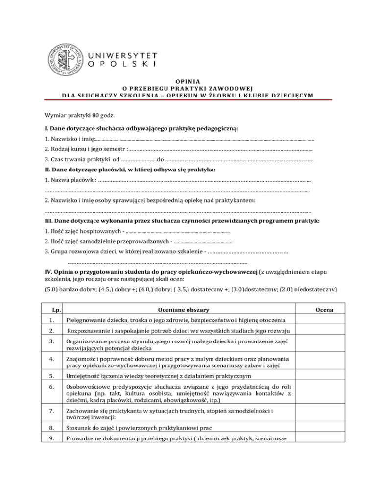 OPI N I A O PRZEBI EGU PRAK TYK I ZAWOD OWEJ D LA S ŁUCHACZY S ZK OLE N I A – OPI EK UN W ŻŁOBK U I K LUBI E D ZI ECI ĘCYM Wymiar praktyki 80 godz. I. Dane dotyczące słuchacza odbywającego praktykę pedagogiczną: 1. Nazwisko i imię:......................................................................................................................................................................... 2. Rodzaj kursu i jego semestr :………………………………………………………………………………………………….….. 3. Czas trwania praktyki od …………………..do …………………………………………………………………………………. II. Dane dotyczące placówki, w której odbywa się praktyka: 1. Nazwa placówki: ………………………………………………………………………………………………………….………….. ………………………………………………………………………………………………………………………………………….……….. 2. Nazwisko i imię osoby sprawującej bezpośrednią opiekę nad praktykantem: ……………………………………………………………………………………………………………………………..…………………….. III. Dane dotyczące wykonania przez słuchacza czynności przewidzianych programem praktyk: 1. Ilość zajęć hospitowanych - ................................................................................ 2. Ilość zajęć samodzielnie przeprowadzonych - ............................................. 3. Grupa rozwojowa dzieci, w której realizowano szkolenie - …………………………………………… …………………………………………………………………………………………………… IV. Opinia o przygotowaniu studenta do pracy opiekuńczo-wychowawczej (z uwzględnieniem etapu szkolenia, jego rodzaju oraz następującej skali ocen: (5.0) bardzo dobry; (4.5,) dobry +; (4.0,) dobry; ( 3.5,) dostateczny +; (3.0)dostateczny; (2.0) niedostateczny) Lp. Oceniane obszary 1. Pielęgnowanie dziecka, troska o jego zdrowie, bezpieczeństwo i higienę otoczenia 2. Rozpoznawanie i zaspokajanie potrzeb dzieci we wszystkich stadiach jego rozwoju 3. Organizowanie procesu stymulującego rozwój małego dziecka i prowadzenie zajęć rozwijających potencjał dziecka 4. Znajomość i poprawność doboru metod pracy z małym dzieckiem oraz planowania pracy opiekuńczo-wychowawczej i przygotowywania scenariuszy zabaw i zajęć 5. Umiejętność łączenia wiedzy teoretycznej z działaniem praktycznym 6. Osobowościowe predyspozycje słuchacza związane z jego przydatnością do roli opiekuna (np. takt, kultura osobista, umiejętność nawiązywania kontaktów z dziećmi, kadrą placówki, rodzicami, obowiązkowość, itp.) 7. Zachowanie się praktykanta w sytuacjach trudnych, stopień samodzielności i twórczej inwencji: 8. Stosunek do zajęć i powierzonych praktykantowi prac 9. Prowadzenie dokumentacji przebiegu praktyki ( dzienniczek praktyk, scenariusze Ocena zabaw i zajęć, itp.) 10. Ocena ogólna z szkolenia praktycznego V.: Opisowe uzupełnienie opinii: ………………………………………………………………………………………………………………………………………… ………………………………………………………………………………………………………………………………………… ………………………………………………………………………………………………………………………………………… ………………………………………………………………………………………………………………………………………… ………………………………………………………………………………………………………………………………………… ………………………………………………………………………………………………………………………………………… ………………………………………………………………………………………………………………………………………… ………………………………………………………………………………………………………………………………………… ………………………………………………………………………………………………………………………………………… ………………………………………………………………………………………………………………………………………… ………………………………………………………………………………………………………………………………………… ………………………………………………………………………………………………………………………………………… ………………………………………………………………………………………………………………………………………… ………………………………………………………………………………………………………………………………………… ………………………………………………………………………………………………………………………………………… ………………………………………………………………………………………………………………………………………… ………………………………………………………………………………………………………………………………………… ………………………………………………………
