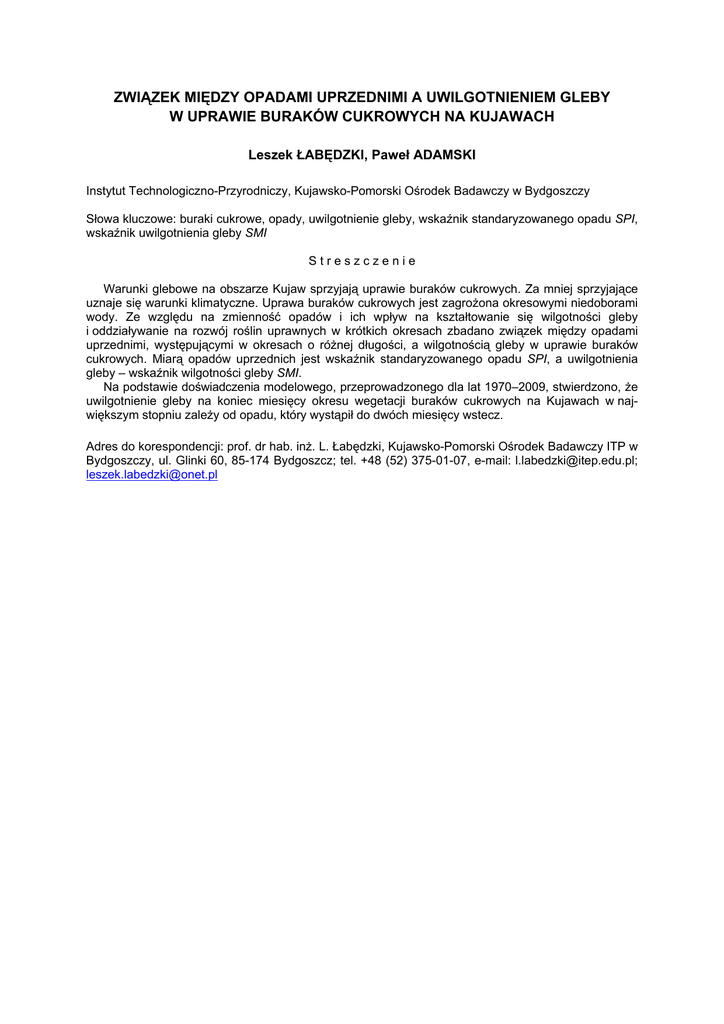 ZWIĄZEK MIĘDZY OPADAMI UPRZEDNIMI A UWILGOTNIENIEM GLEBY W UPRAWIE BURAKÓW CUKROWYCH NA KUJAWACH Leszek ŁABĘDZKI, Paweł ADAMSKI Instytut Technologiczno-Przyrodniczy, Kujawsko-Pomorski Ośrodek Badawczy w Bydgoszczy Słowa kluczowe: buraki cukrowe, opady, uwilgotnienie gleby, wskaźnik standaryzowanego opadu SPI, wskaźnik uwilgotnienia gleby SMI Streszczenie Warunki glebowe na obszarze Kujaw sprzyjają uprawie buraków cukrowych. Za mniej sprzyjające uznaje się warunki klimatyczne. Uprawa buraków cukrowych jest zagrożona okresowymi niedoborami wody. Ze względu na zmienność opadów i ich wpływ na kształtowanie się wilgotności gleby i oddziaływanie na rozwój roślin uprawnych w krótkich okresach zbadano związek między opadami uprzednimi, występującymi w okresach o różnej długości, a wilgotnością gleby w uprawie buraków cukrowych. Miarą opadów uprzednich jest wskaźnik standaryzowanego opadu SPI, a uwilgotnienia gleby – wskaźnik wilgotności gleby SMI. Na podstawie doświadczenia modelowego, przeprowadzonego dla lat 1970–2009, stwierdzono, że uwilgotnienie gleby na koniec miesięcy okresu wegetacji buraków cukrowych na Kujawach w największym stopniu zależy od opadu, który wystąpił do dwóch miesięcy wstecz. Adres do korespondencji: prof. dr hab. inż. L. Łabędzki, Kujawsko-Pomorski Ośrodek Badawczy ITP w Bydgoszczy, ul. Glinki 60, 85-174 Bydgoszcz; tel. +48 (52) 375-01-07, e-mail: [email protected]; [email protected] Leszek ŁABĘDZKI, Paweł ADAMSKI RELATIONSHIP BETWEEN PREVIOUS-PERIOD PRECIPITATION AND SOIL MOISTURE UNDER SUGAR BEET IN KUJAWY REGION Instytut Technologiczno-Przyrodniczy, Kujawsko-Pomorski Ośrodek Badawczy w Bydgoszczy Key words: precipitation, soil moisture, soil moisture index SMI, standardized precipitation index SPI, sugar beet Summary Soils conditions are favourable to growing sugar beet in Kujawy region. Climatic conditions are less favourable. Sugar beet cultivation is threatened by periodic water deficits. For temporal variability of precipitation and its influence on soil moisture and crop development, the relationship between precipitation occurring in the preceding period of different duration and soil moisture under sugar beet is examined in the paper. Standardized precipitation index SPI is a measure of previous-period precipitation and soil moisture index SMI is a measure of soil moisture. On the basis of the model experiment performed for 1970–2009, it has been proved that soil moisture at the end of the months in the growing period of sugar beet in Kujawy region is mostly influenced by precipitation in the preceding two months. Adres do korespondencji: prof. dr hab. inż. L. Łabędzki, Kujawsko-Pomorski Ośrodek Badawczy ITP w Bydgoszczy, ul. Glinki 60, 85-174 Bydgoszcz; tel. +48 (52) 375-01-07, e-mail: [email protected]; [email protected]